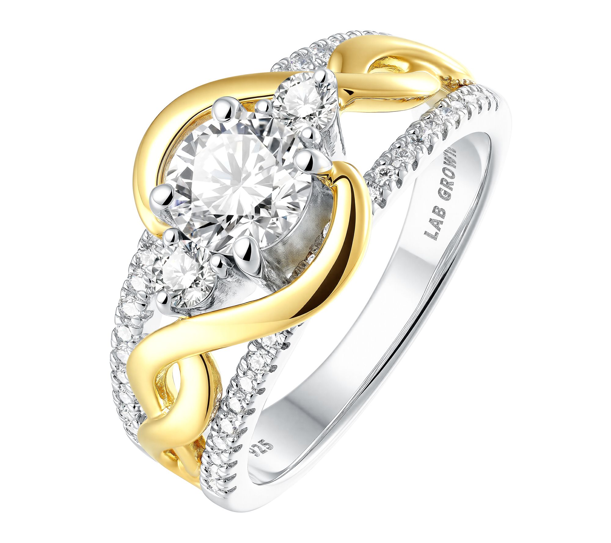 Make a statement whenever you walk into the room with this stunning two-tone ring. Sparkling round-cut lab-grown diamonds shimmer across every angle, while a mix of sterling silver and 14K gold-plated sterling silver accents enhance the openwork split shank design. This sophisticated piece instantly elevates everything from weekday suiting to your favorite evening look. From Fire Light Lab Grown Diamond Jewelry.