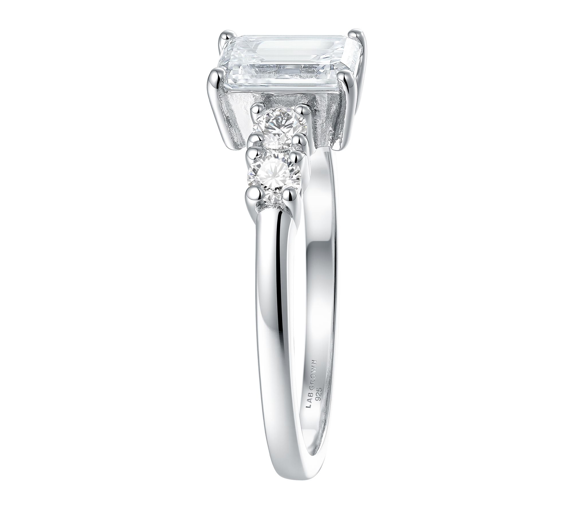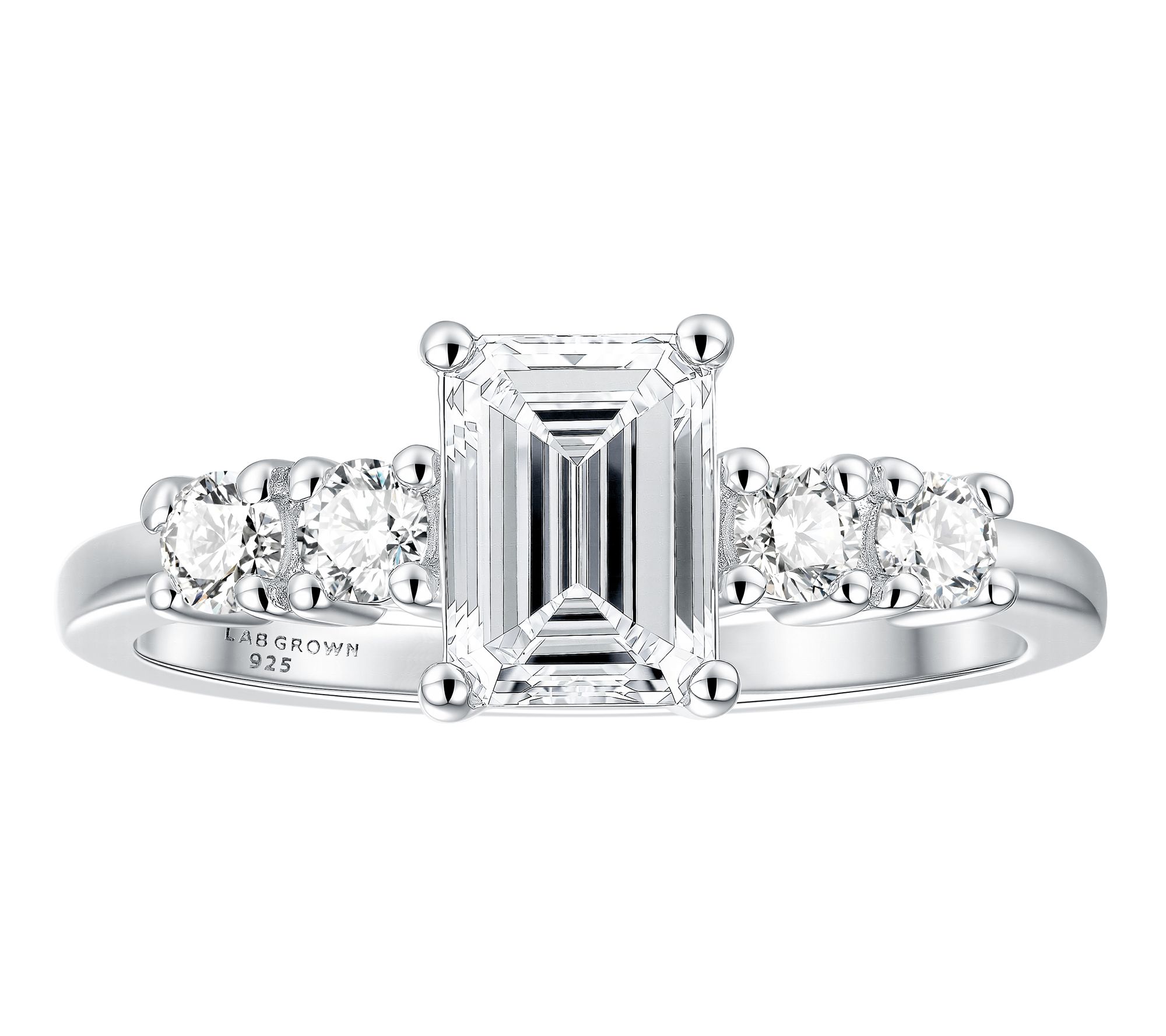 • Five lab-grown diamond design with prong-set emerald-cut and round-cut lab-grown diamonds; engagement ring style