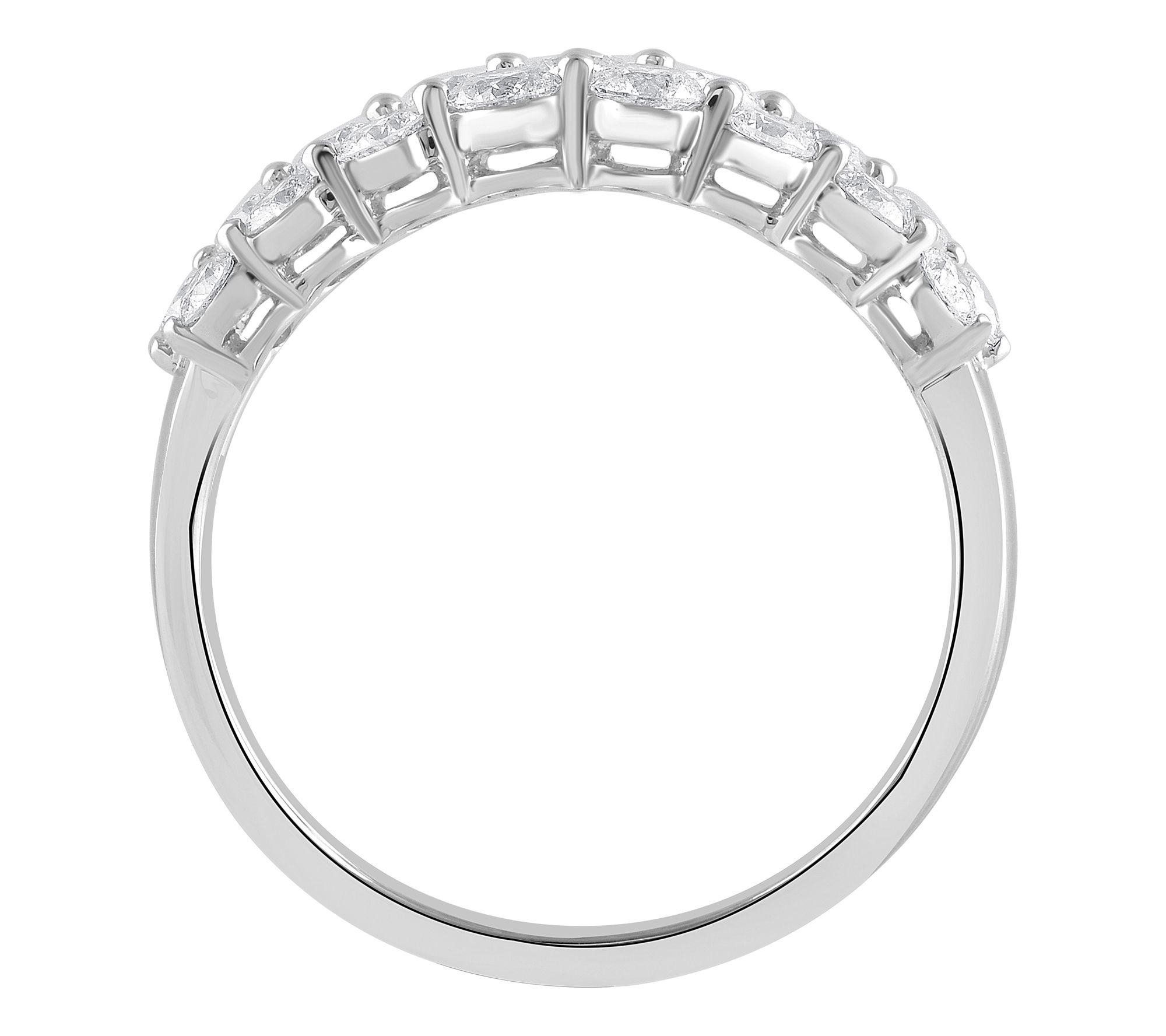 • Wide band; round-cut, prong-set lab-grown diamonds; polished finish