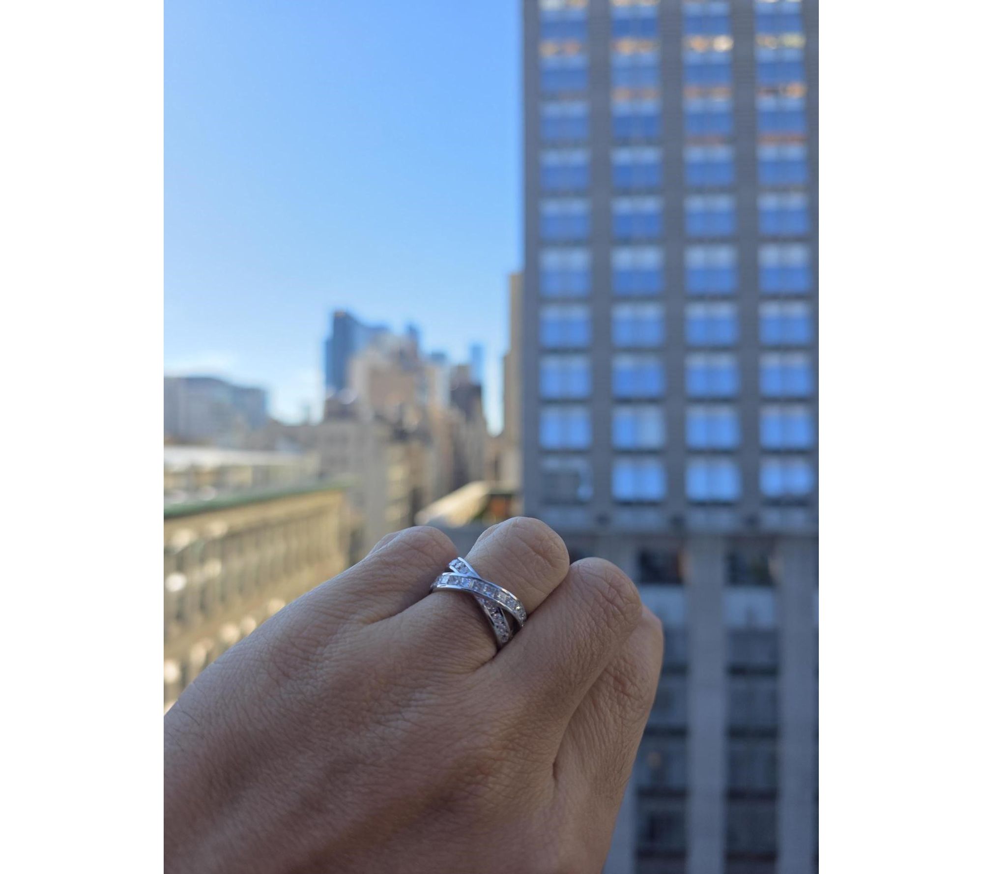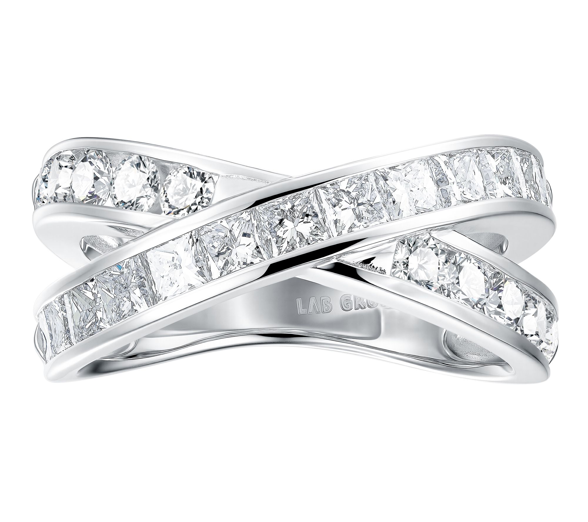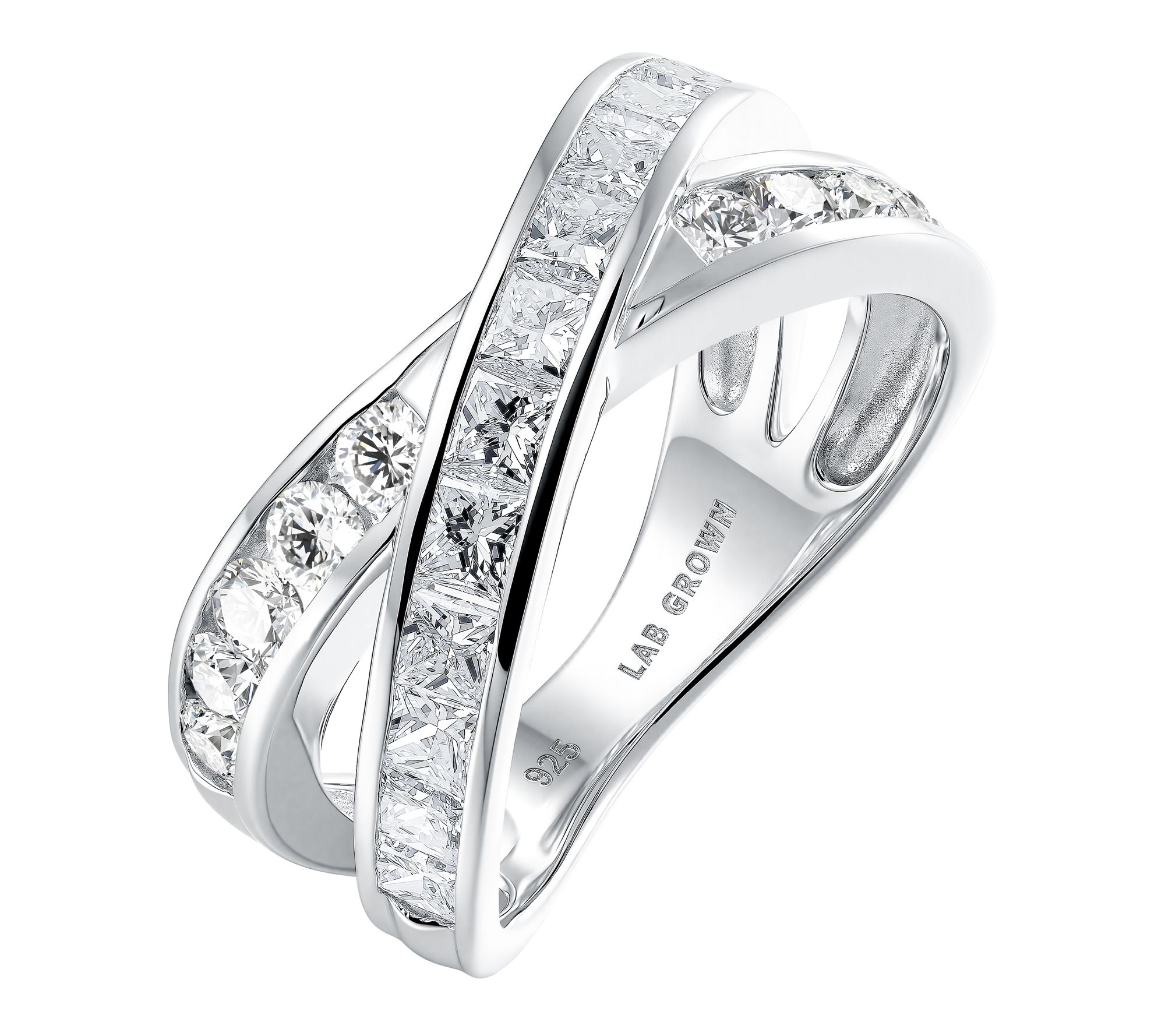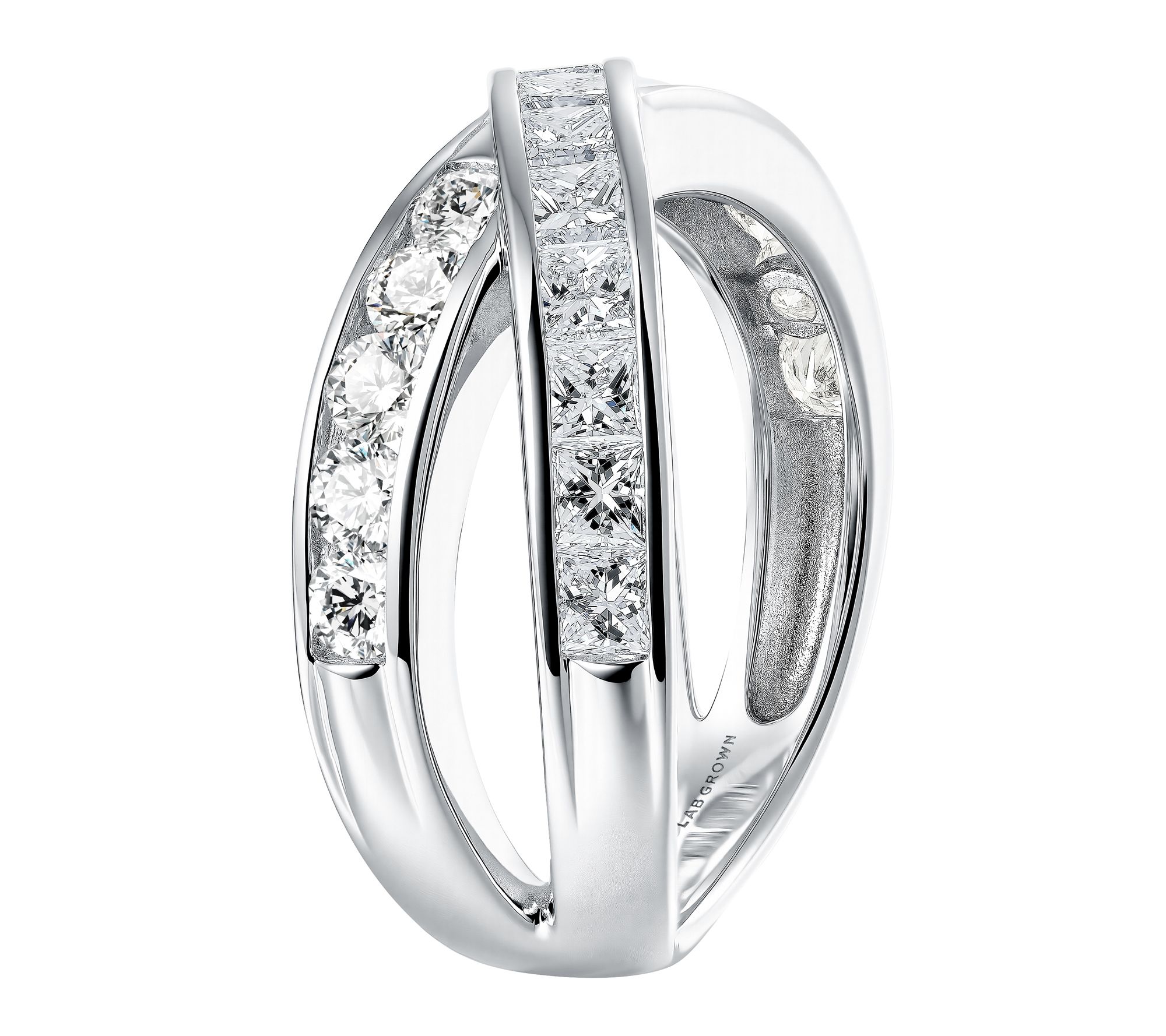 • Tension-set round and invisible-set princess-cut lab-grown diamonds; bypass split shank design; polished finish