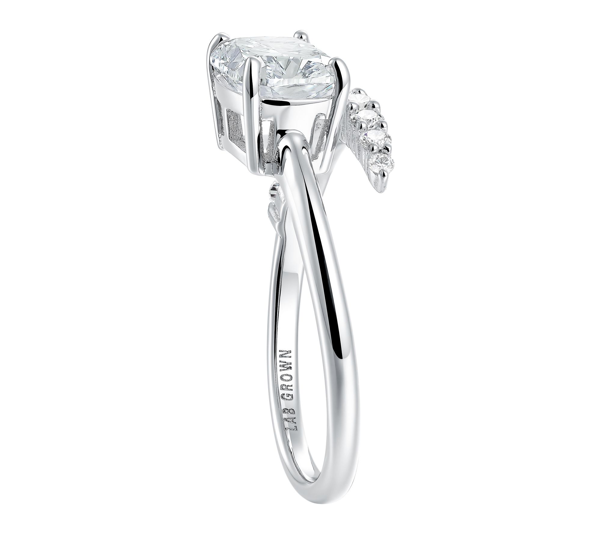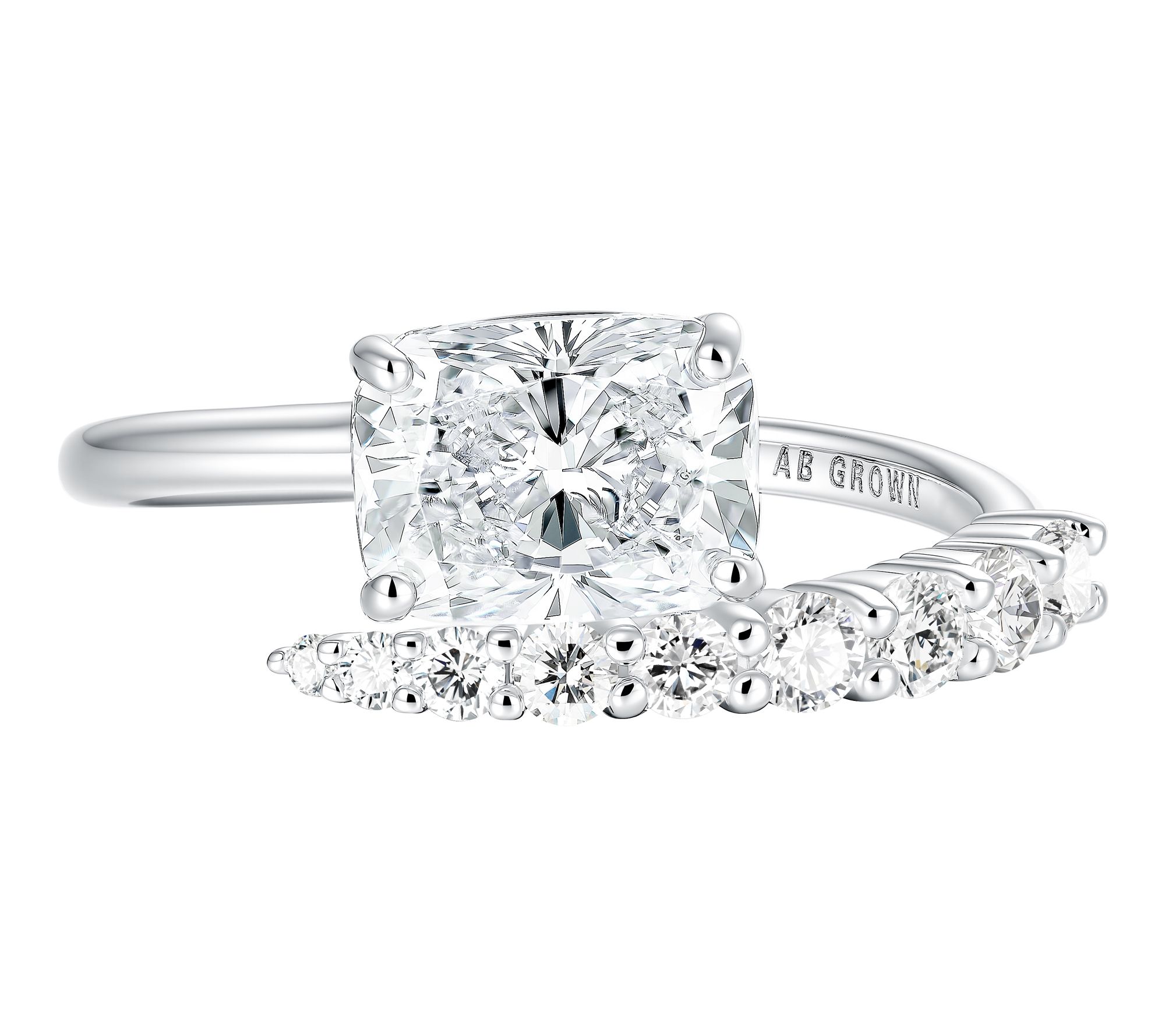 Prong-set cushion lab-grown diamond center with round-cut graduated shank lab-grown diamond spiral design; bypass style