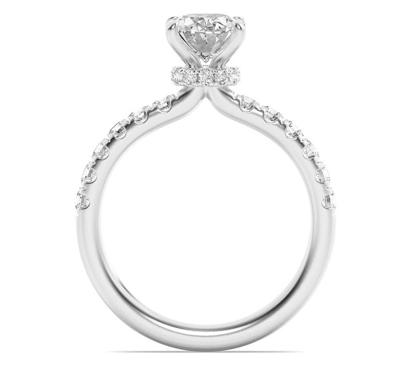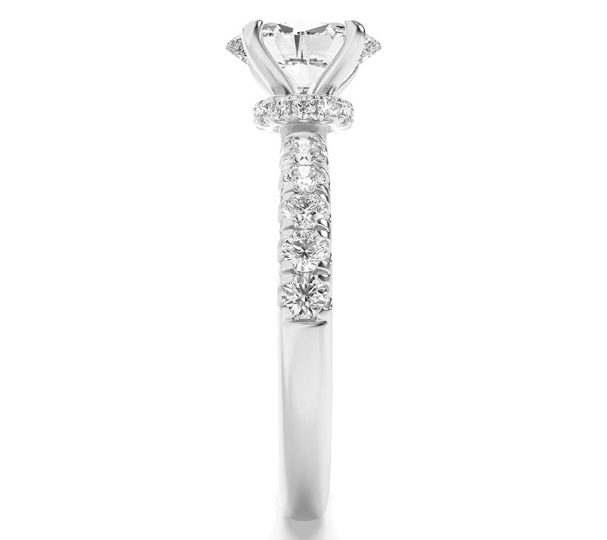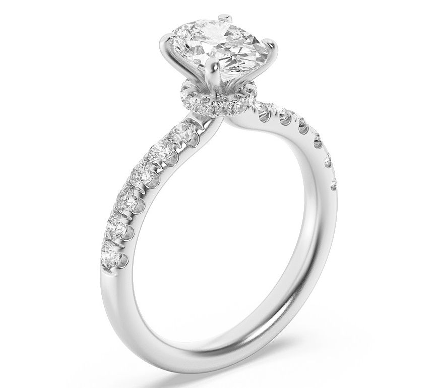 Prong-set oval lab-grown diamond in the center; smaller round lab-grown diamonds on each side; polished finish