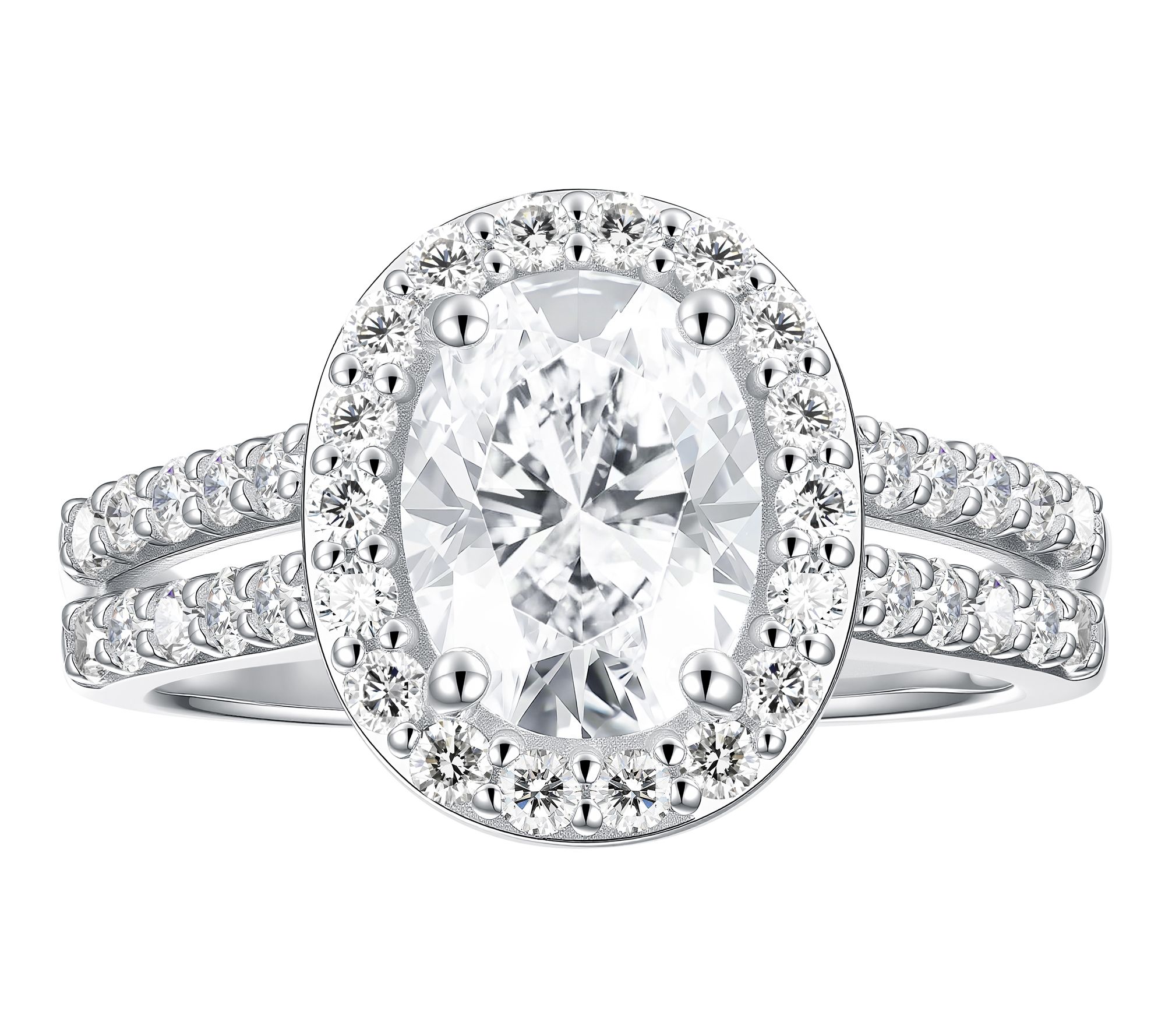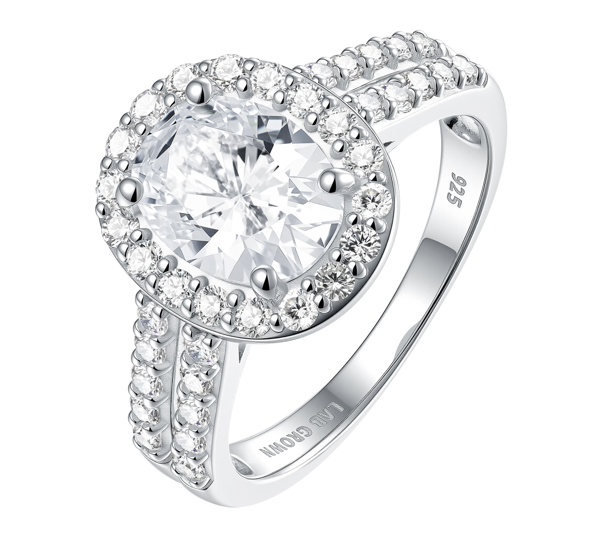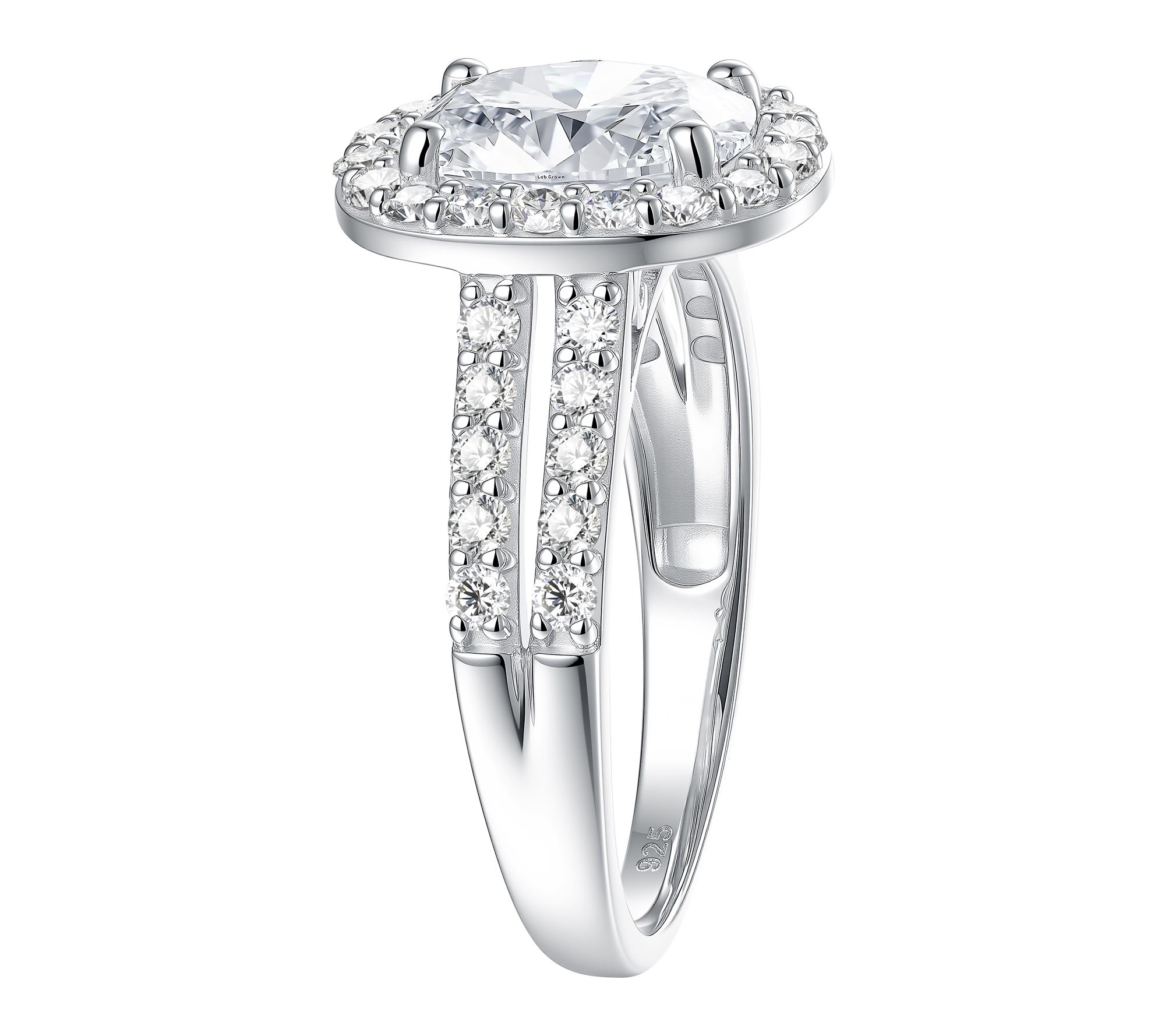Center prong-set, oval-cut lab-grown diamond with round-cut lab-grown diamond halo and split shank; polished finish