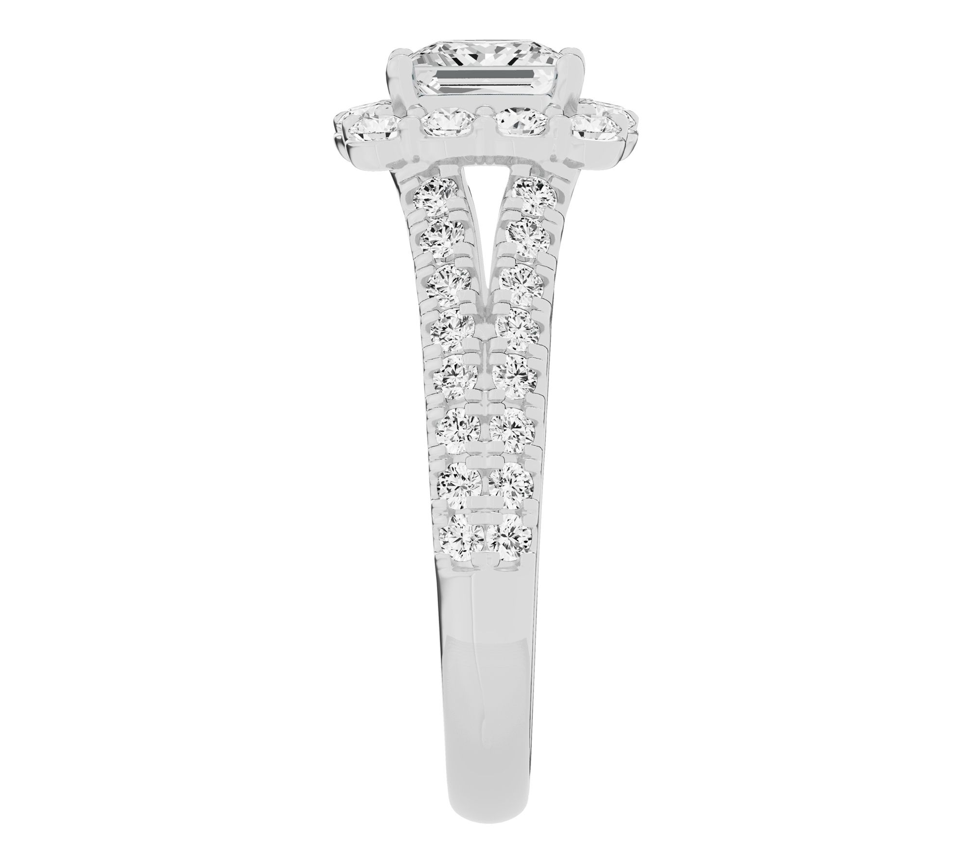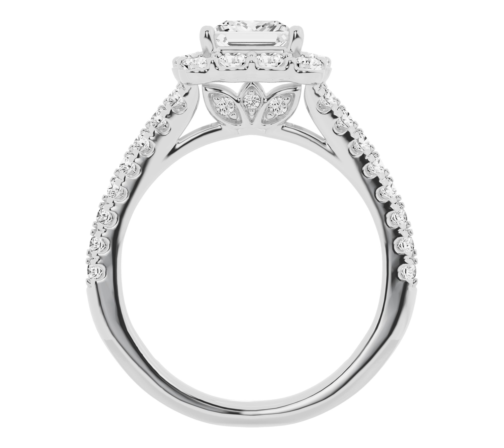 Halo design; princess-cut and round-cut, prong-set lab-grown diamonds