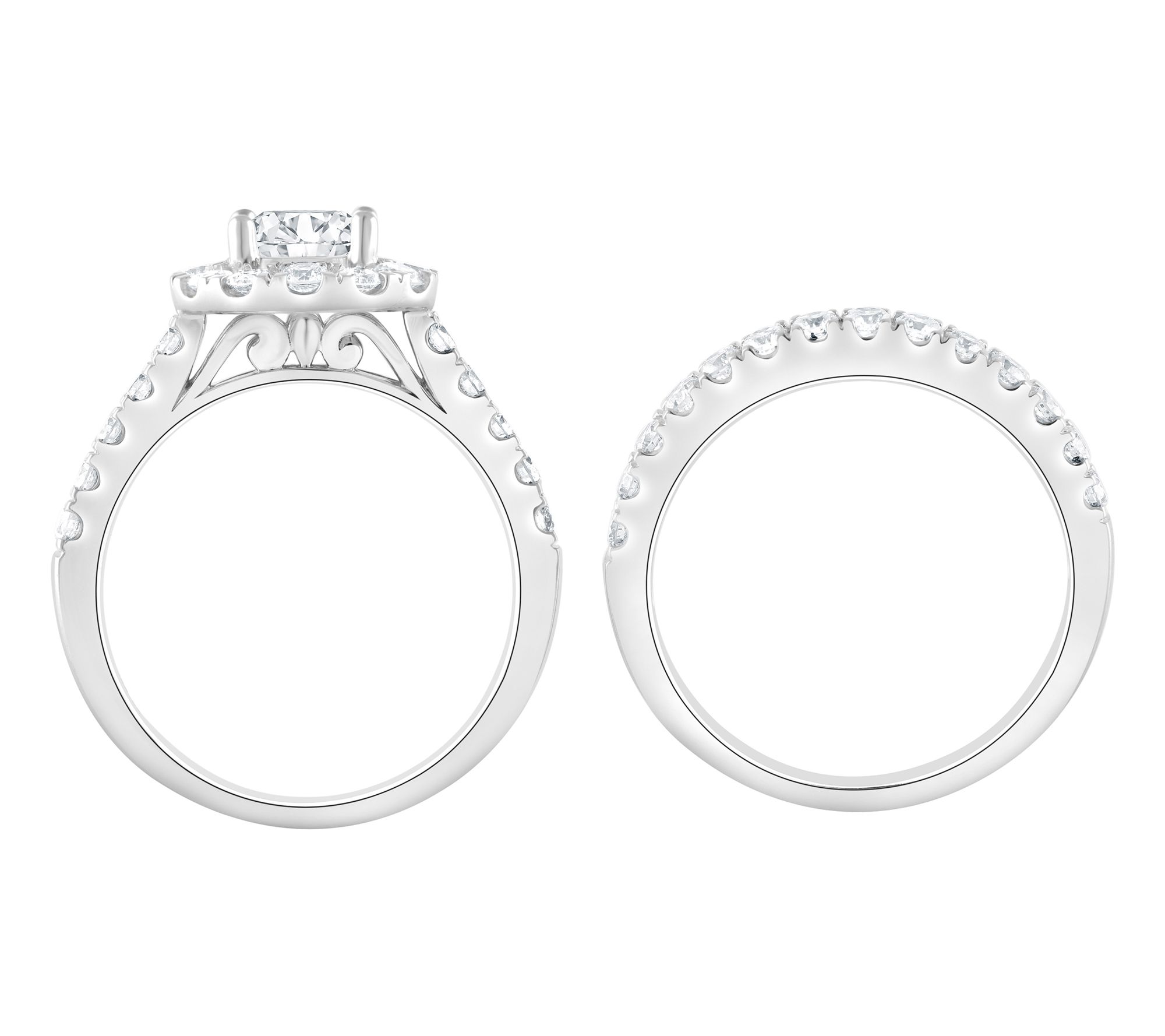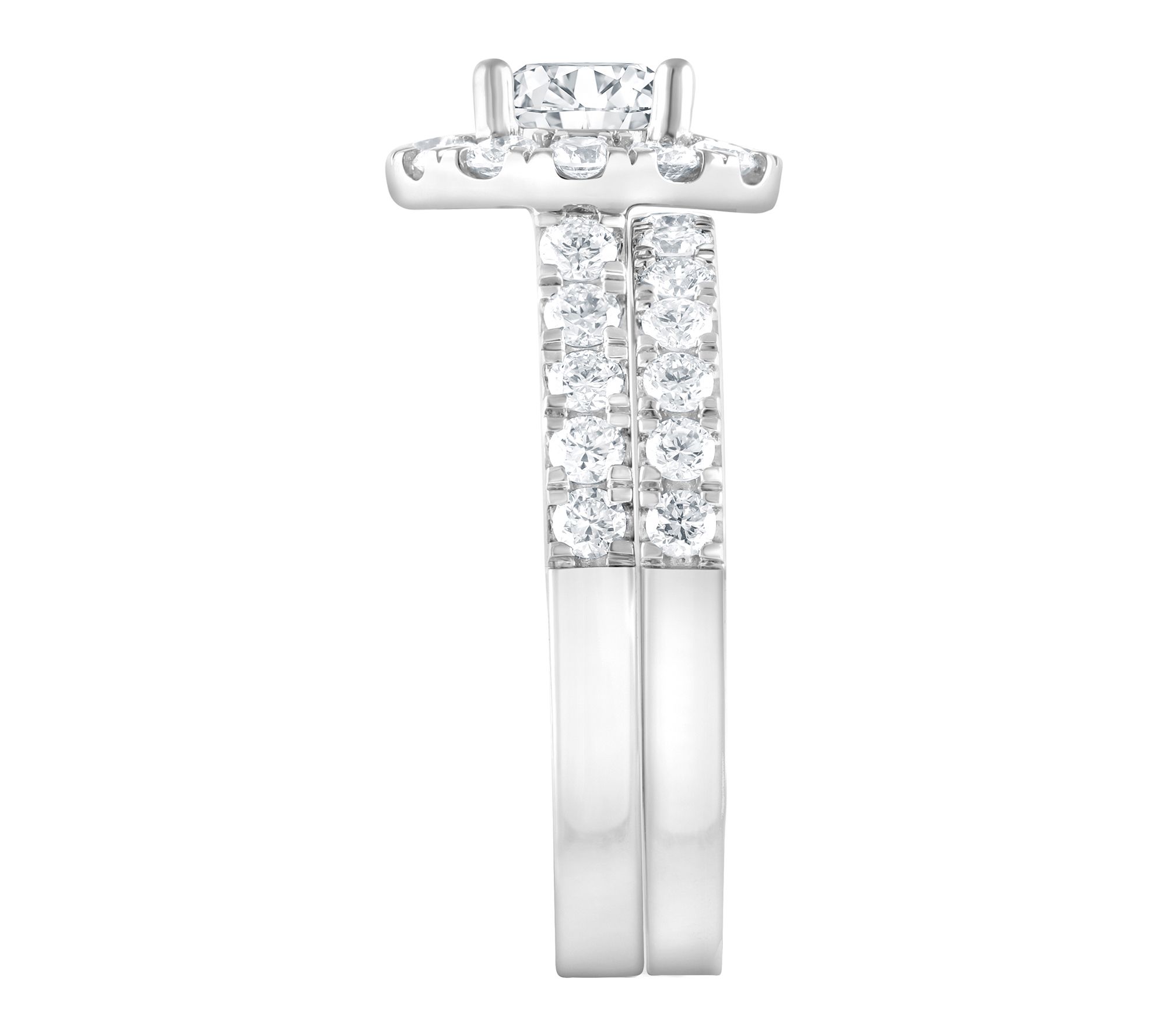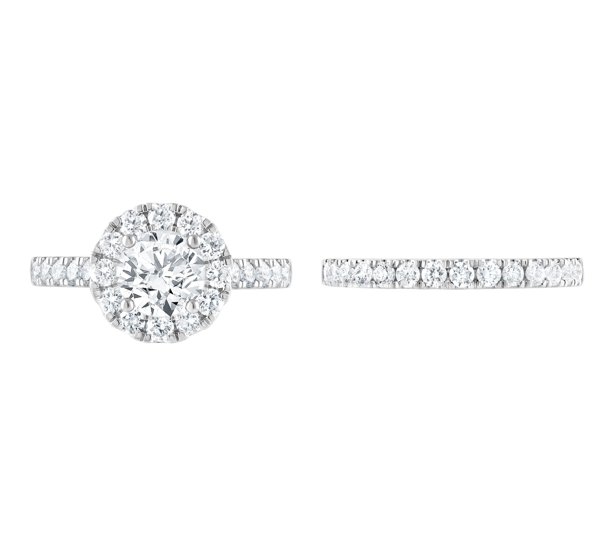 Whether it's a heartfelt proposal or celebrating years together, this bridal ring set radiates elegance with every gesture. Crafted in 14K white gold, the engagement ring features a captivating round-cut lab-grown diamond surrounded by a shimmering halo, while the coordinating band sparkles with additional lab-grown diamonds for extra light-catching beauty. From Fire Light Lab Grown Diamond Jewelry.