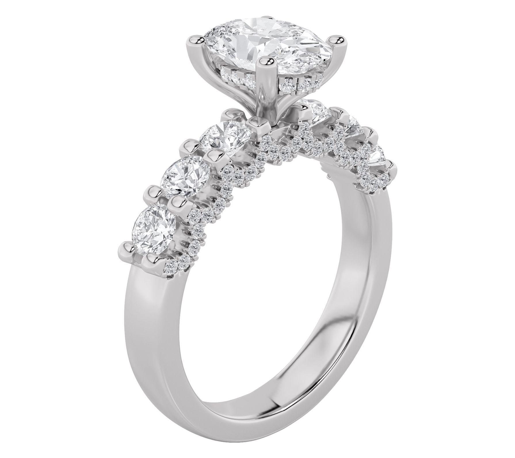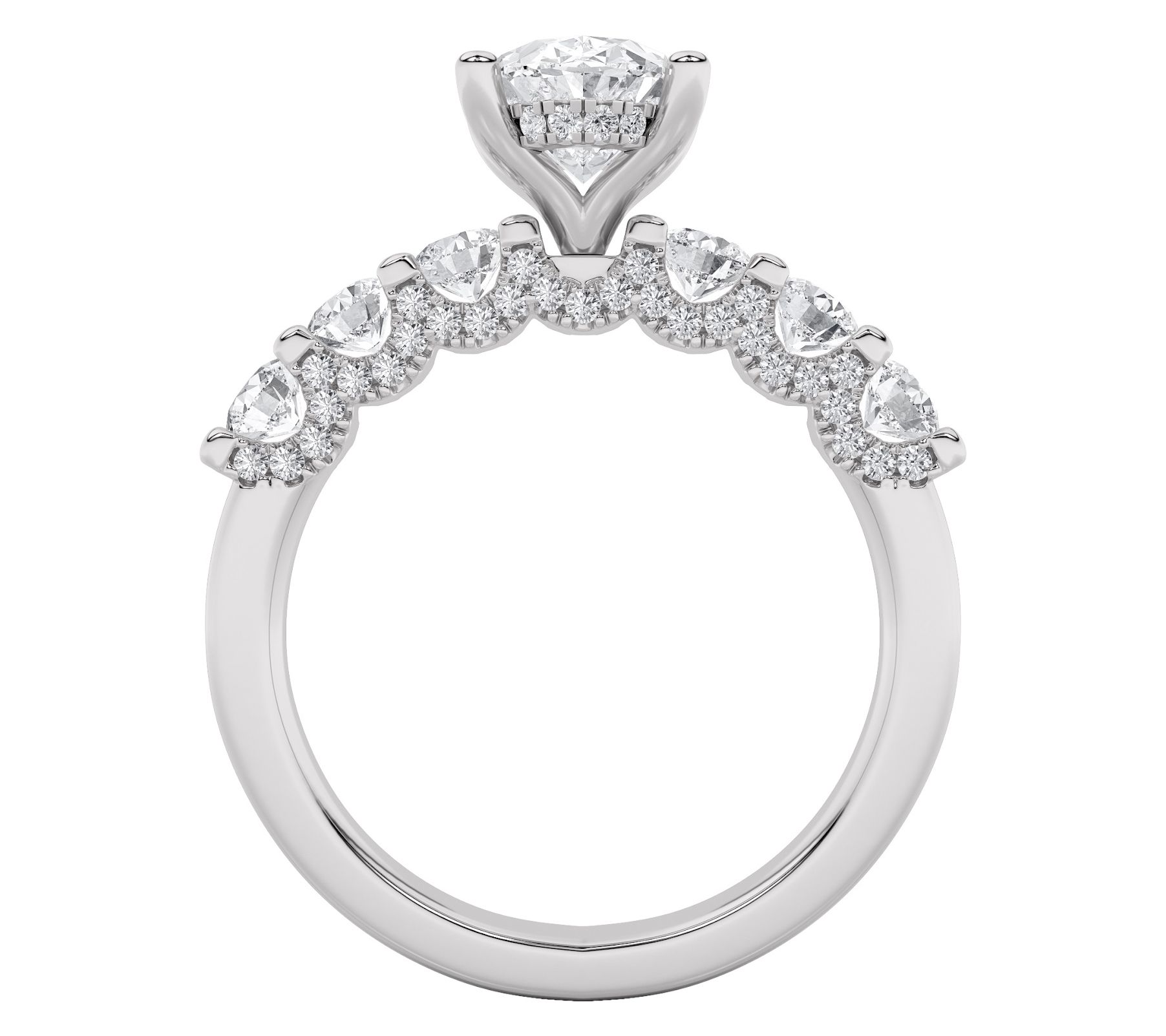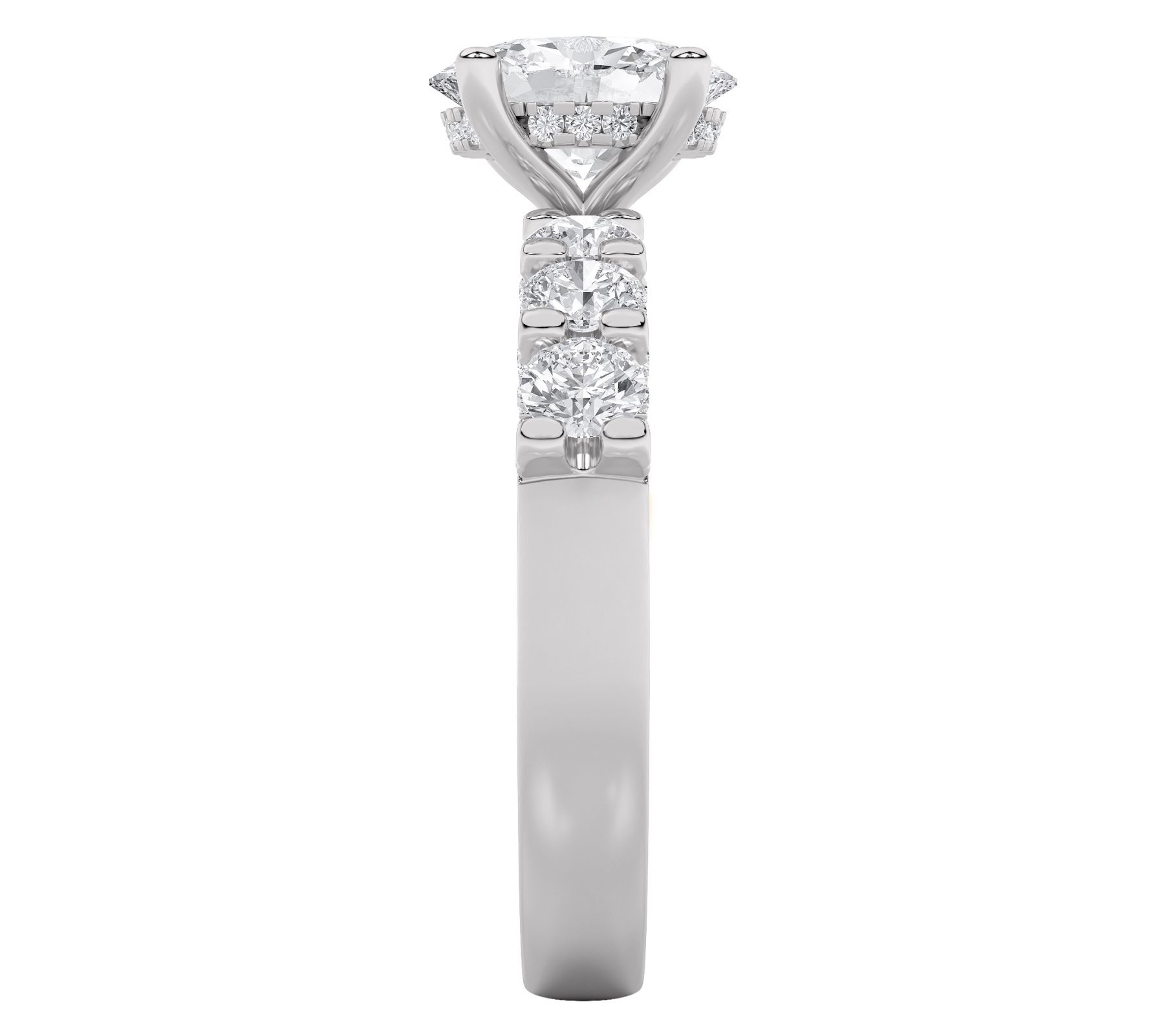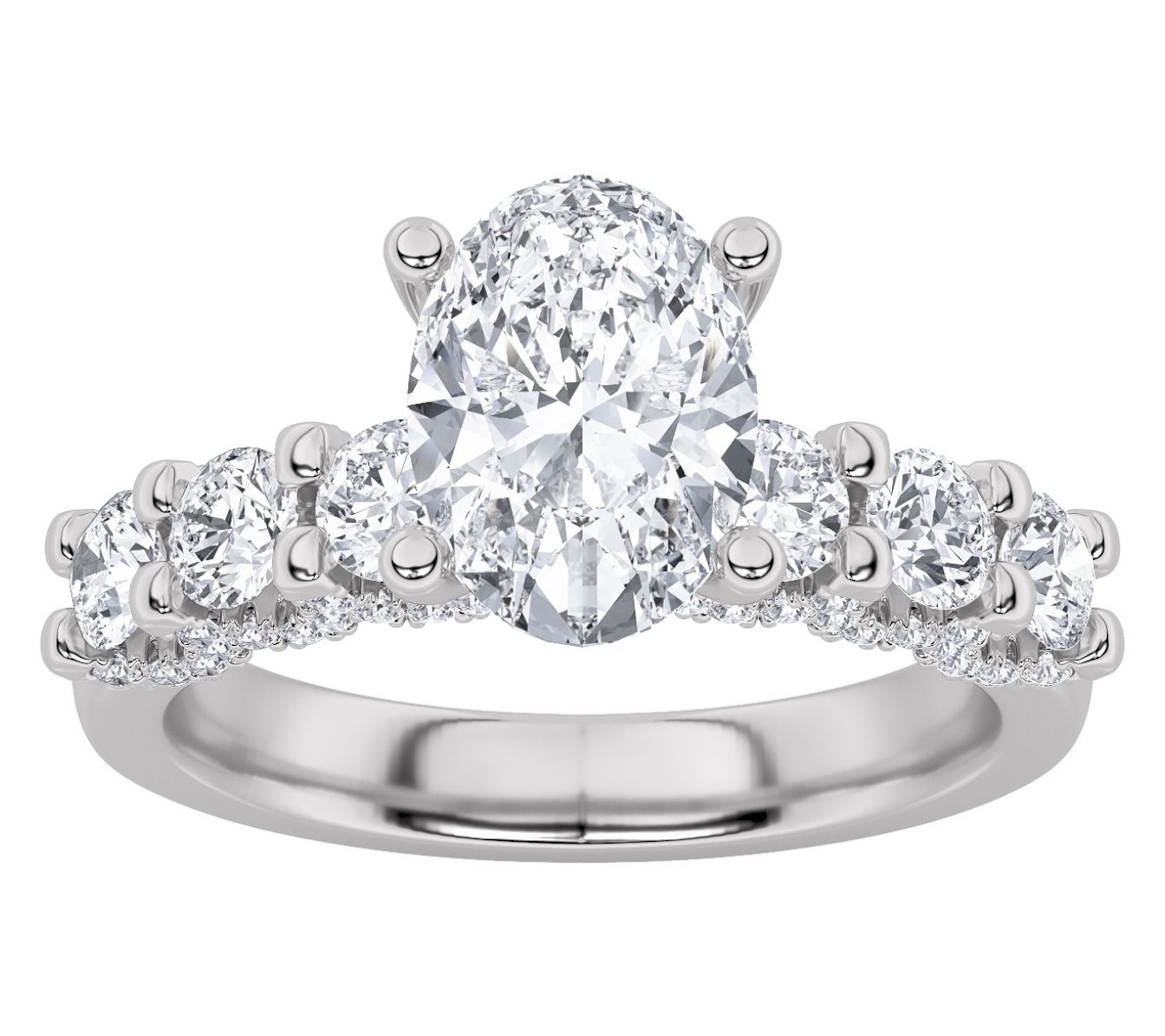 Oval, prong-set, lab-grown diamond in the center; round, prong-set lab-grown diamonds on each side and along the profile below