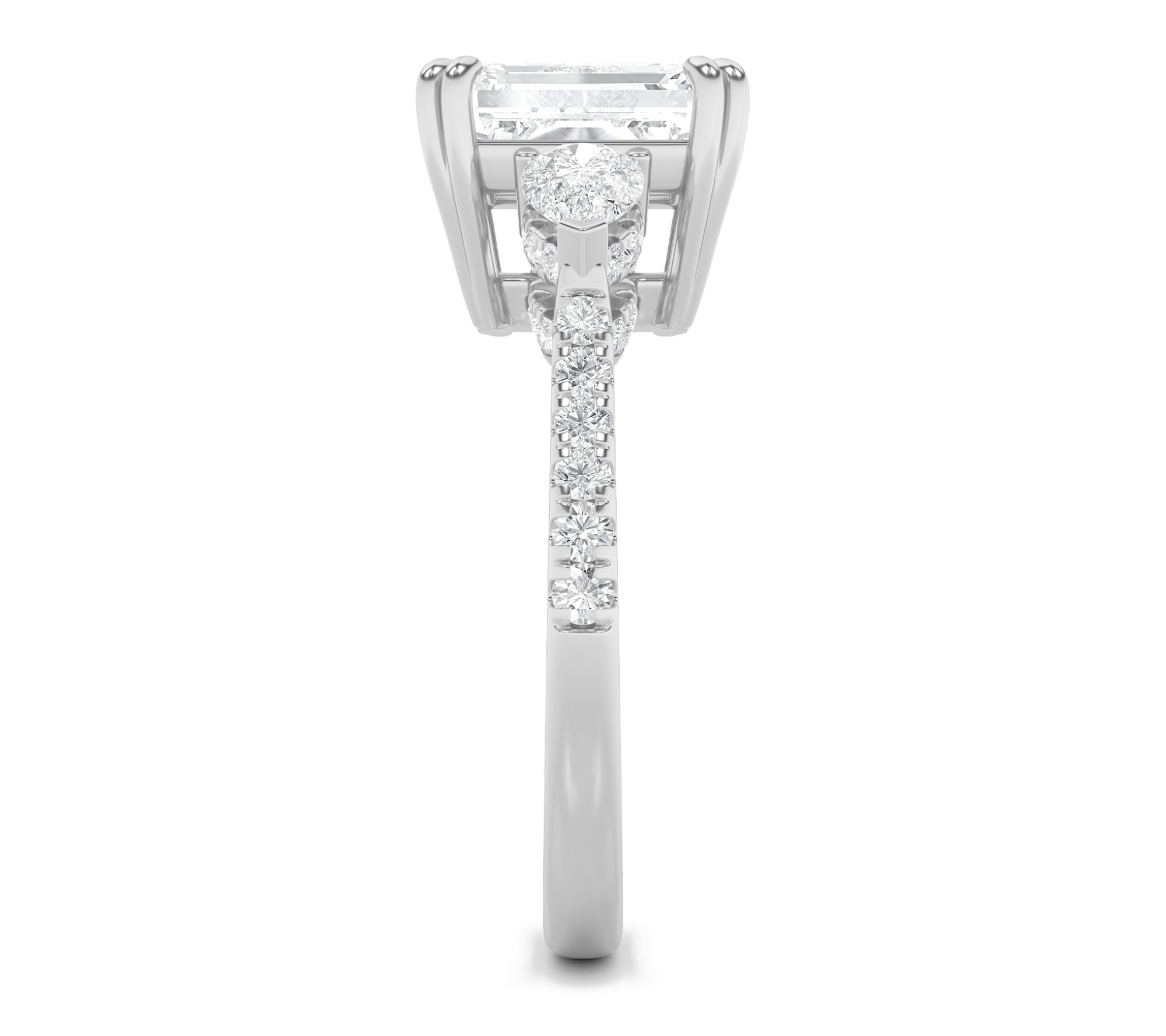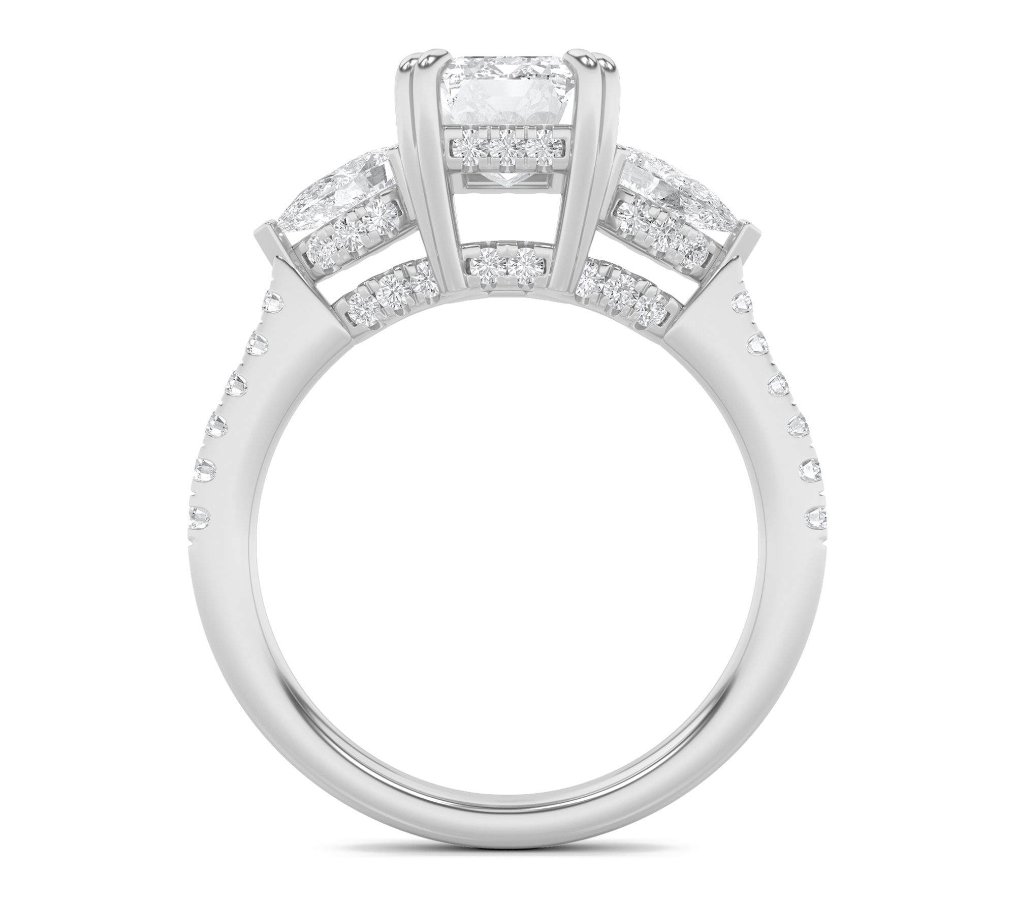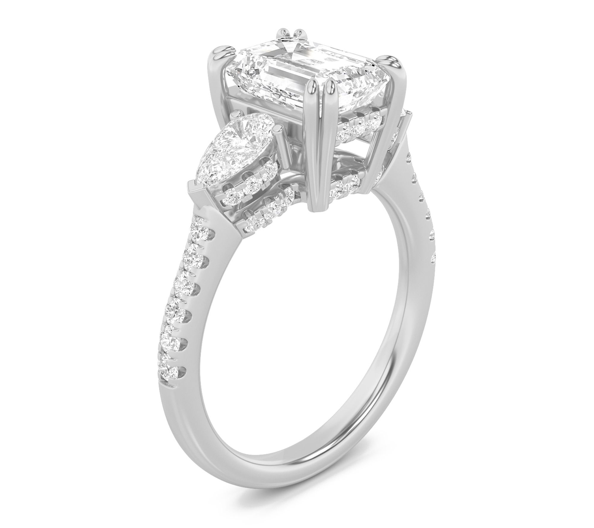 Emerald-cut lab-grown diamond center; two pear-cut lab-grown diamonds; round, pave-set lab-grown diamonds along shank and gallery; polished finish