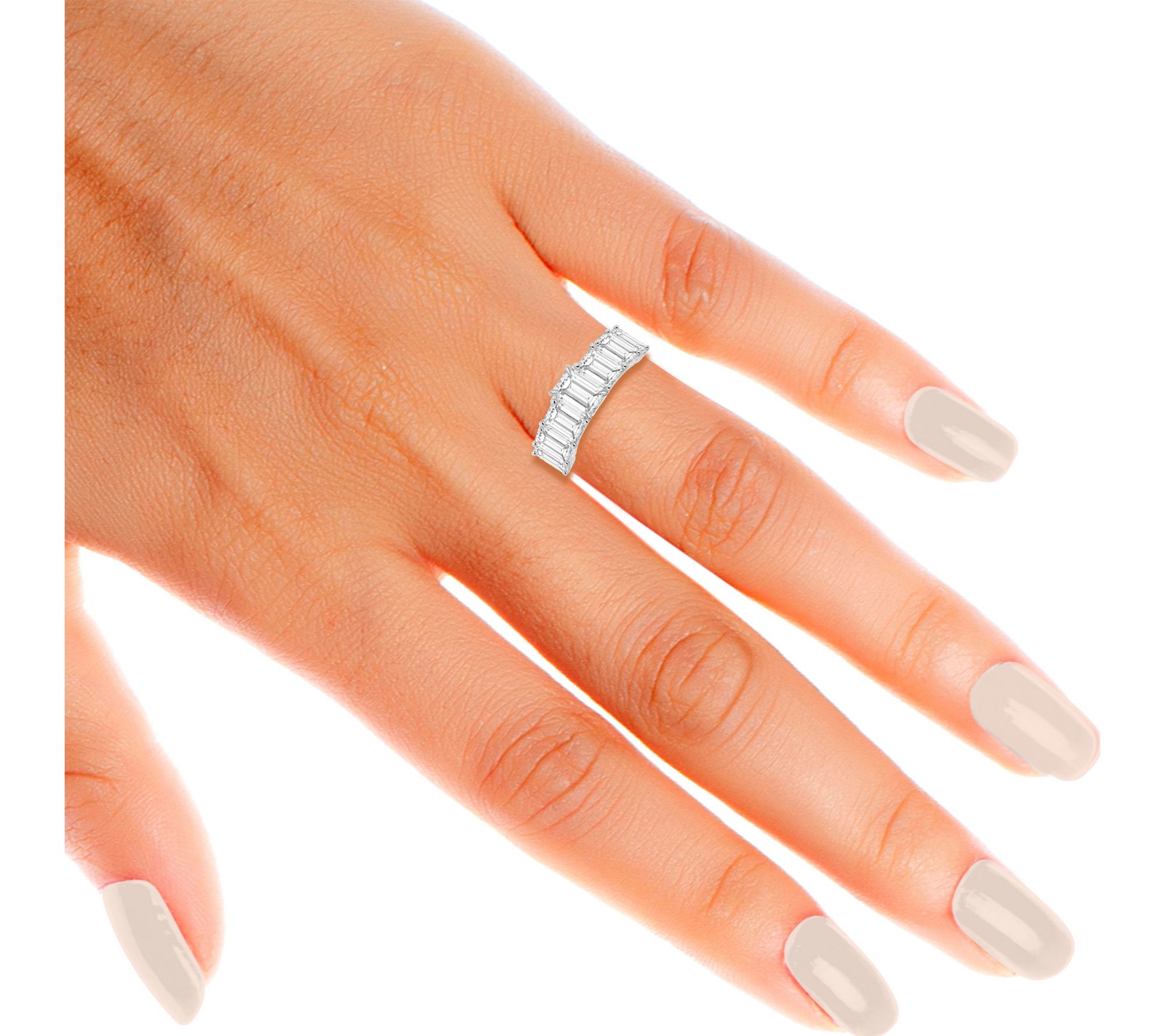 Emerald-cut lab-grown diamond; prong setting; polished band