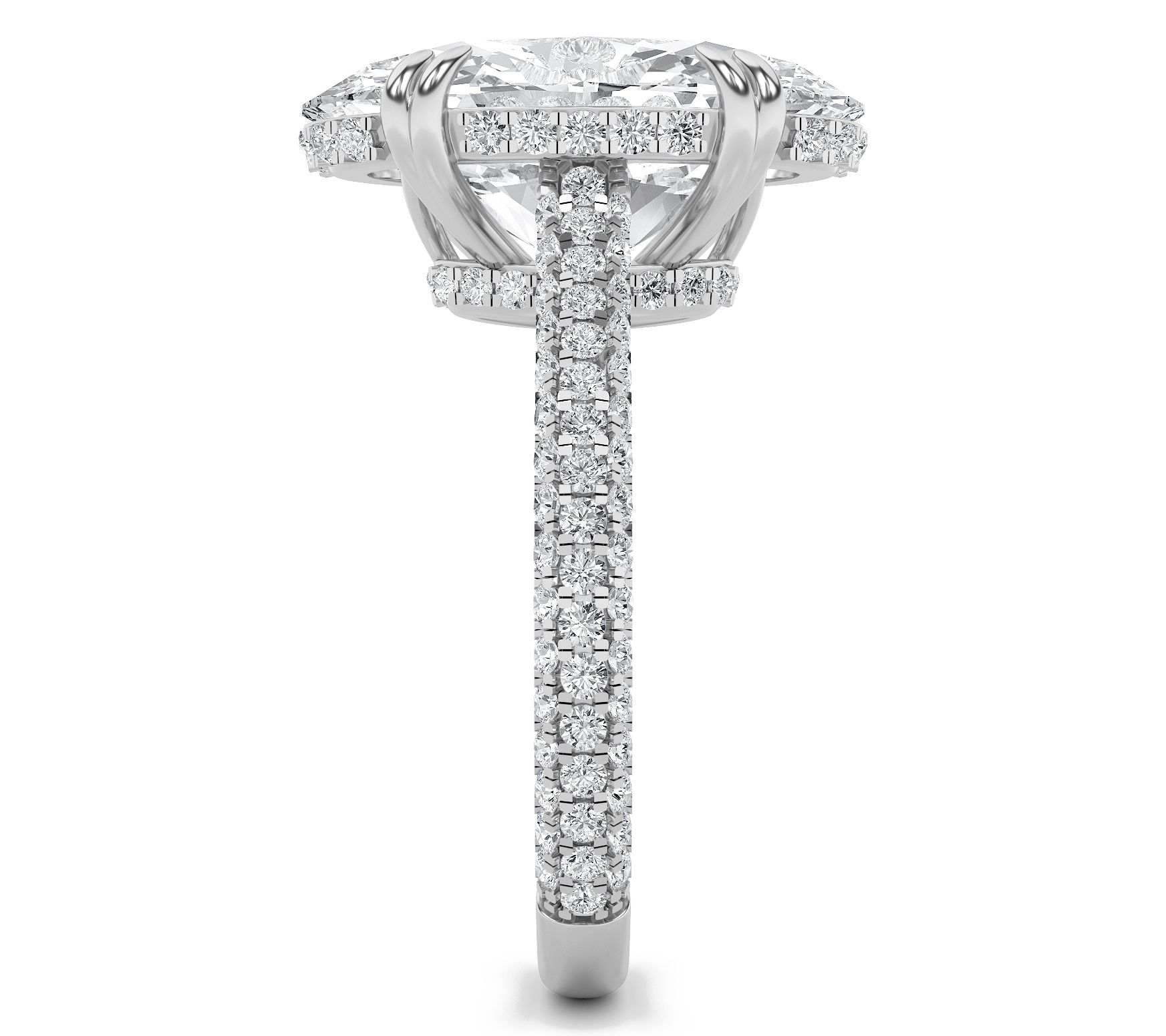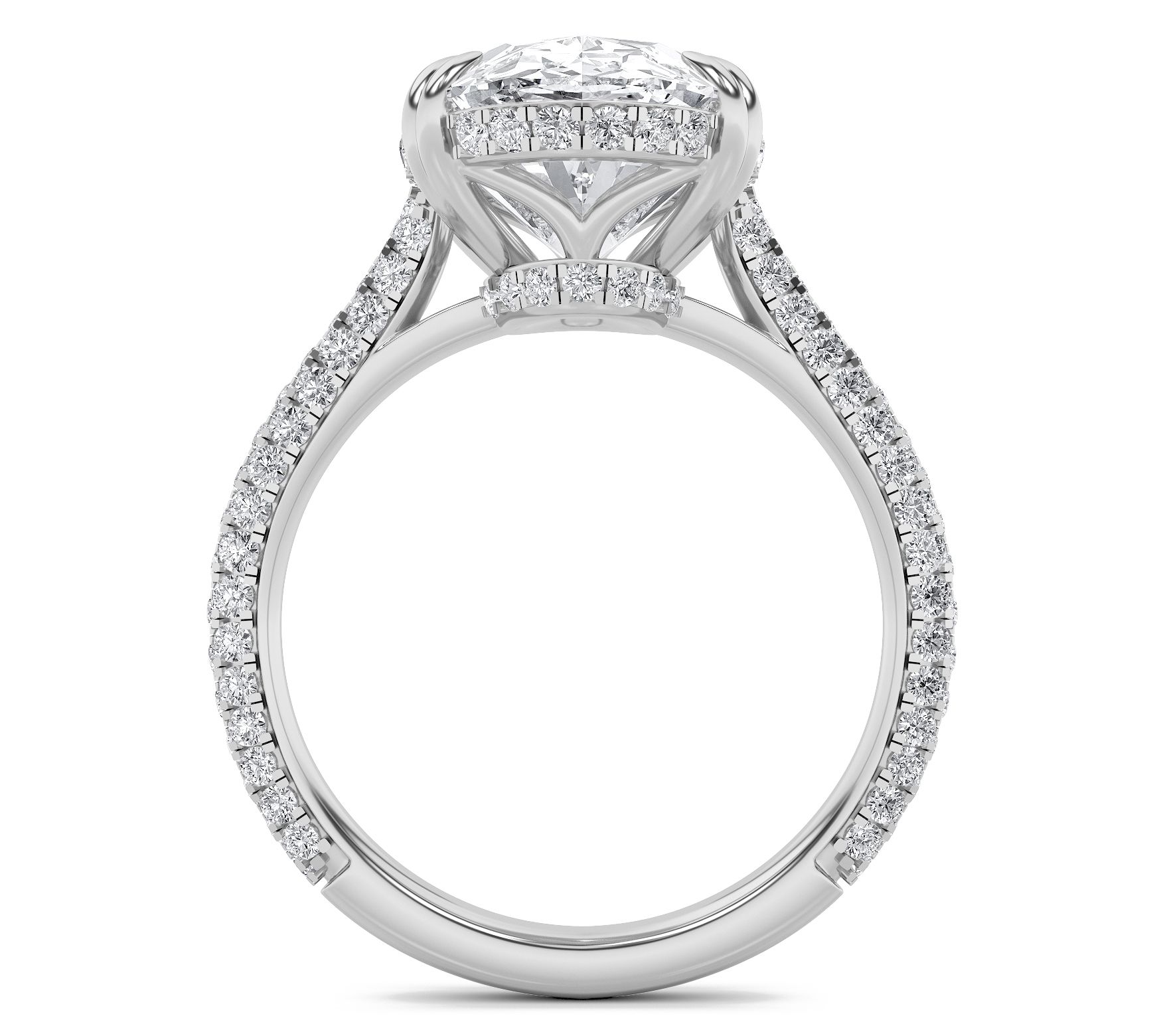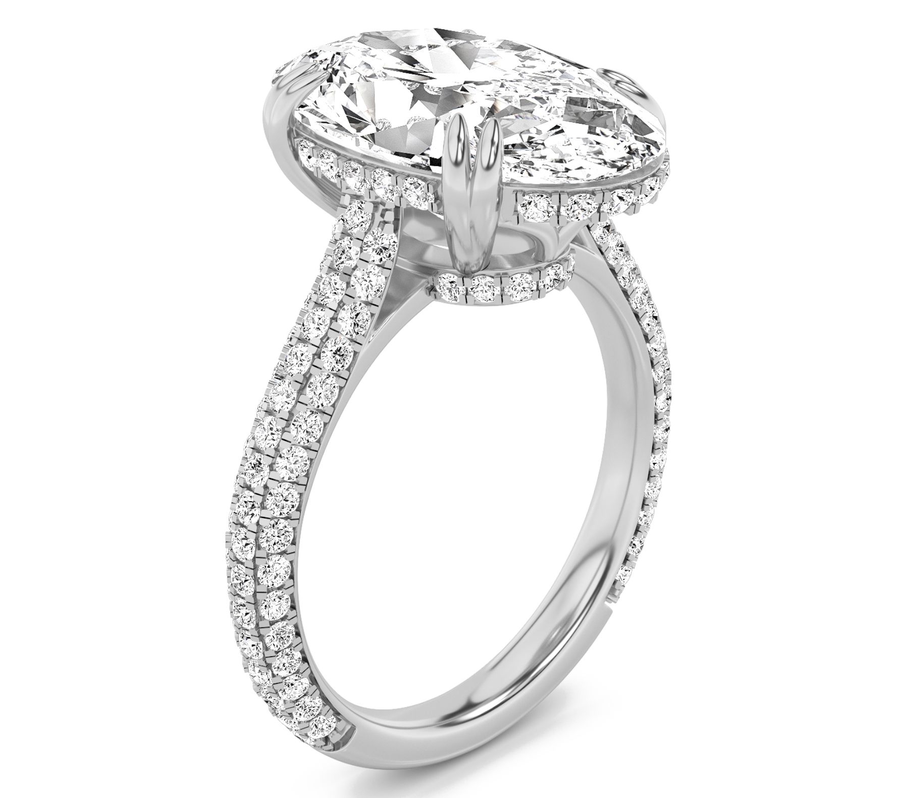Prong set oval cut lab grown diamond in center; round, prong set lab grown diamonds in gallery and along band; polished finish