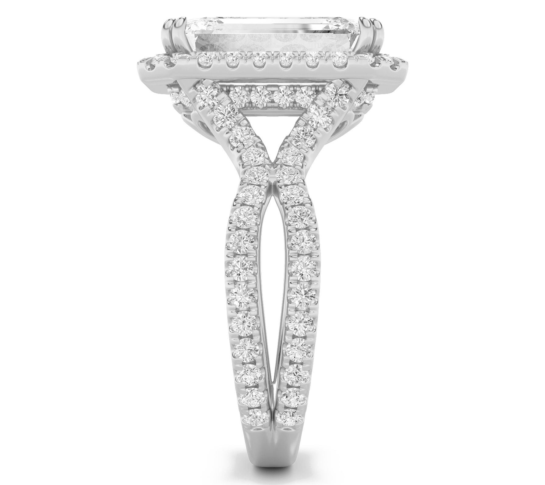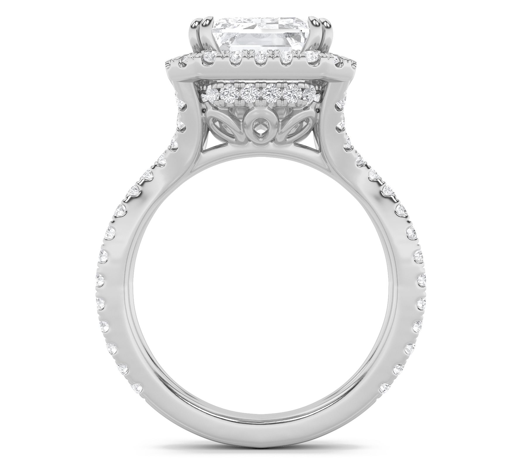 Prong set, emerald-cut lab grown diamond in the center; round, prong set lab grown diamonds in the gallery and along the open band; polished finish