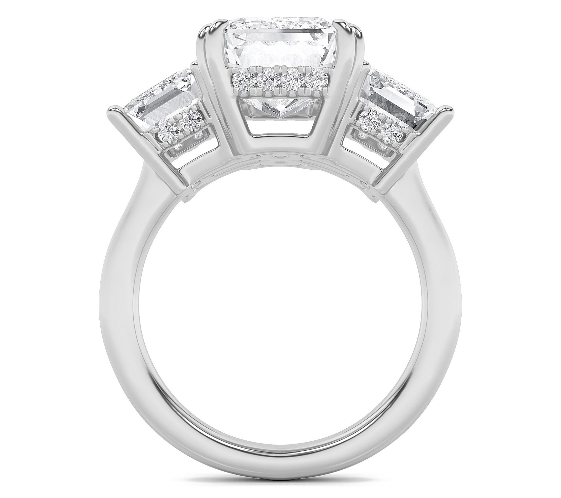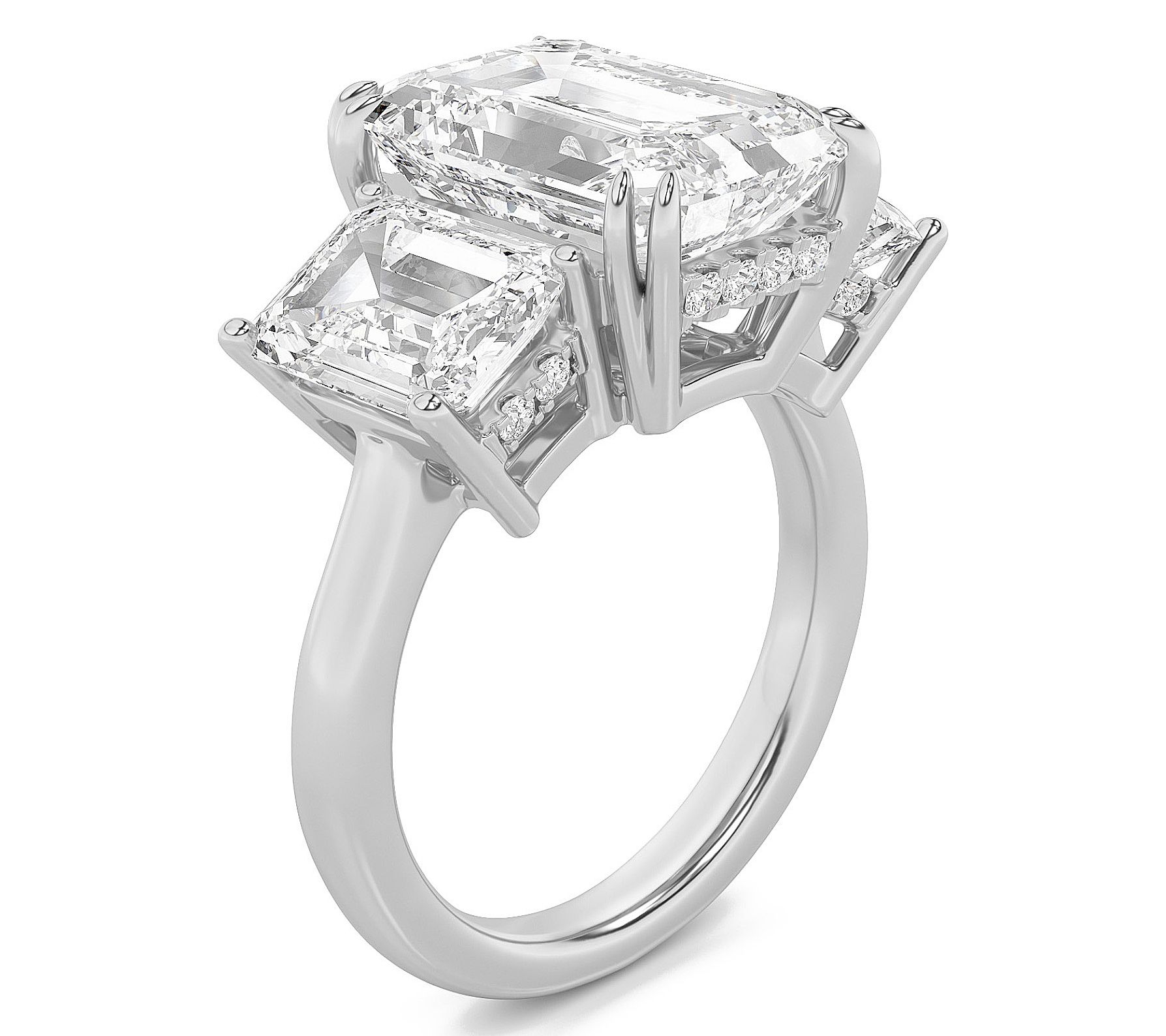 Prong-set emerald-cut lab-grown diamond in the center; emerald-cut prong-set lab-grown diamonds on each side; round lab-grown diamonds in the gallery below; polished finish