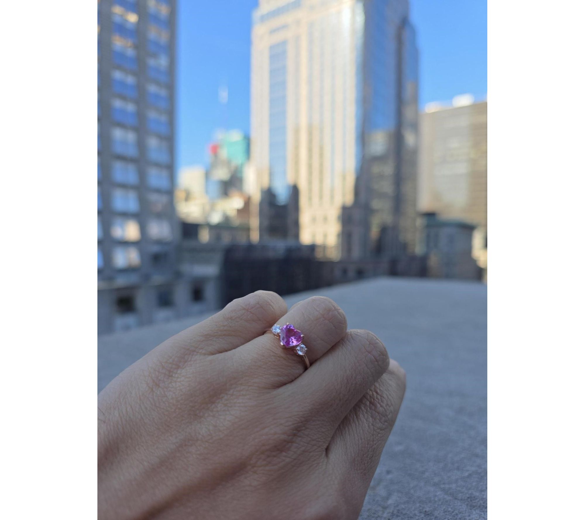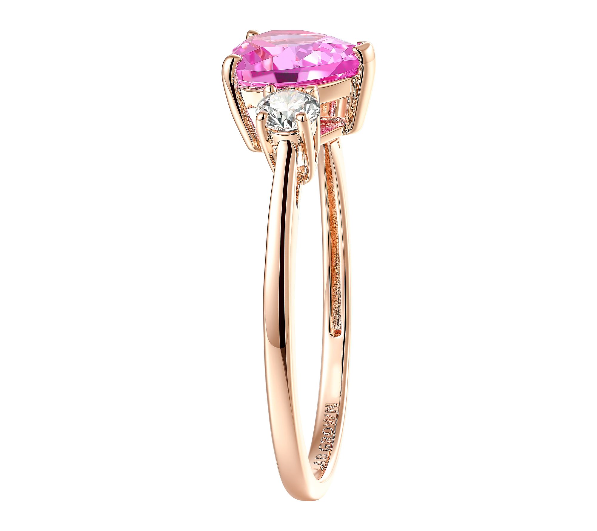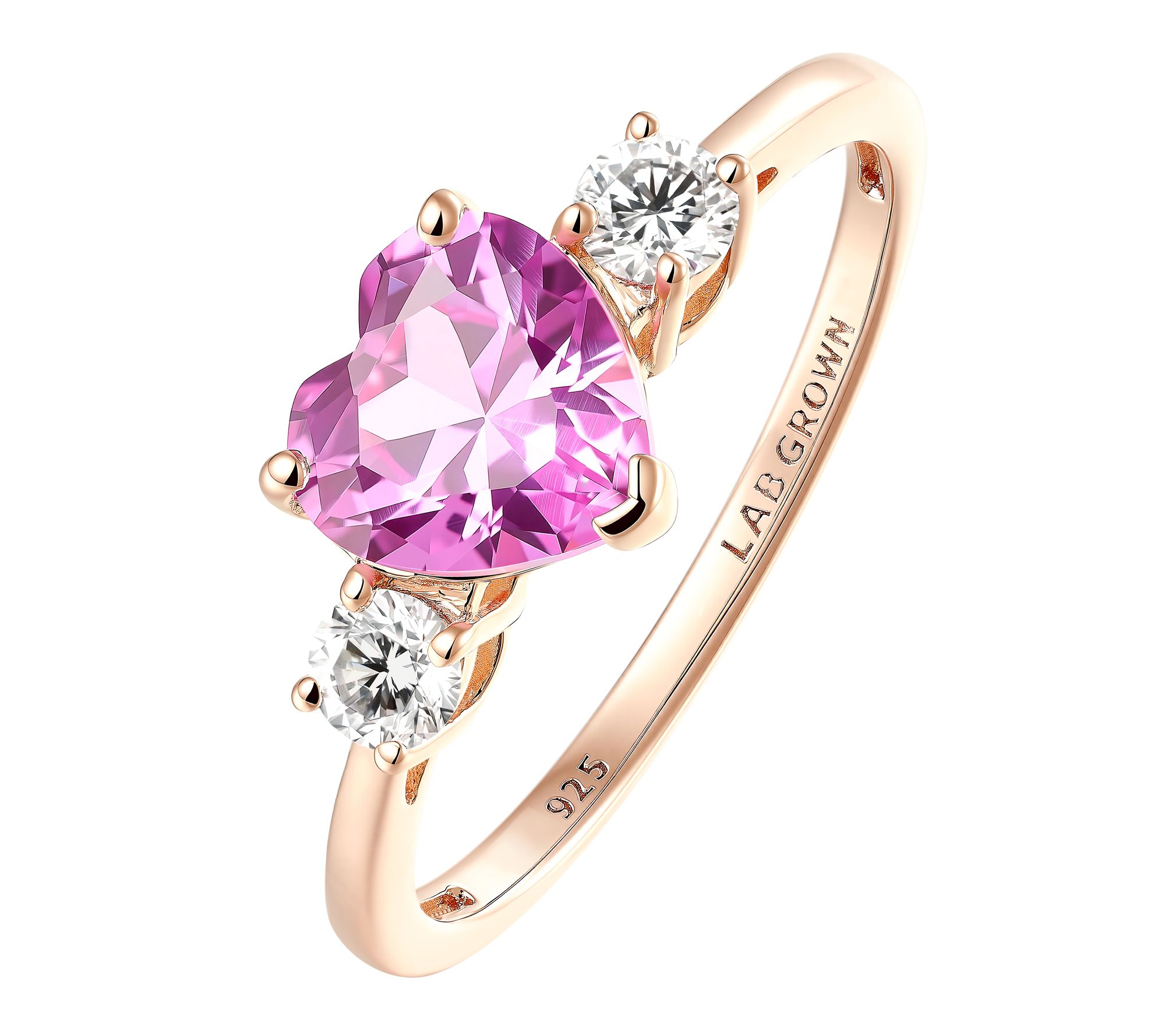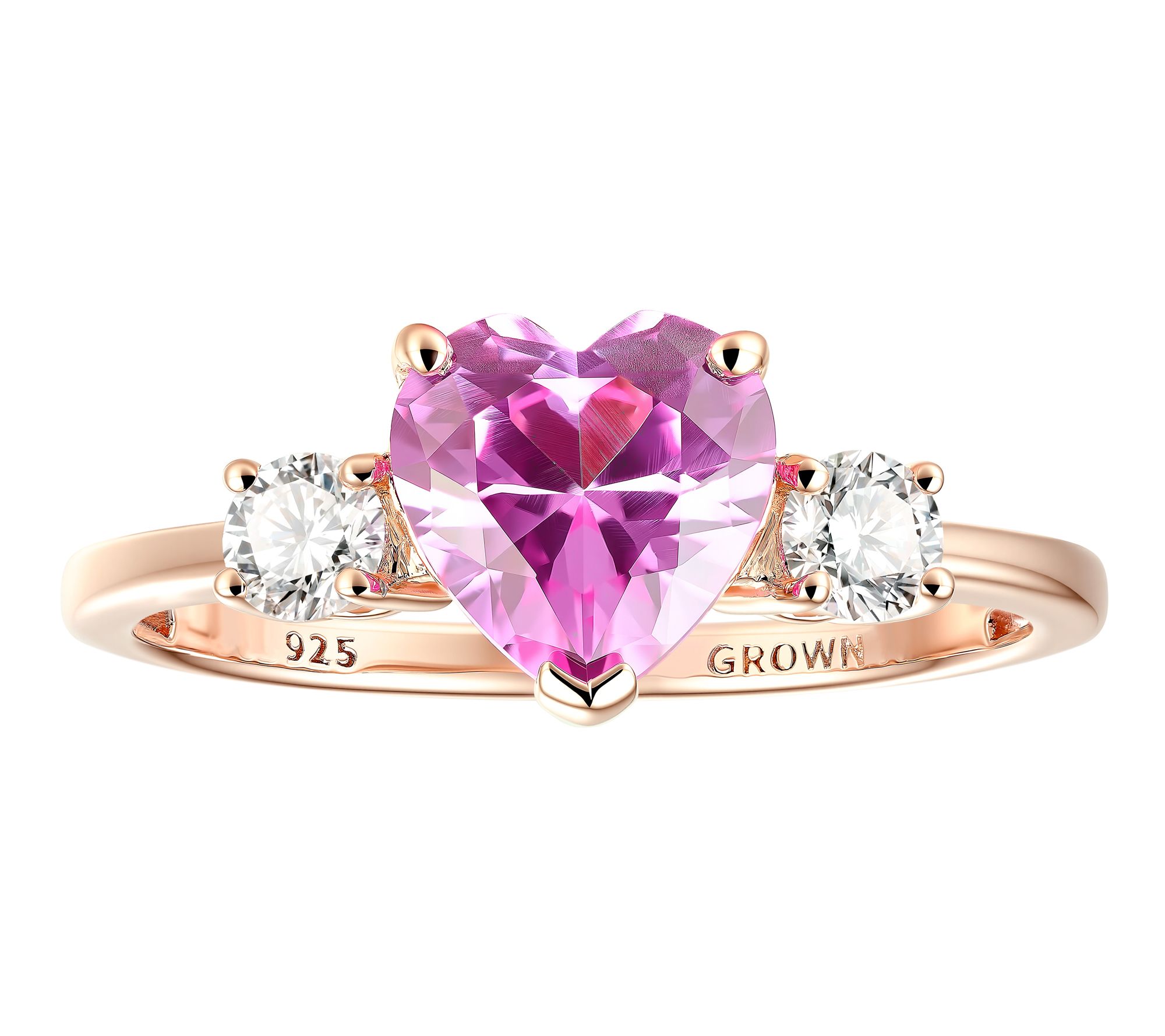 Heart-cut created pink sapphire center; round-cut lab-grown diamonds; prong settings; band style