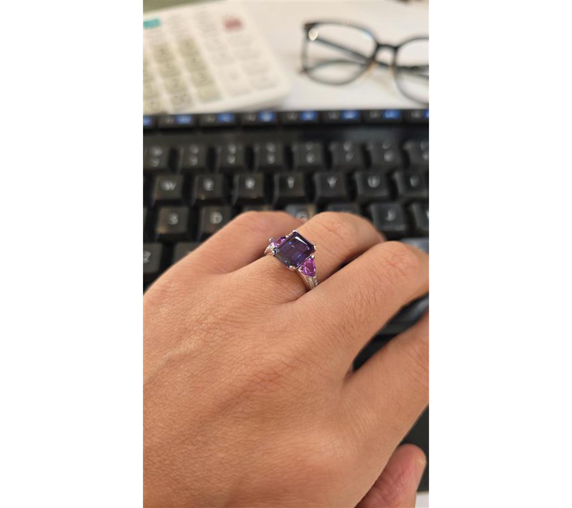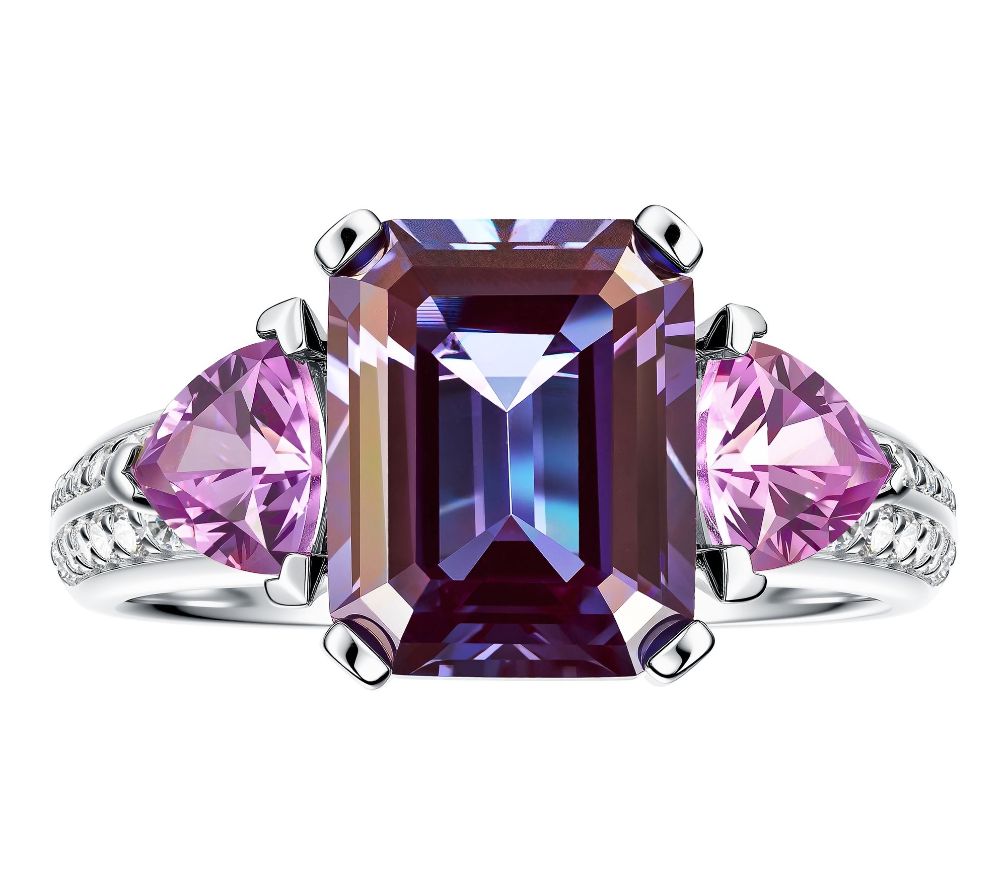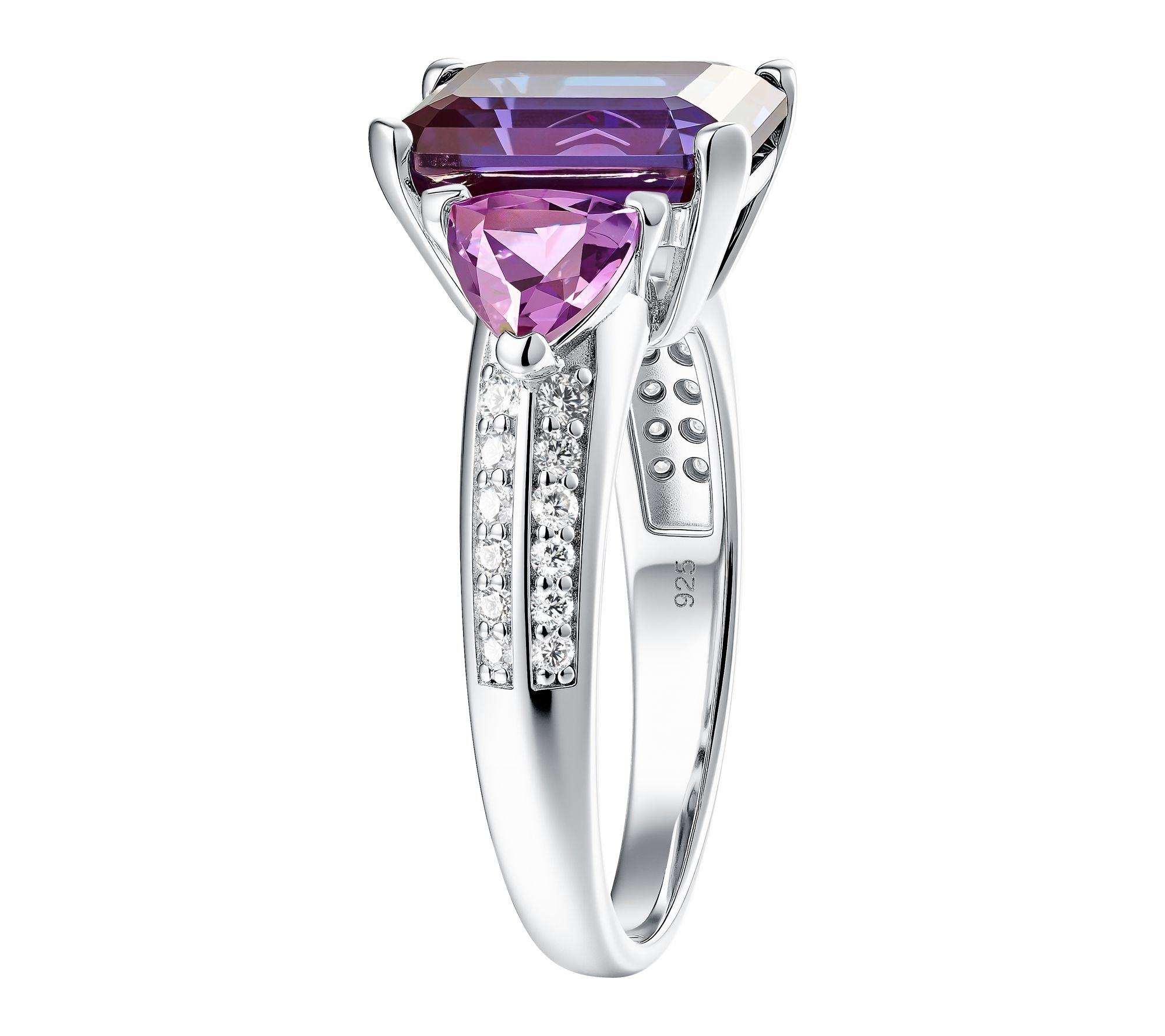 • Cocktail-style design; prong-set emerald-cut lab-grown Alexandrite; trillion-cut lab-grown purple sapphire; round lab-grown diamond accents