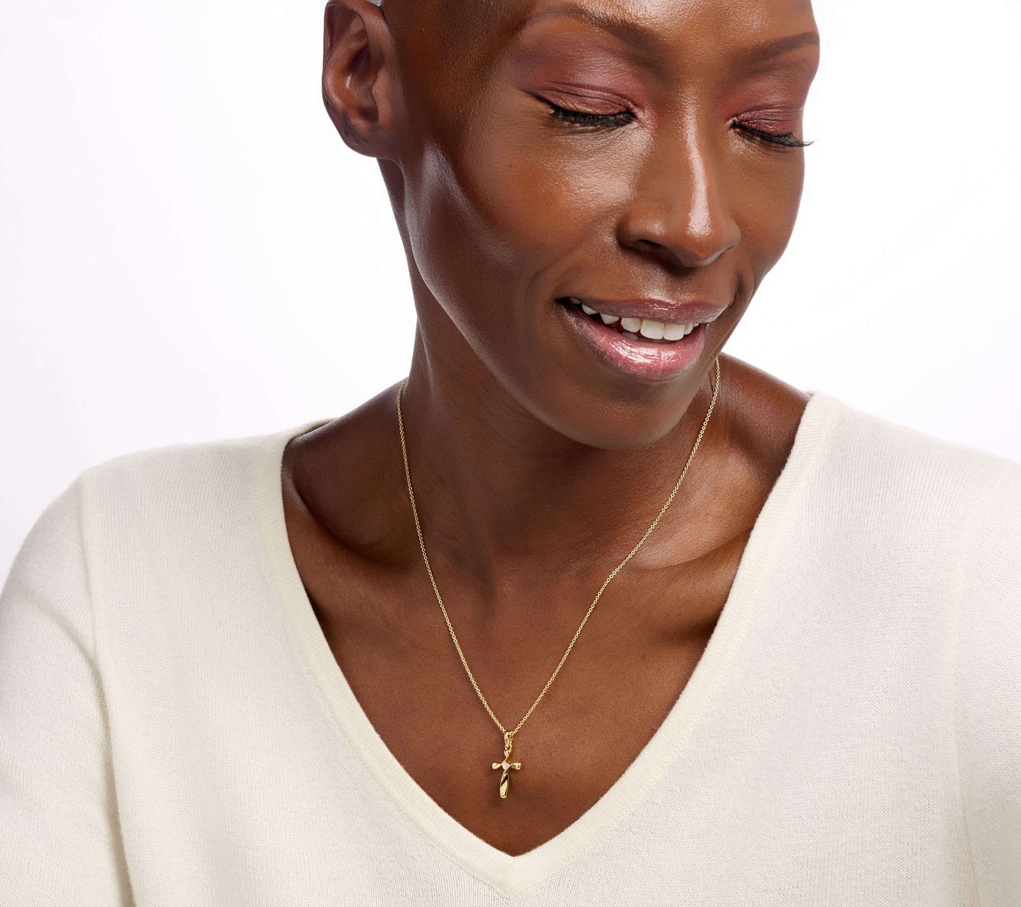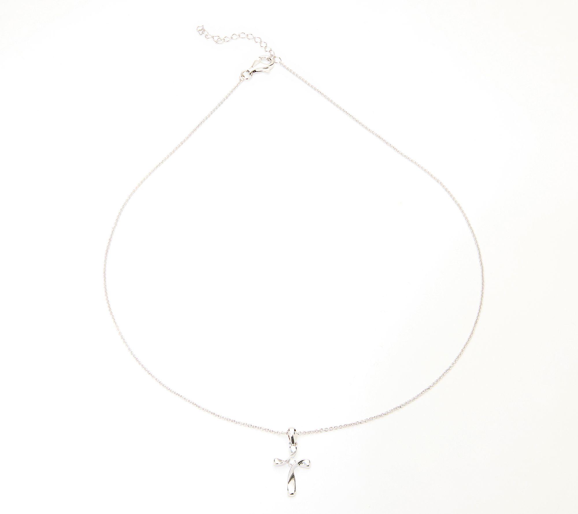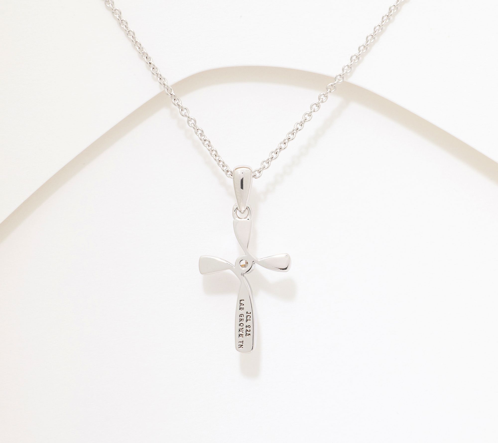 • Solitaire faceted, round, lab-grown diamond accent tension set at center of petite cross; polished finish