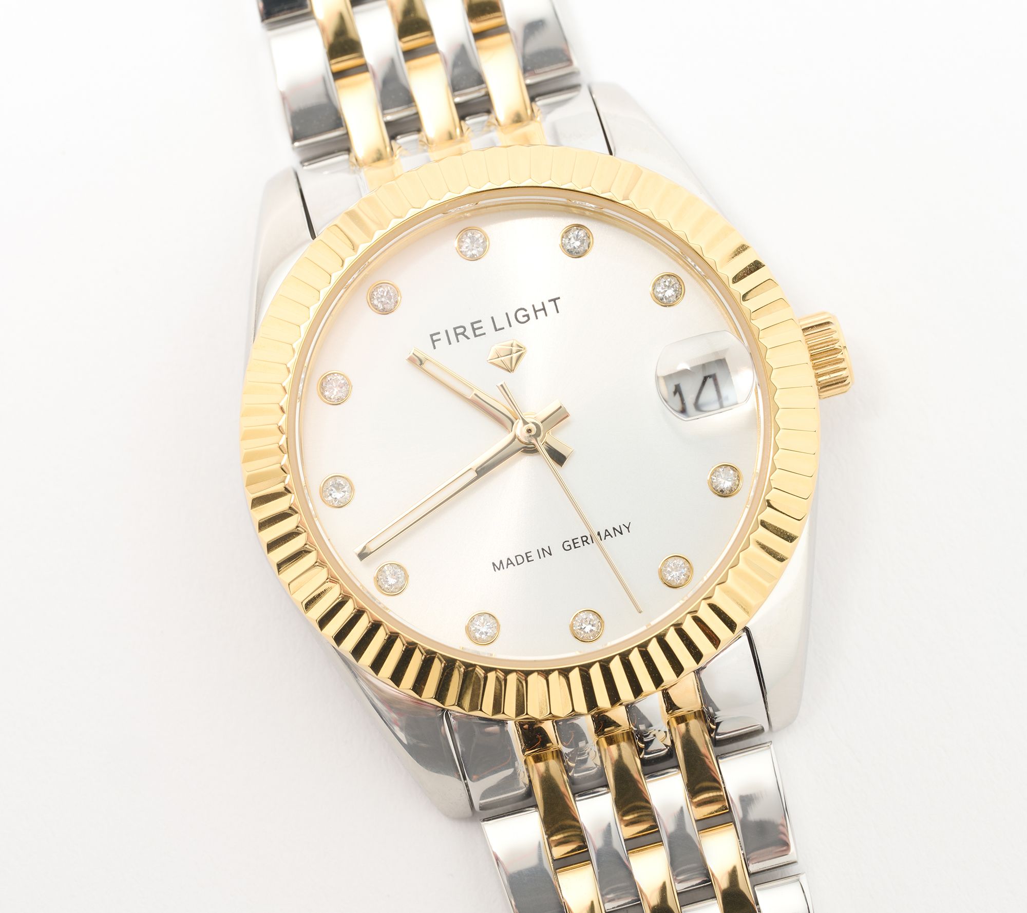 Lab-grown diamond hour markers; hour, minute, and second hands; date window at 3