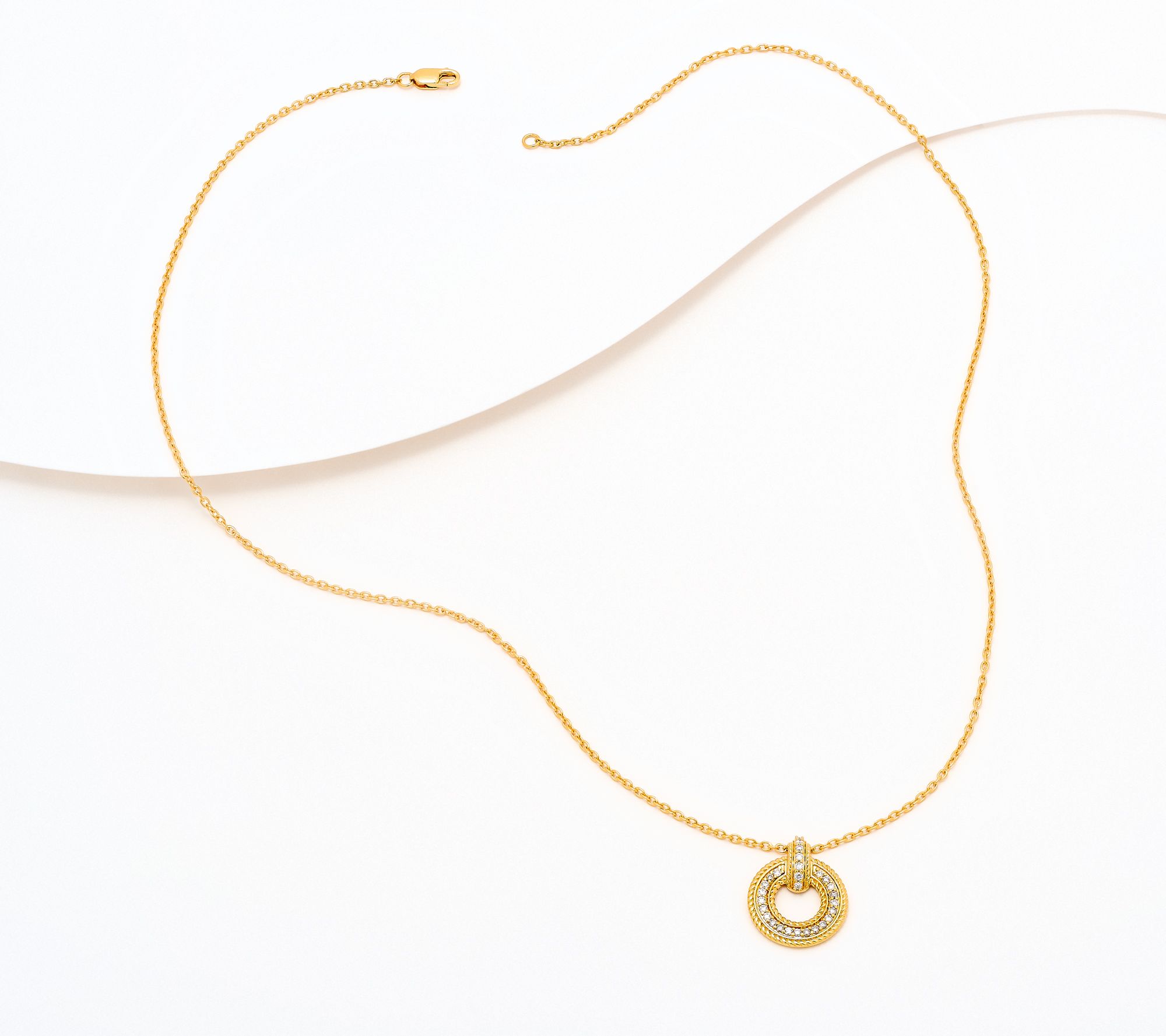 Open circle design with round lab-grown white diamonds; cable chain; polished finish