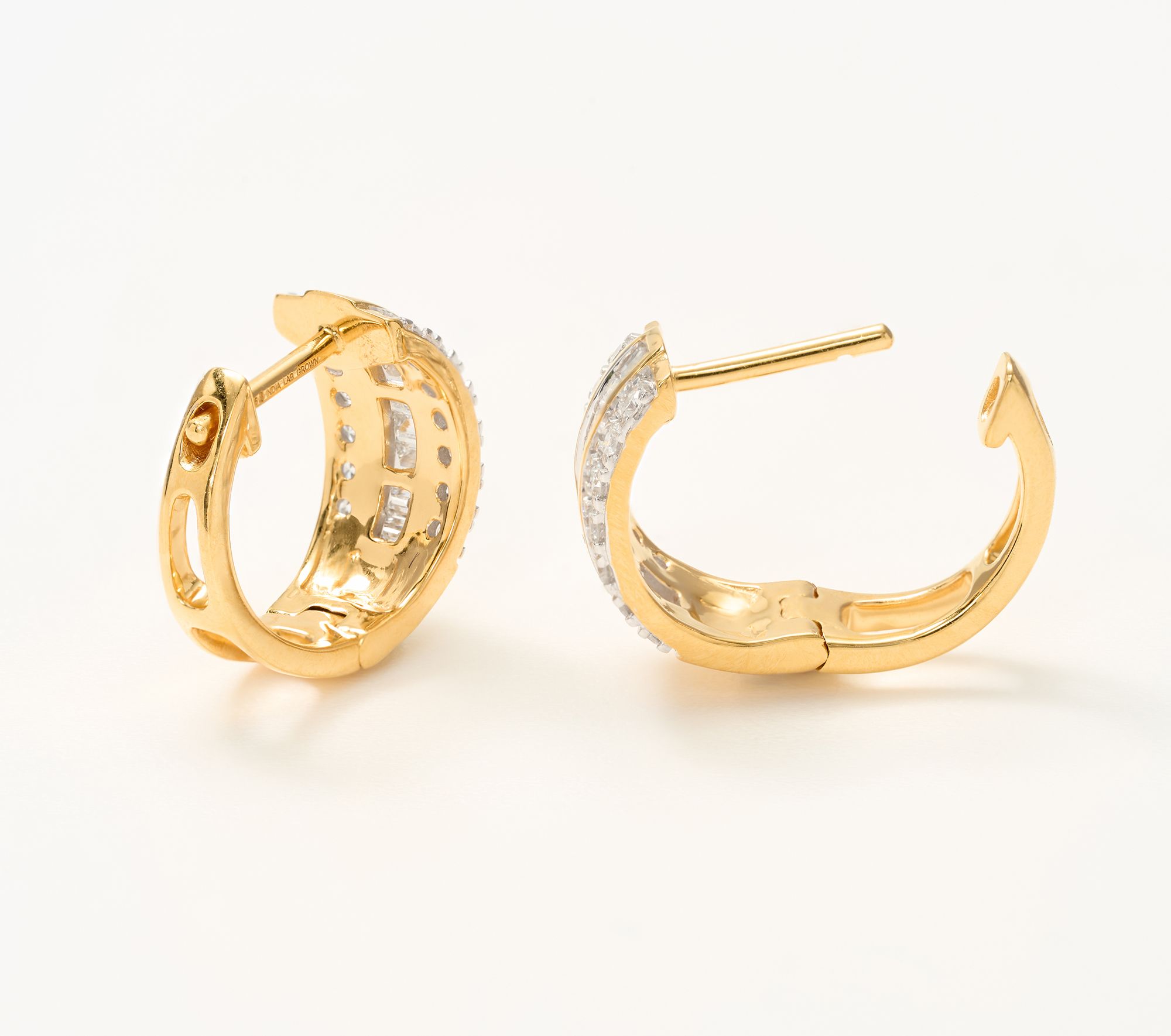 Huggie hoop style; three rows of lab-grown diamonds; center row of baguette lab-grown diamonds border by row of round lab-grown diamonds; polished finish