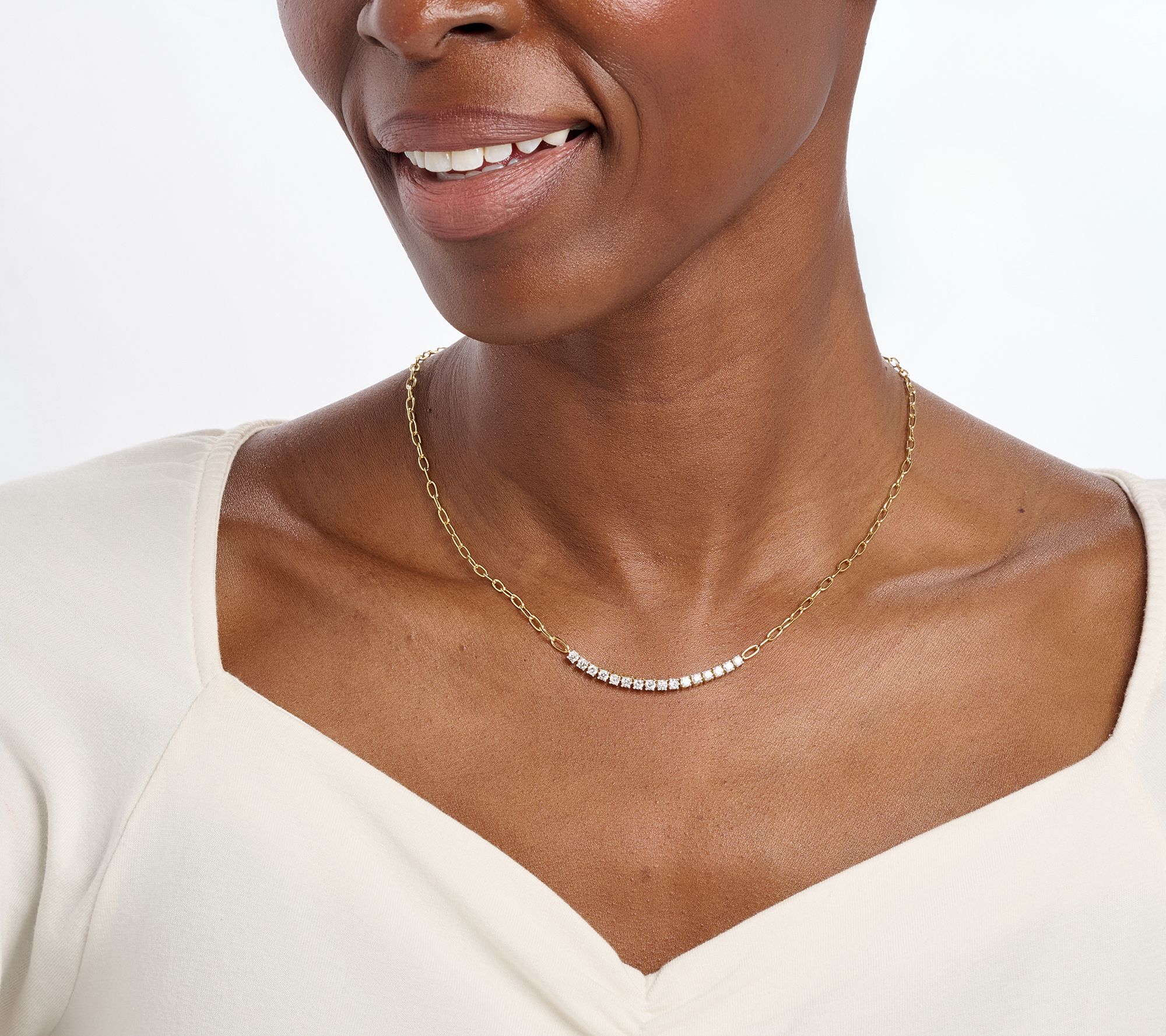 A tennis necklace with sparkling lab-grown diamonds brings brilliance to your day, whether you're heading to brunch or dressing up for an evening out. The paperclip-style chain and prong-set lab-grown diamonds create a modern silhouette that looks stunning worn solo or layered with other favorites. From Fire Light Lab Grown Diamond Jewelry.
