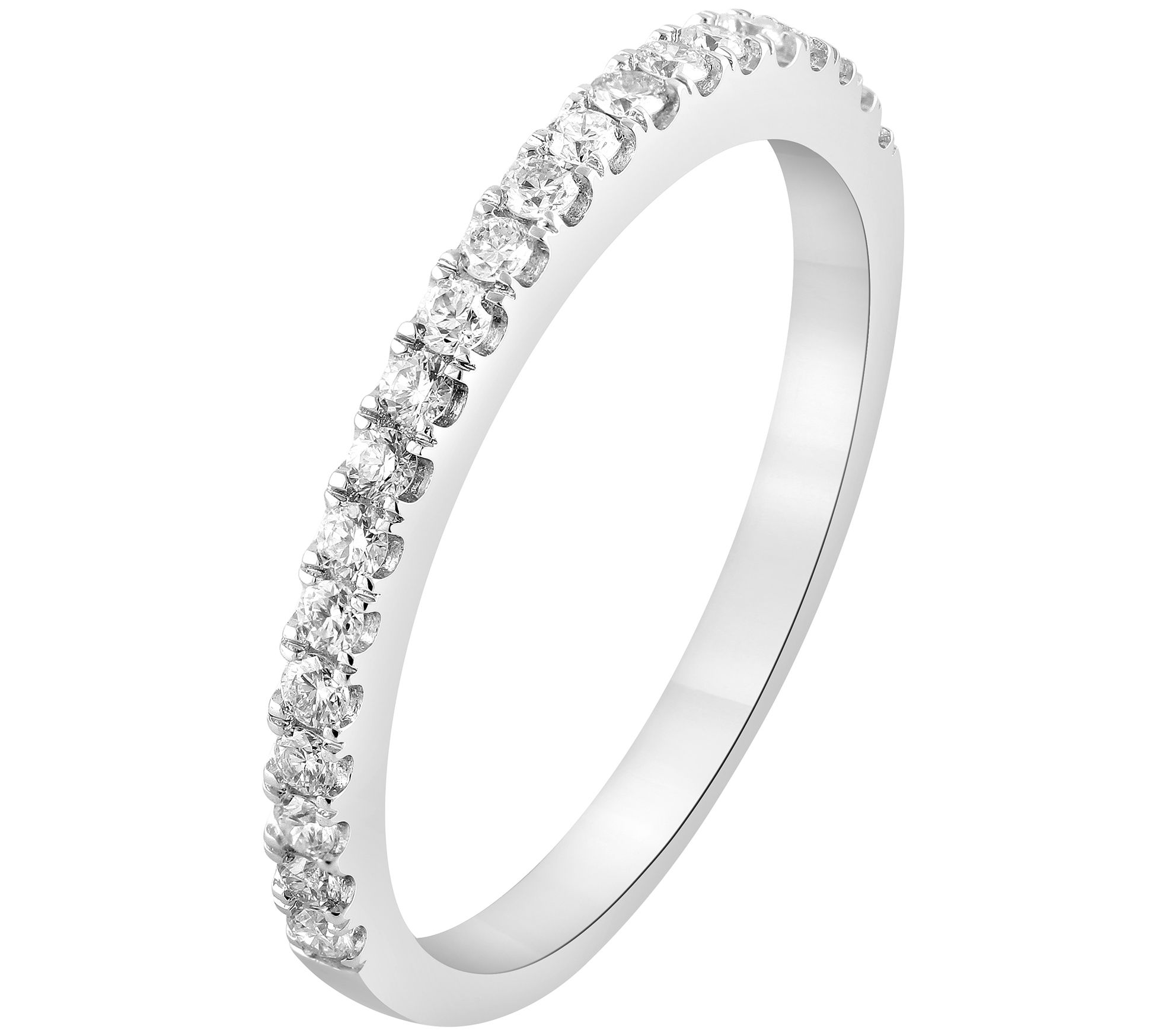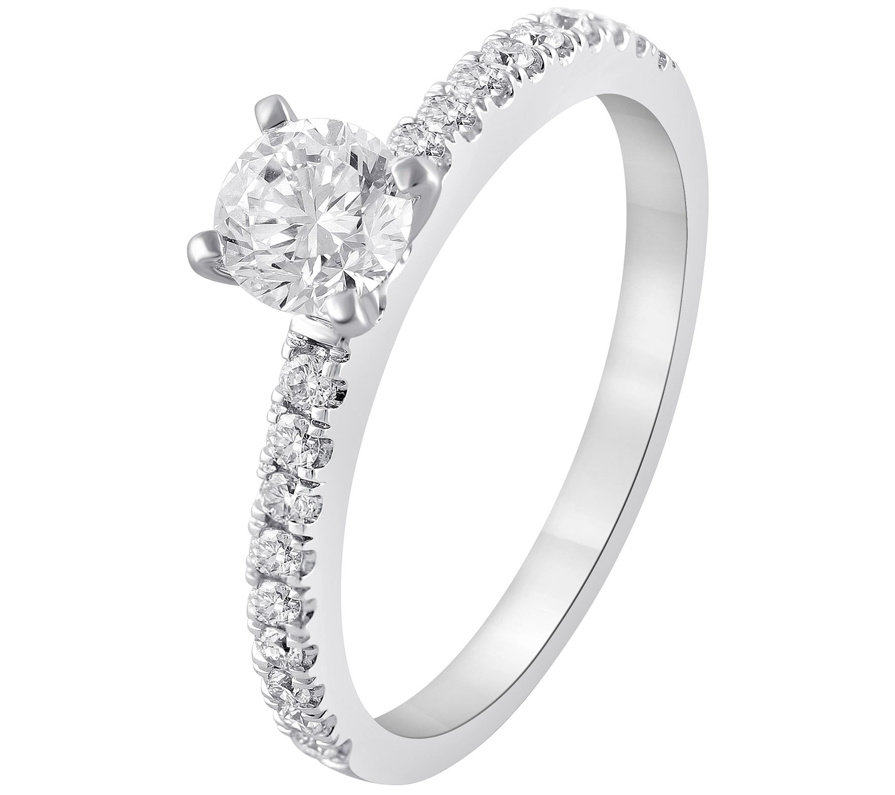 Engagement ring: round, prong-set lab-grown diamond center stone; lab-grown diamonds on bands