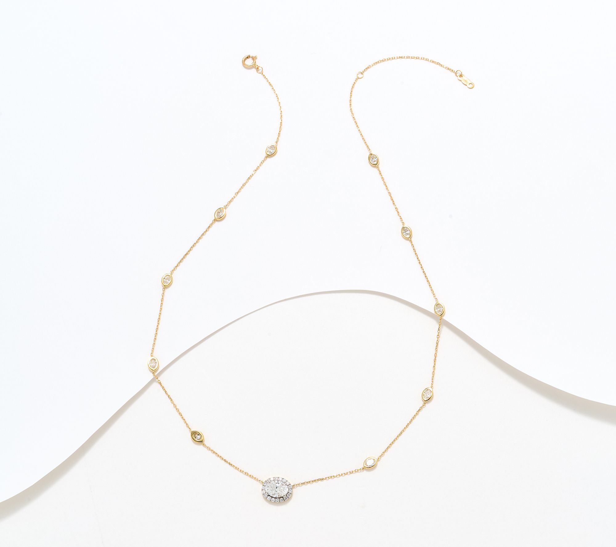 Prong- and bezel-set round and oval-cut lab-grown diamonds; polished cable chain