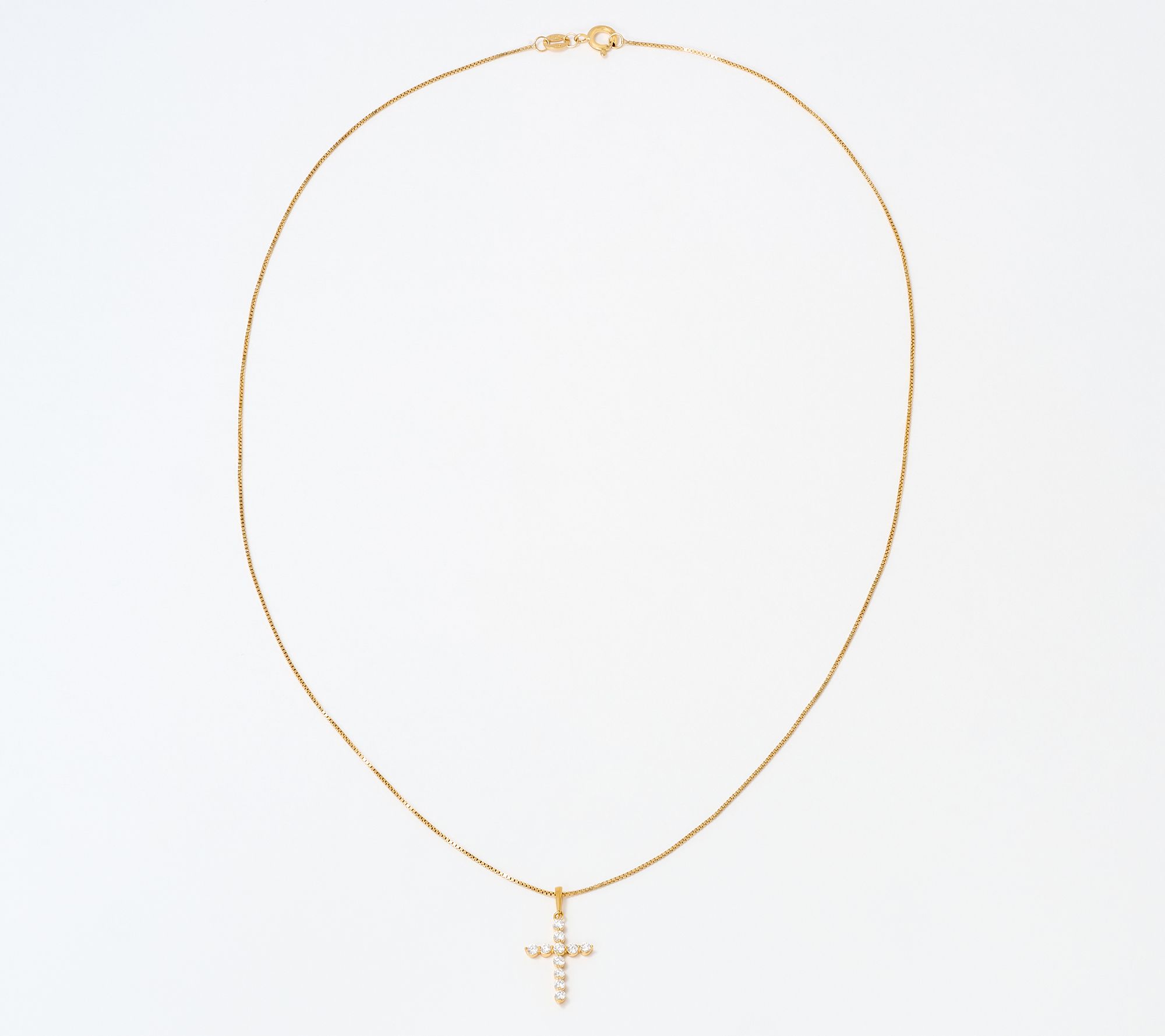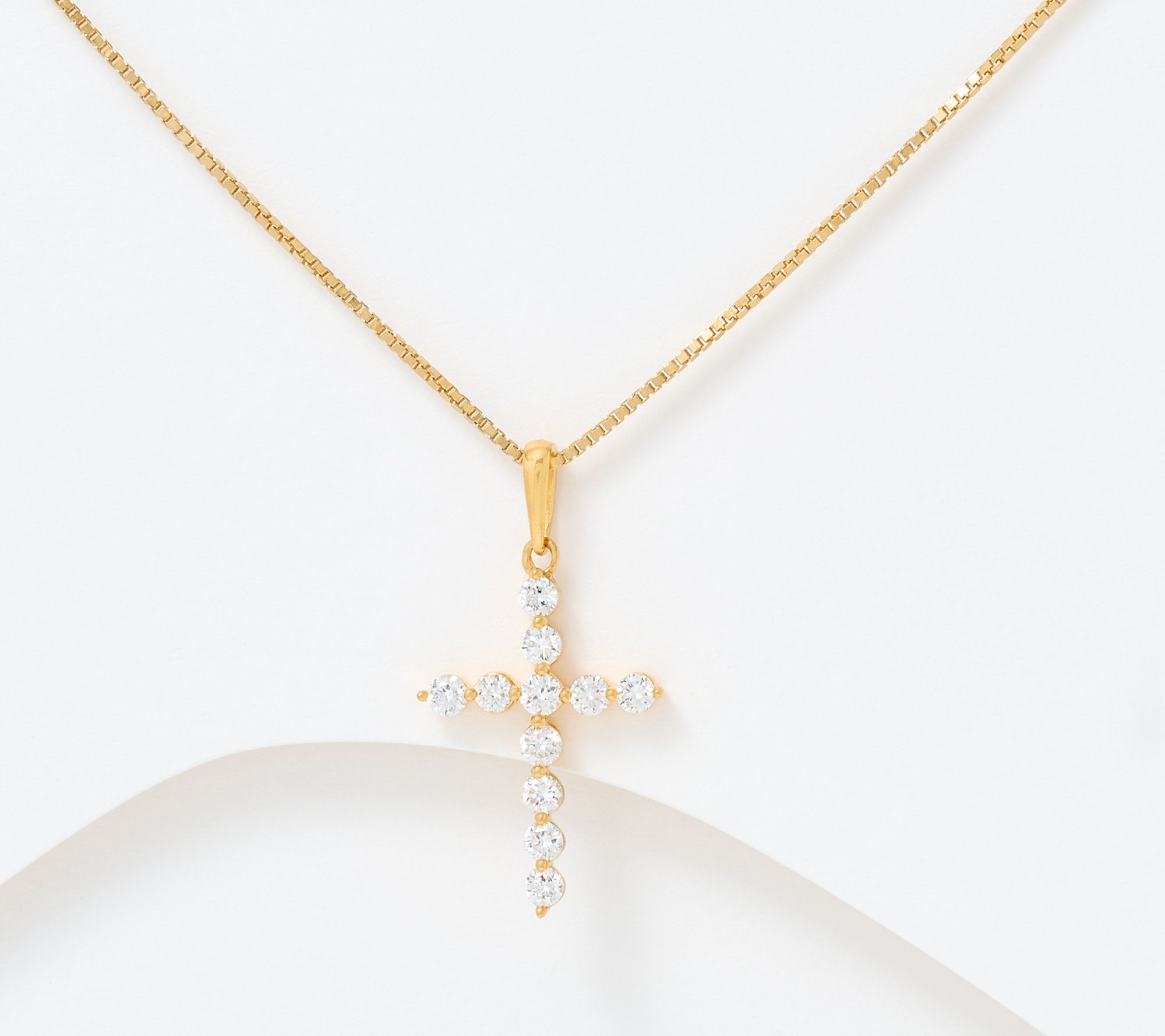 Cross design pendant with full-cut, round lab-grown diamonds; box chain; polished finish