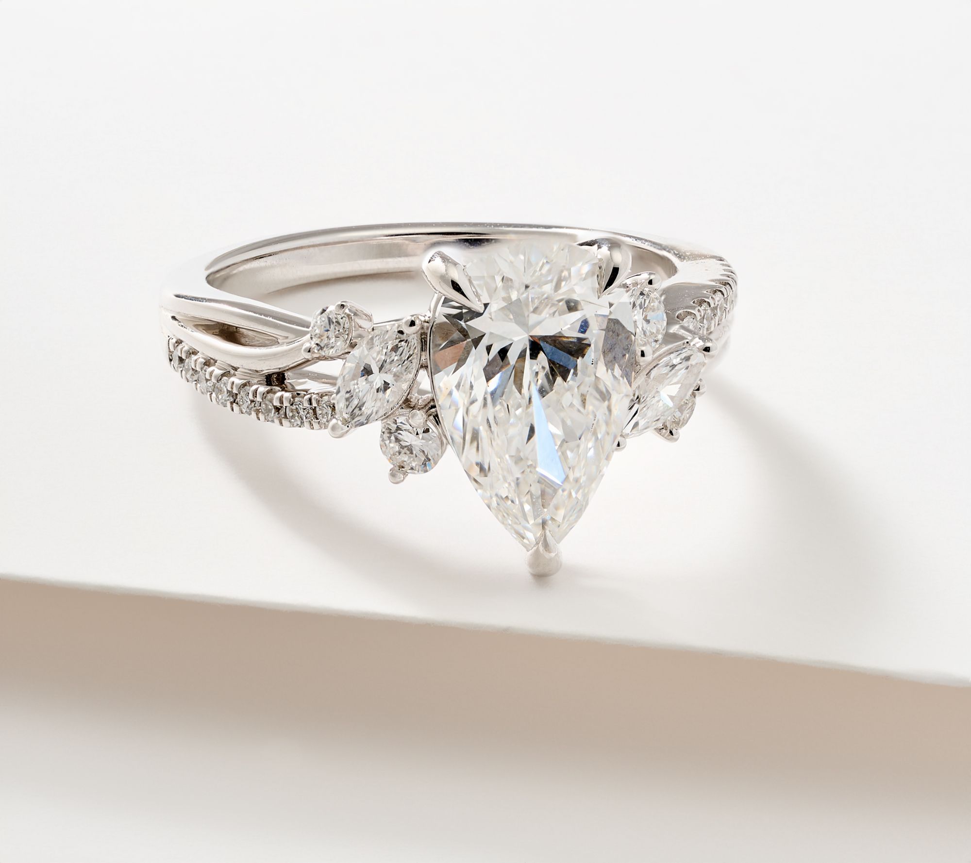 Pear-cut lab-grown diamond; full-cut round and marquise-cut lab-grown diamonds