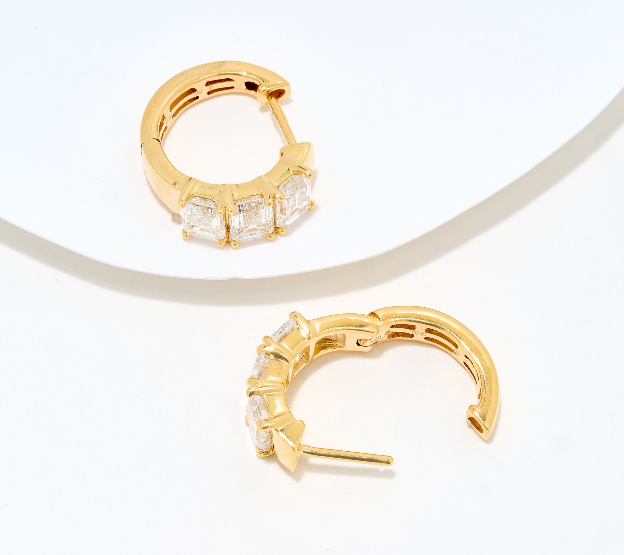 Three sparkling emerald-cut lab-grown diamonds sit gracefully in each sterling silver hoop, lending timeless glamour to your favorite looks. These hoop earrings shine at any occasion -- from brunch dates to evening celebrations -- and elevate both casual and dressy ensembles. From Fire Light Lab Grown Diamond Jewelry.