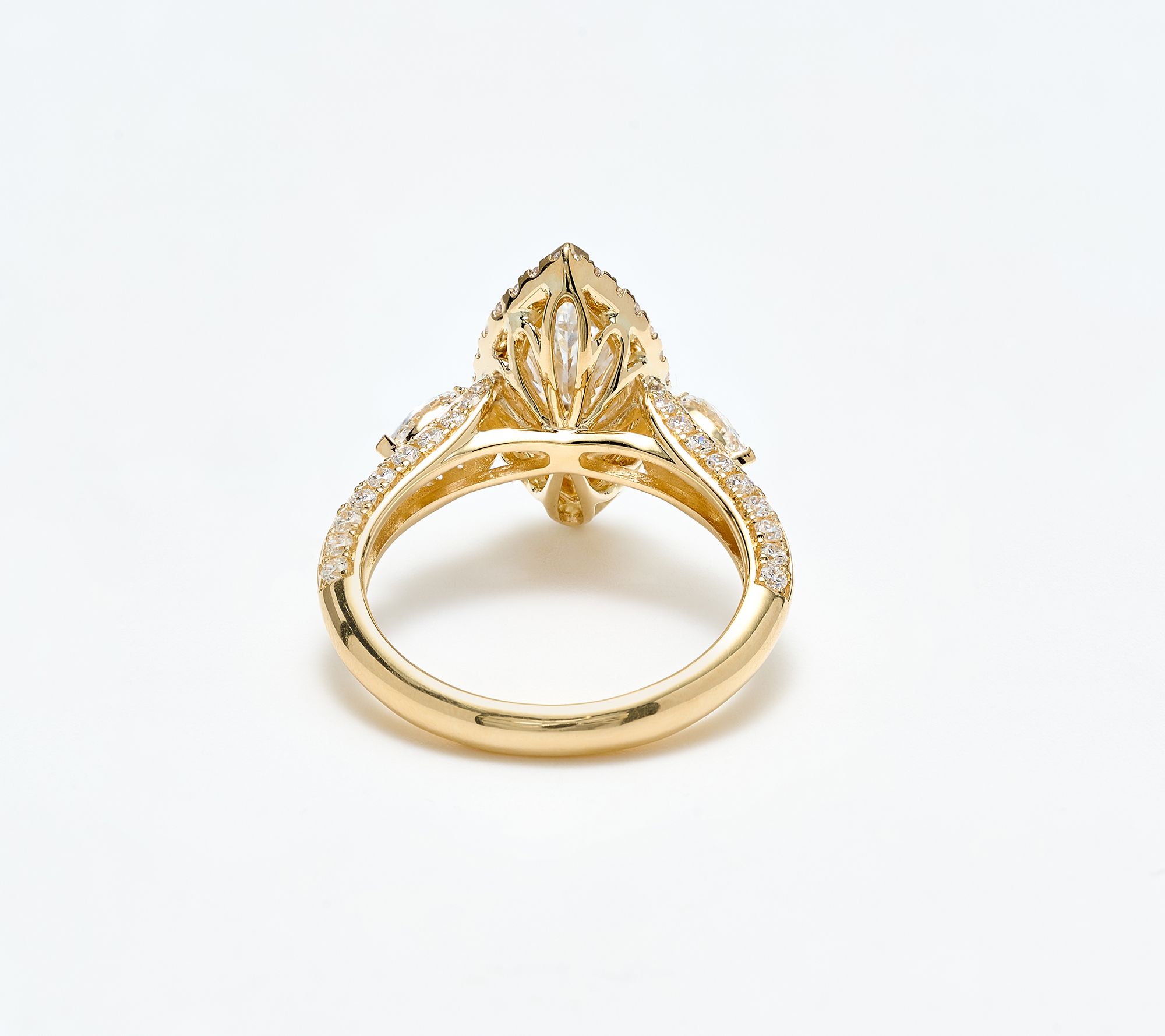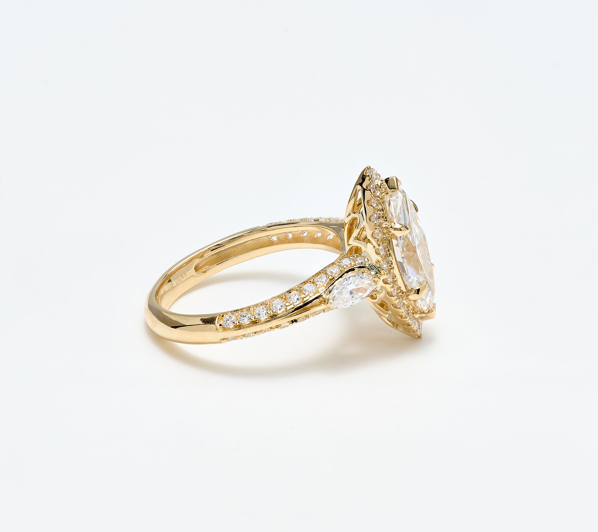 Prong and chevron-set marquise-cut lab-grown diamond center with marquise-cut lab-grown diamond accents and round lab-grown diamonds in halo and side settings