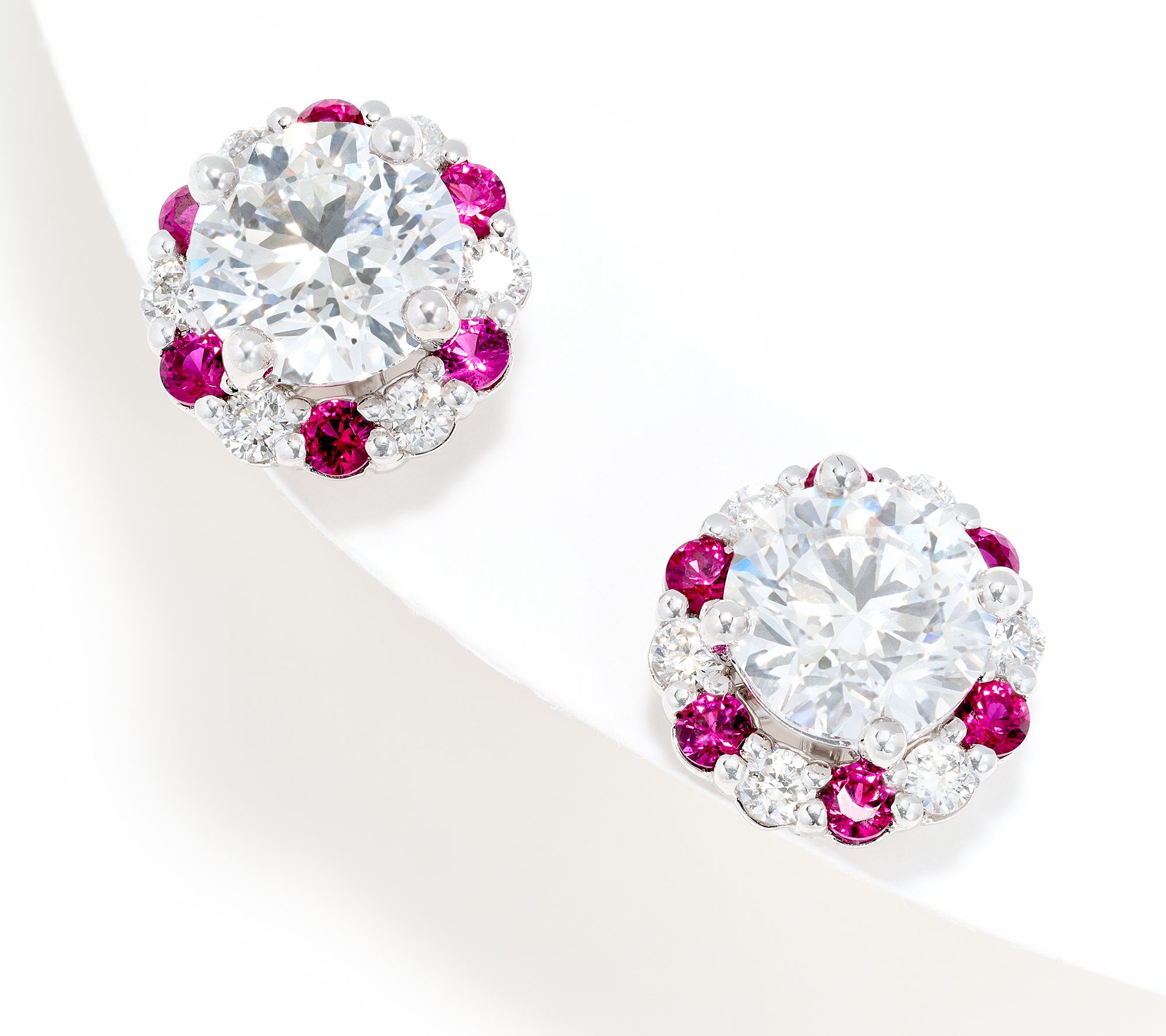 Prong-set, round lab-grown white diamonds and round lab-created gemstones; white rhodium plating