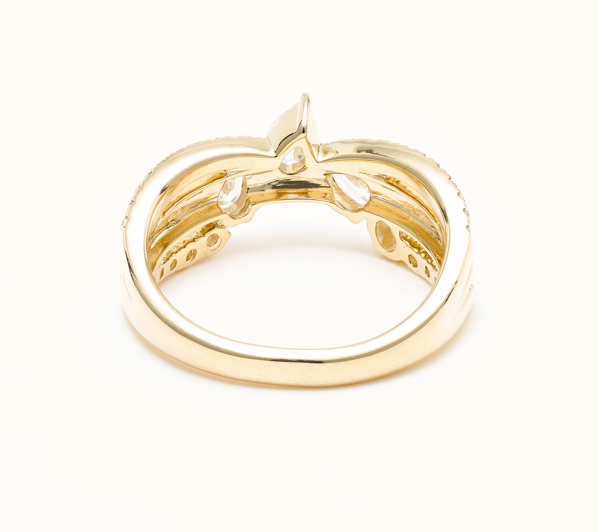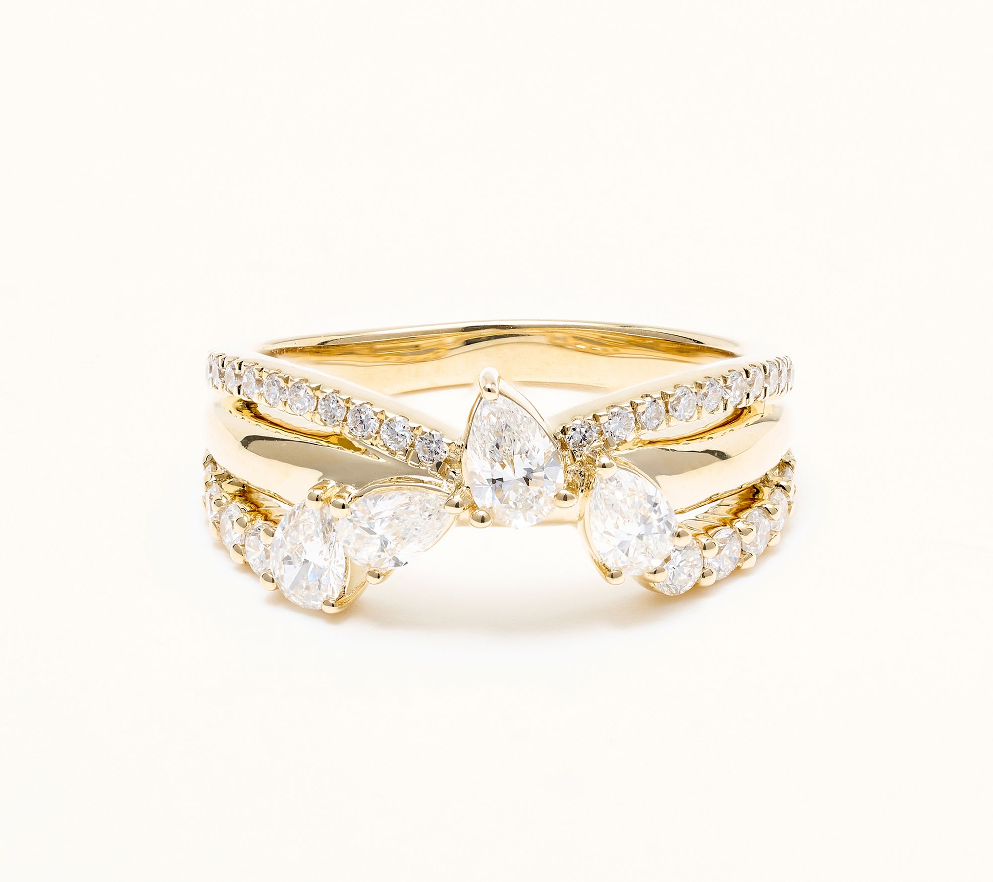 Three-row design; cluster of pear-shaped lab-grown diamonds in center; round lab-grown diamonds on shank; polished finish