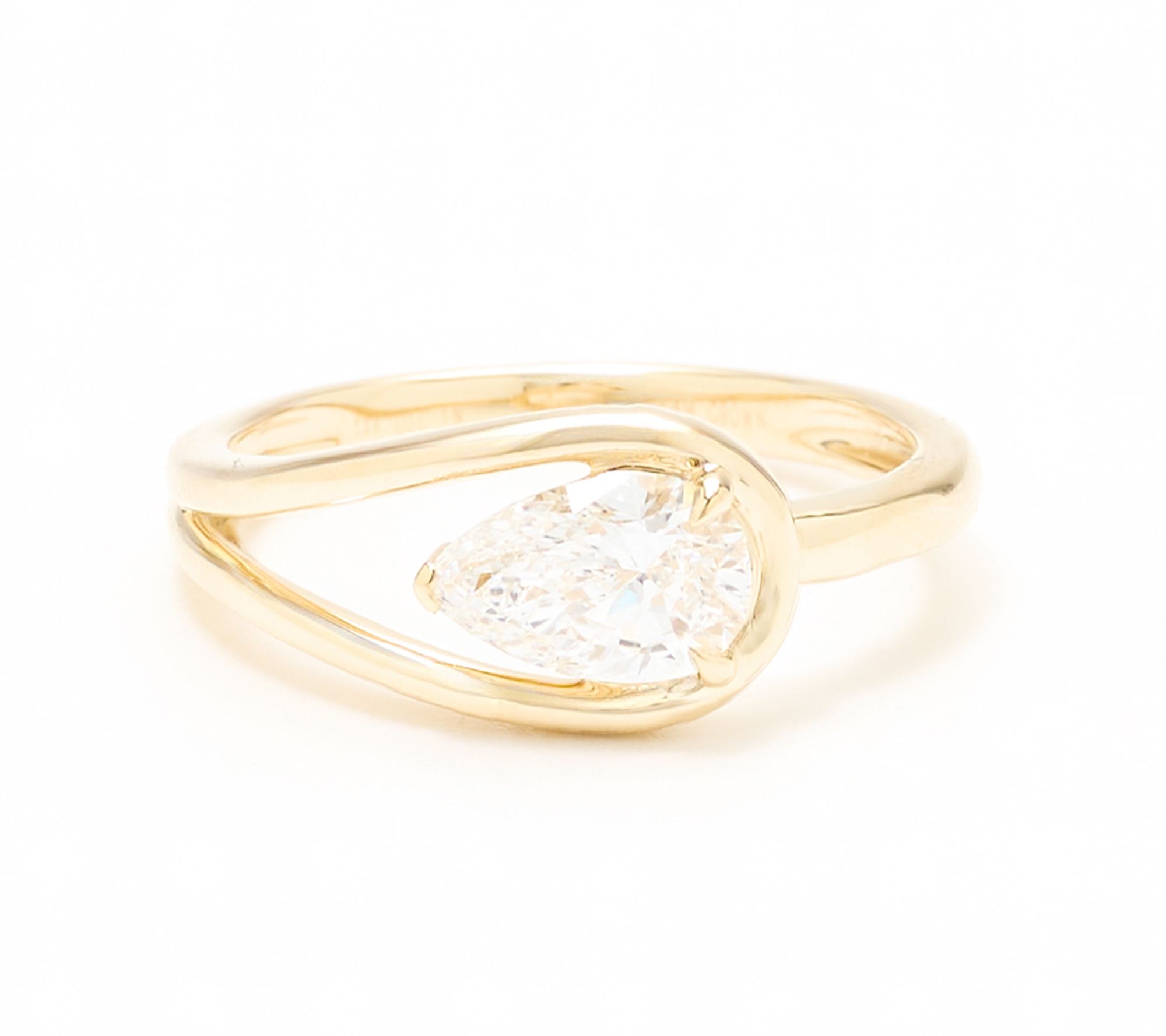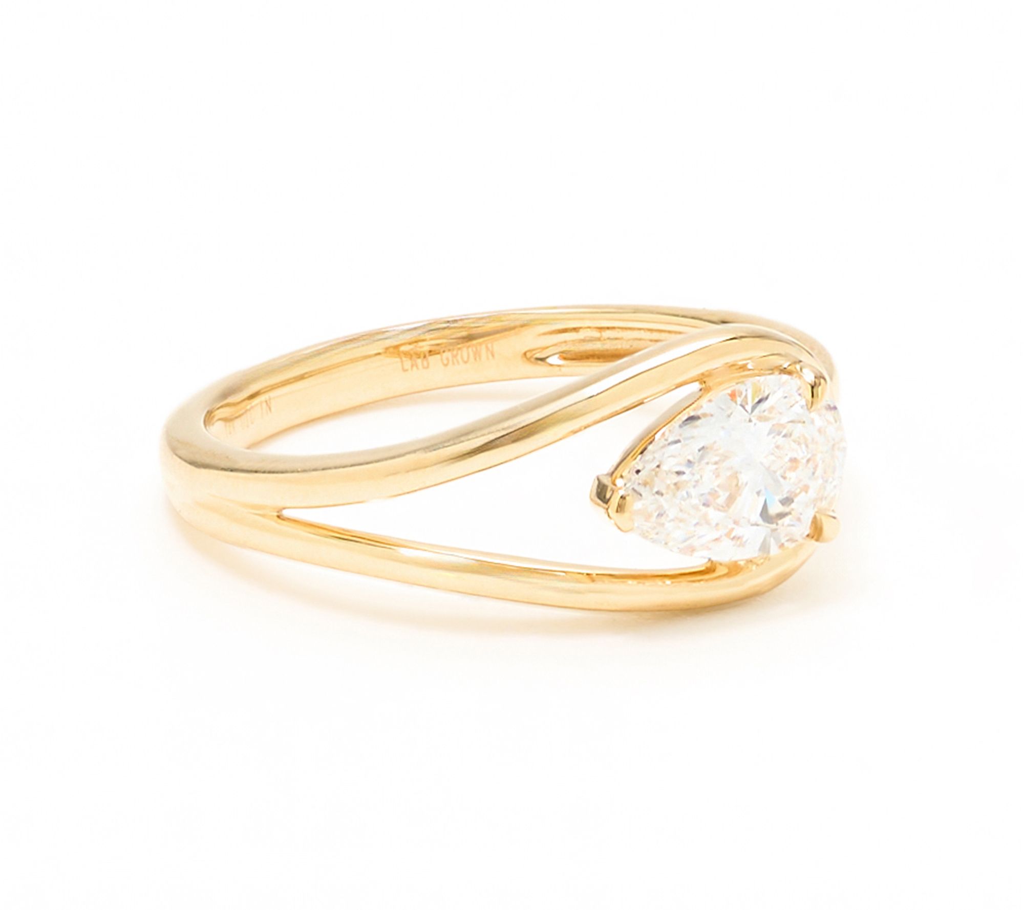 Prong and chevron-set pear-shaped lab-grown diamond solitaire in east-west orientation