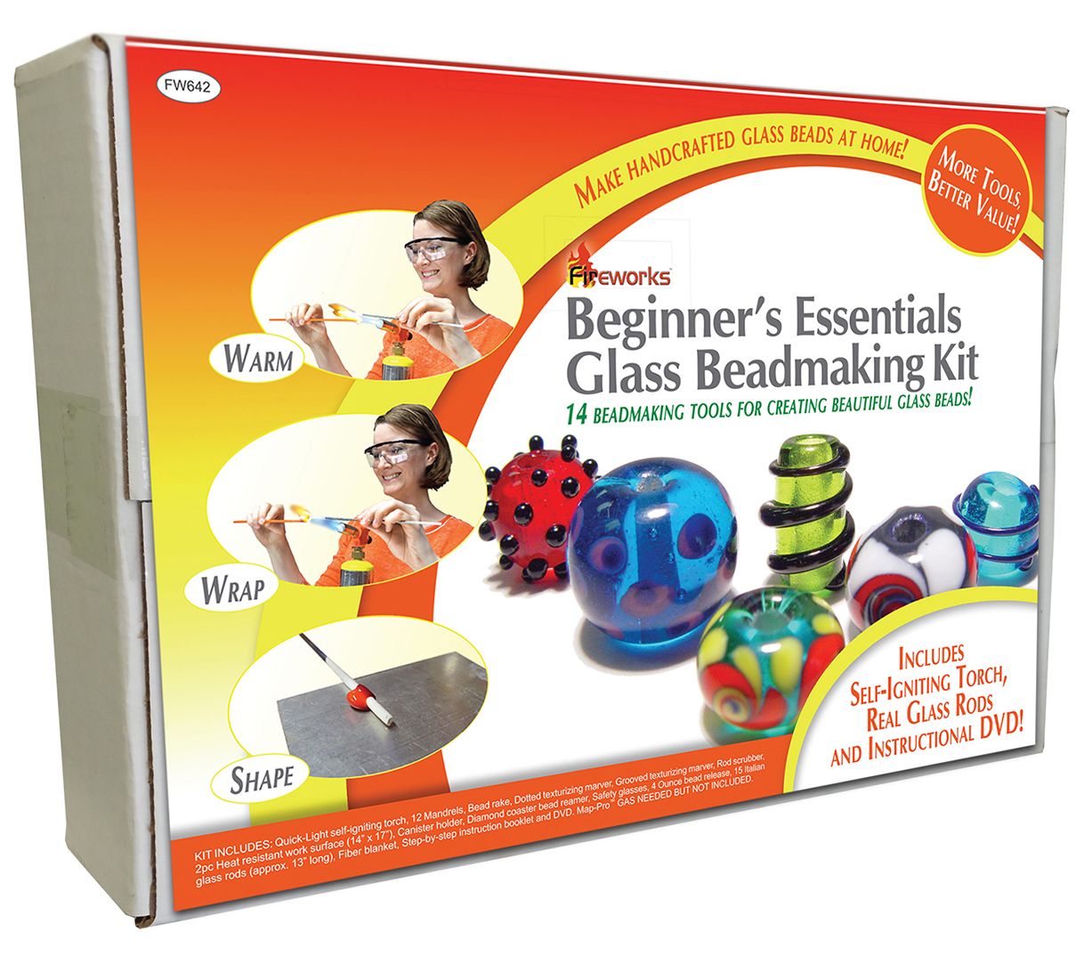 • Includes quick-light self-igniting torch, twelve mandrels, bead rake, dotted texturizing marver, grooved texturizing marver, rod scrubber, 2-piece heat resistant work surface, canister holder, diamond coated bead reamer, pair of safety glasses, 4-oz bottle of bead release, twelve Italian glass rods, fiber blanket, and step-by-step instruction booklet and DVD