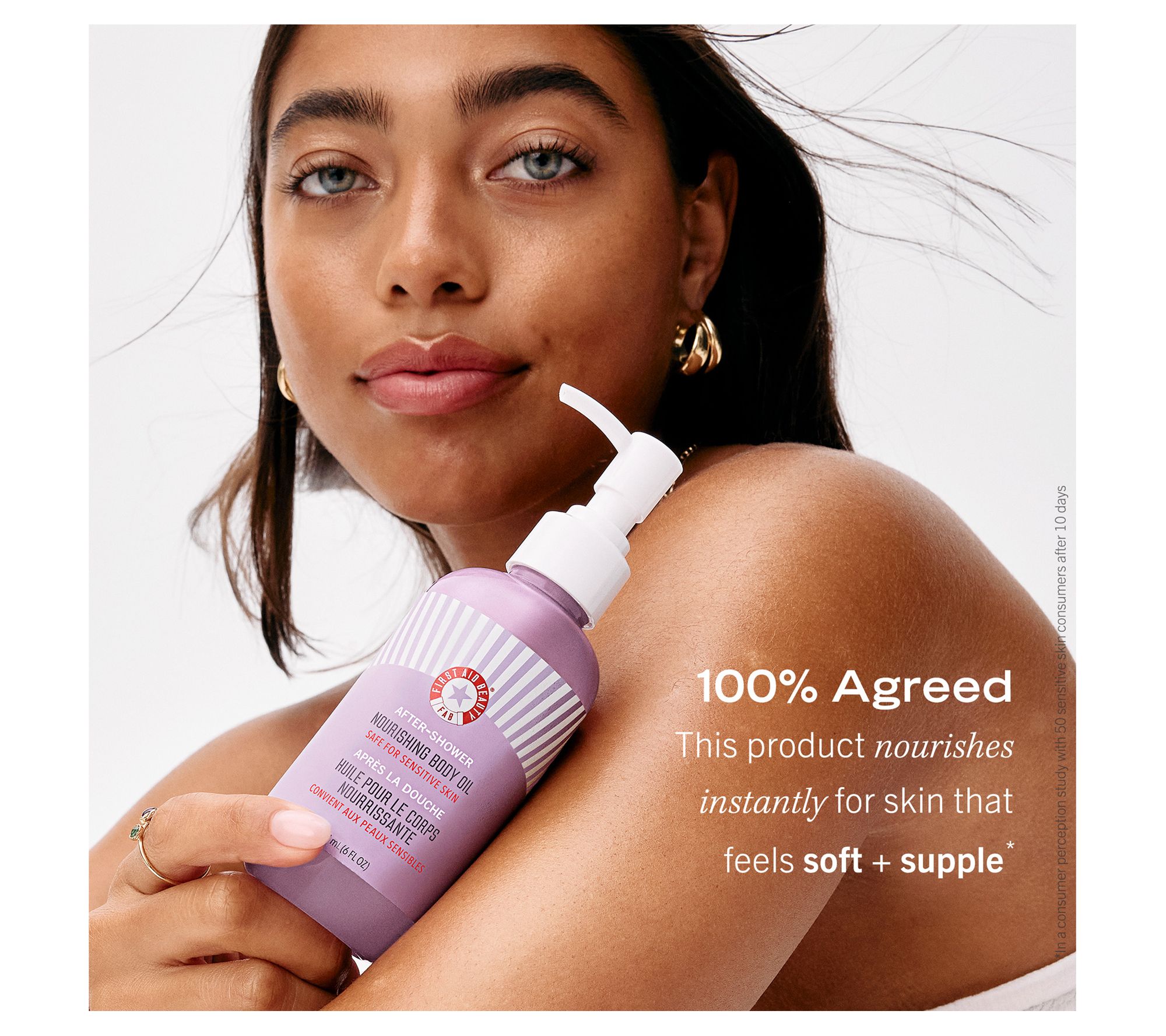 After-Shower Nourishing Body Oil from First Aid Beauty is a fast-absorbing, lightweight but luxurious body oil that hydrates skin post-shower, leaving it appearing silky smooth and soft. Formulated with oils, this formula hydrates to nourish the skin for a healthy-looking glow. The oils impart a crisp tangerine aroma.