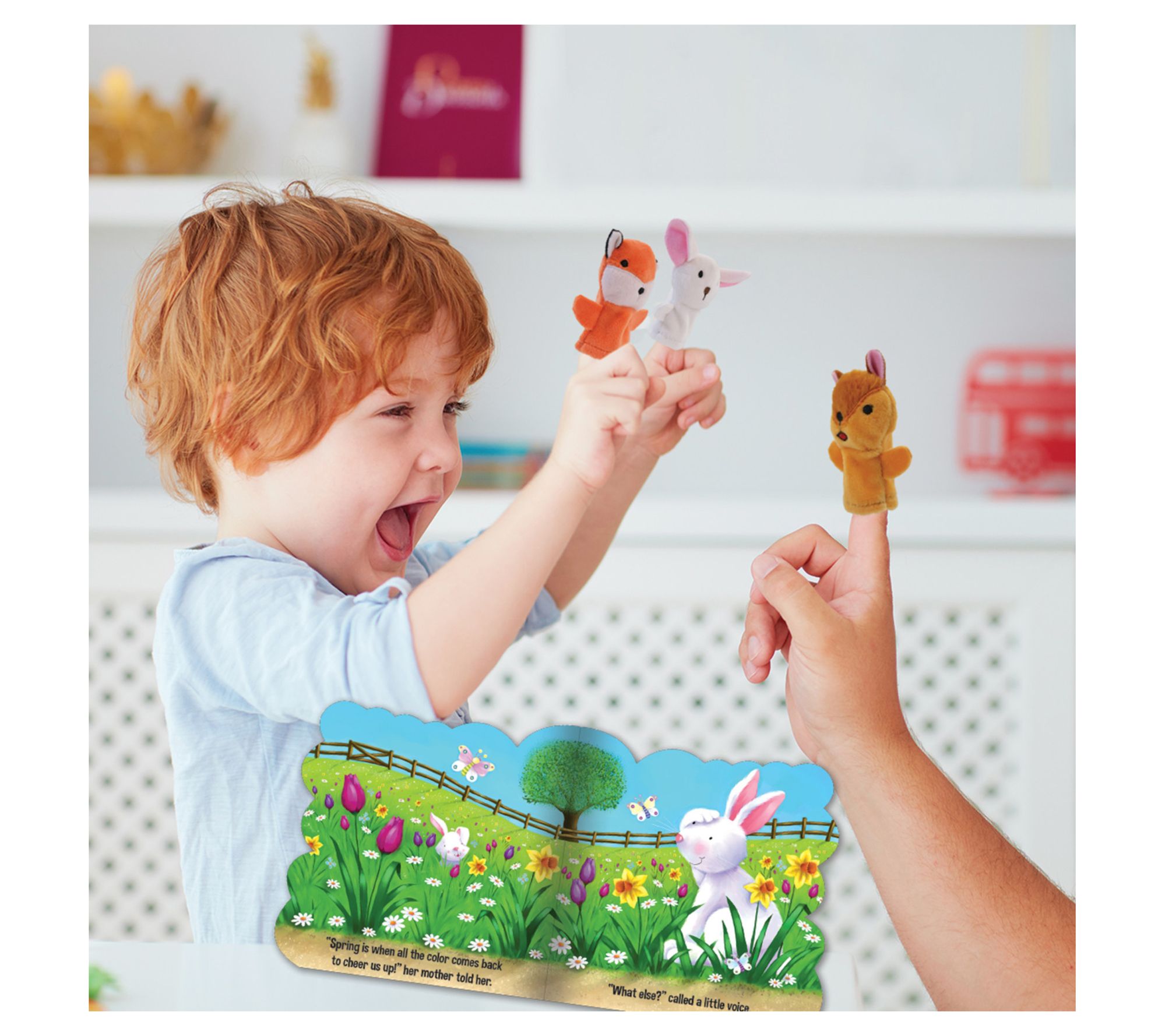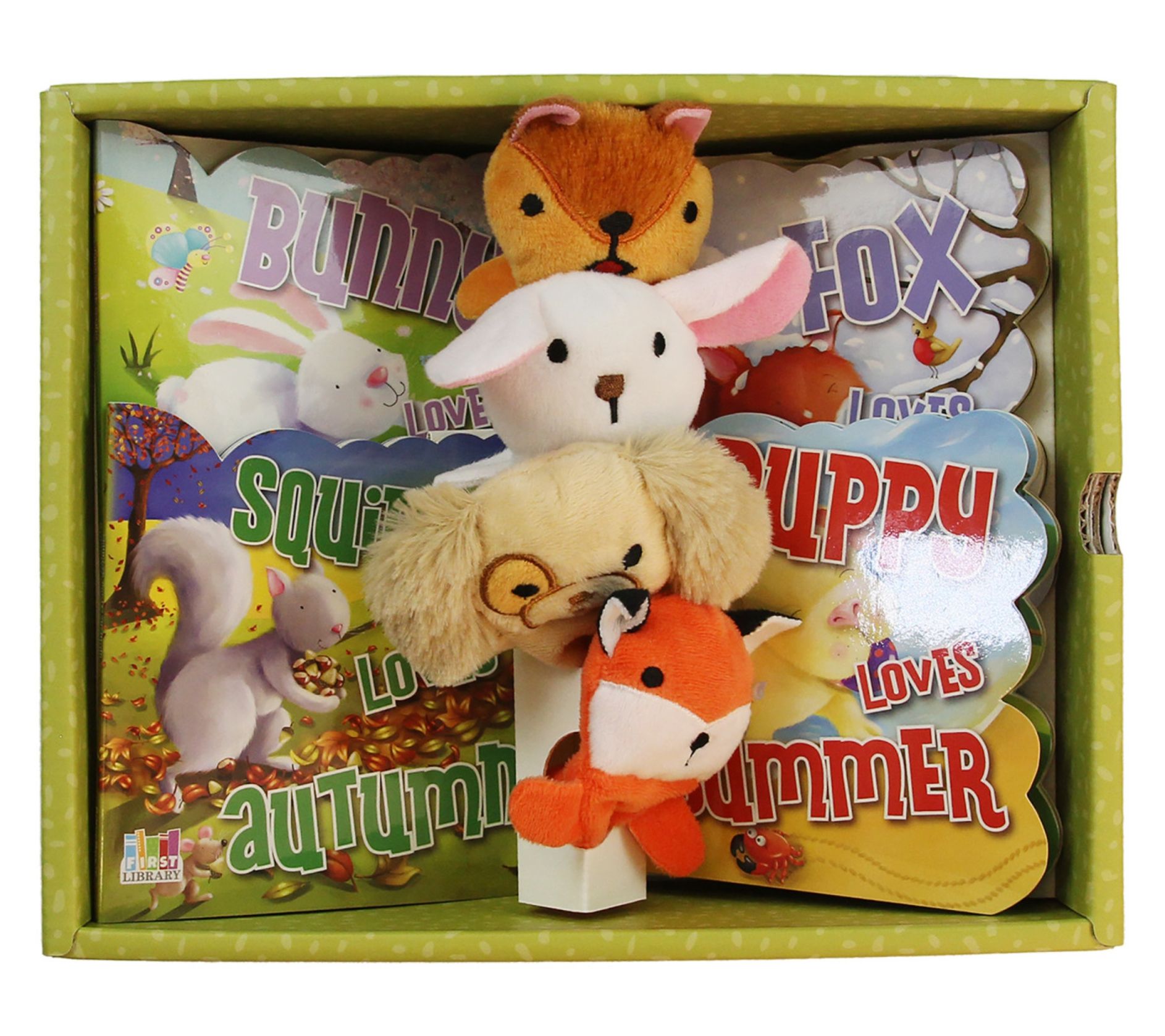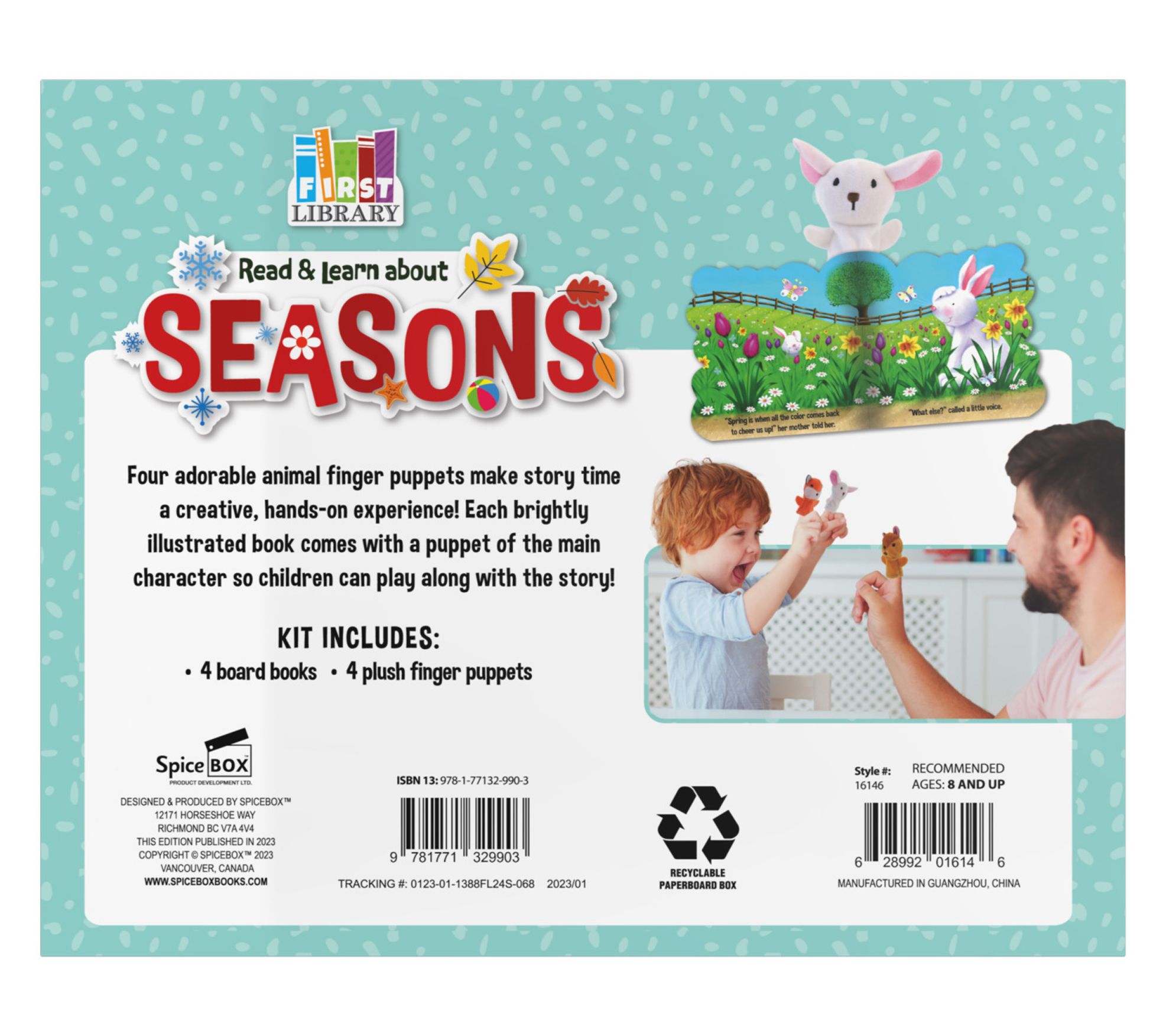 Transform story time into a captivating adventure with the First Library Spicebox Four Seasons Set. Each book in this charming collection features vibrant illustrations and engaging die-cut designs that represent Winter, Spring, Summer, and Fall. Enhance the storytelling experience with four adorable finger puppets -- each character ready to spring to life and delight young readers. Perfect for children aged four and up, this set promises to enliven imaginations and create memorable reading moments. From First Library.