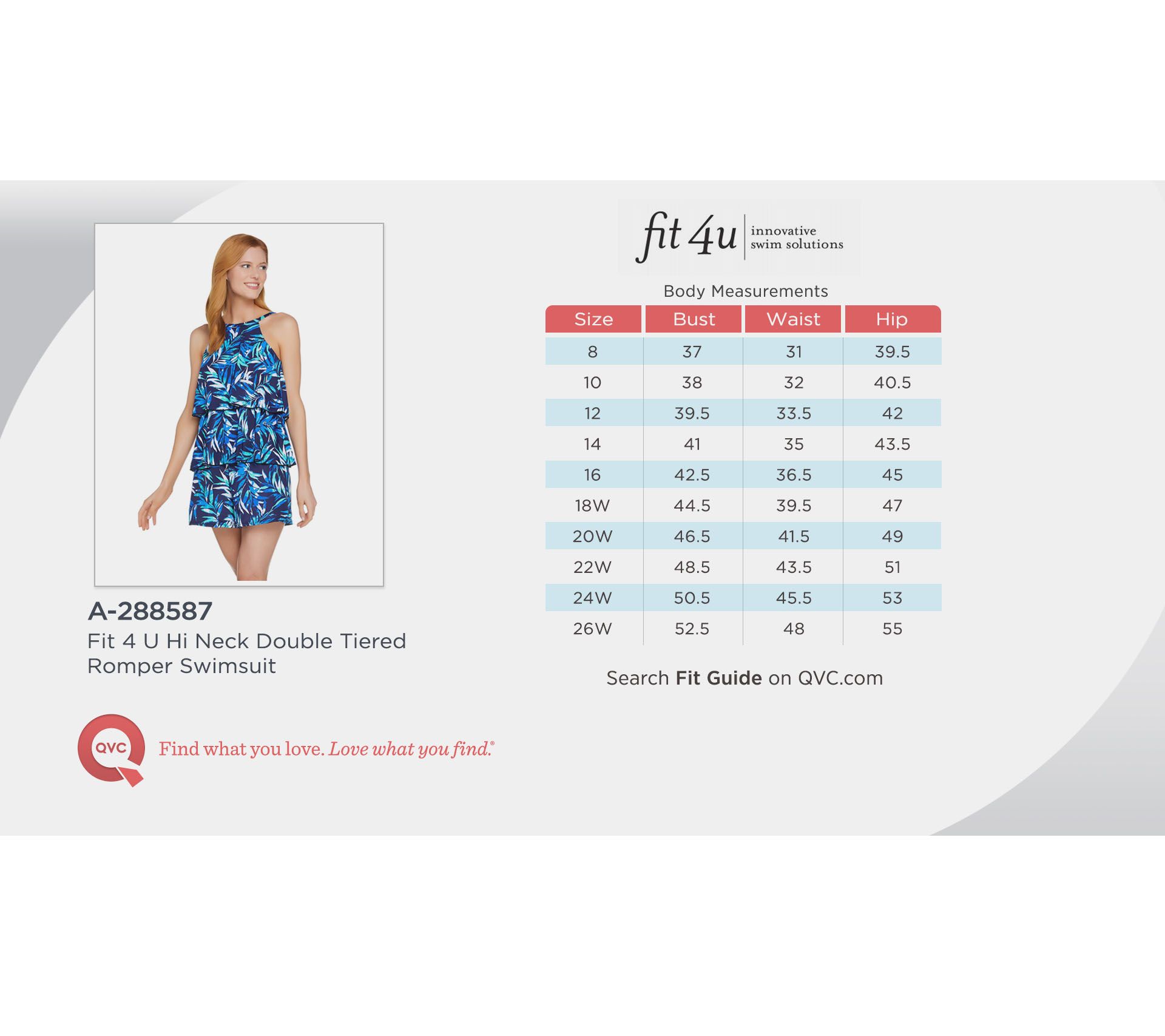 Fit: 8 fits bust 37", waist 31", hip 39-1/2"; 20W fits bust 46-1/2", waist 41-1/2", hip 49"