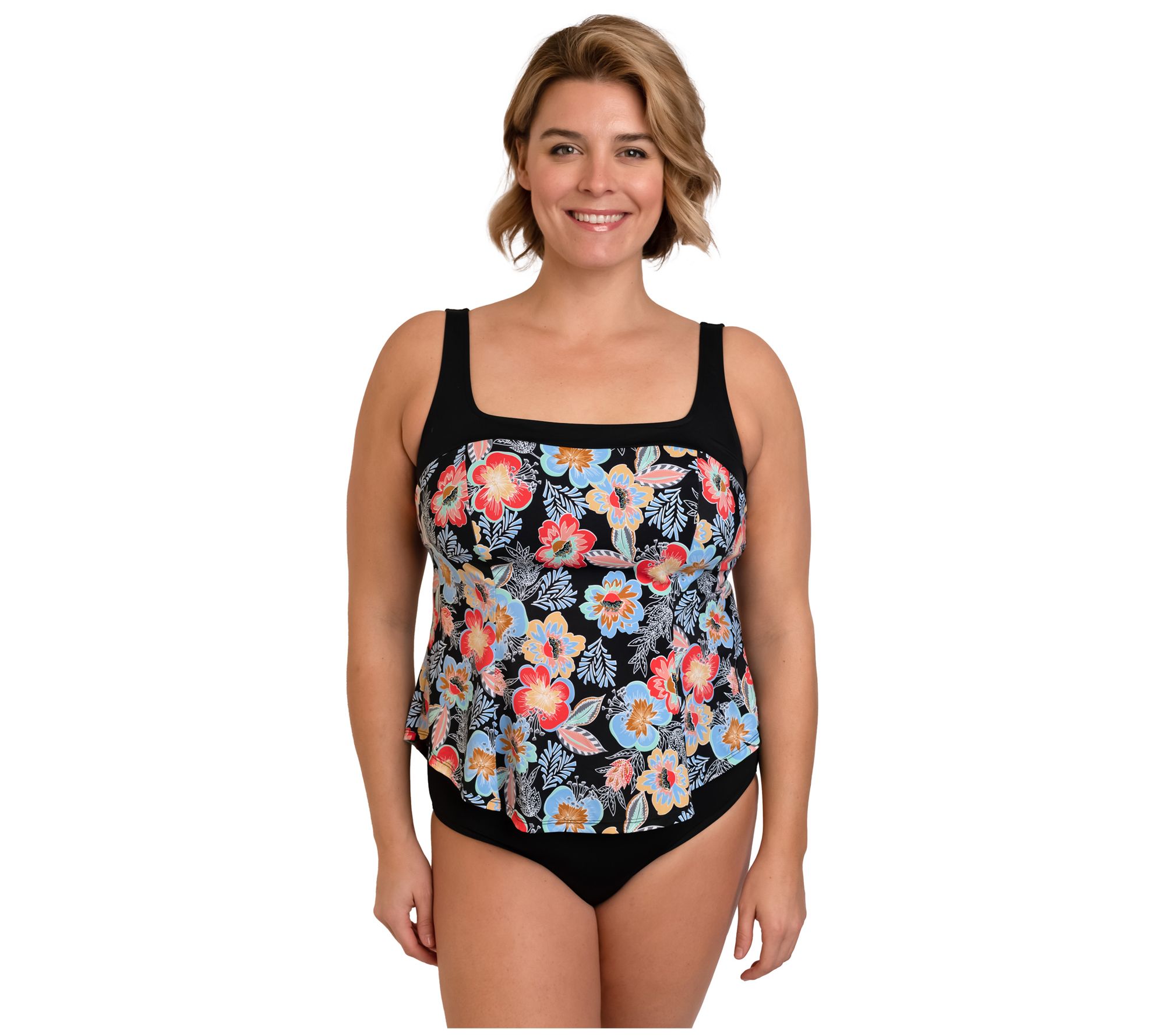 Enjoy comfort and style while soaking up the sun at the beach or pool in this colorful swim top charmed with a flattering square neck and adjustable wide straps. From Fit 4 U.