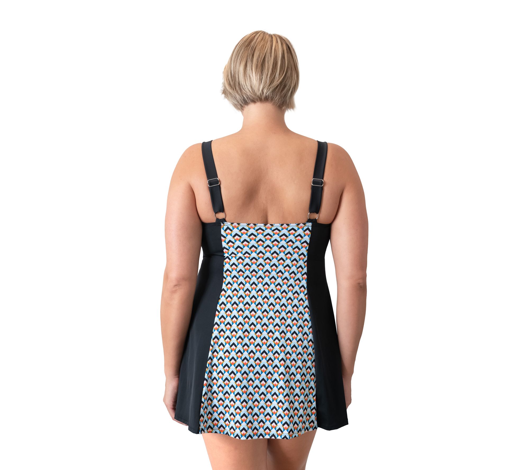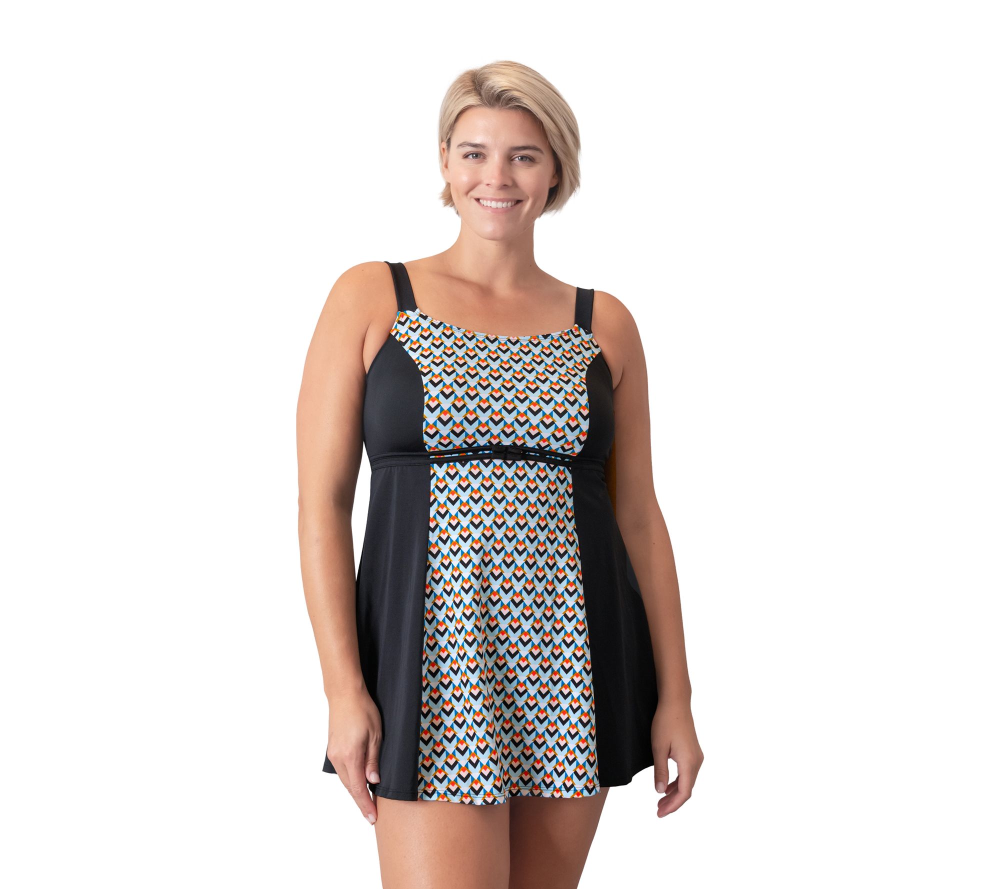 Update your swimwear collection with this dress-style one-piece suit that features a geometric print, dainty bow details, and sewn-in soft cups for day-long comfort and support. From Fit 4 U.