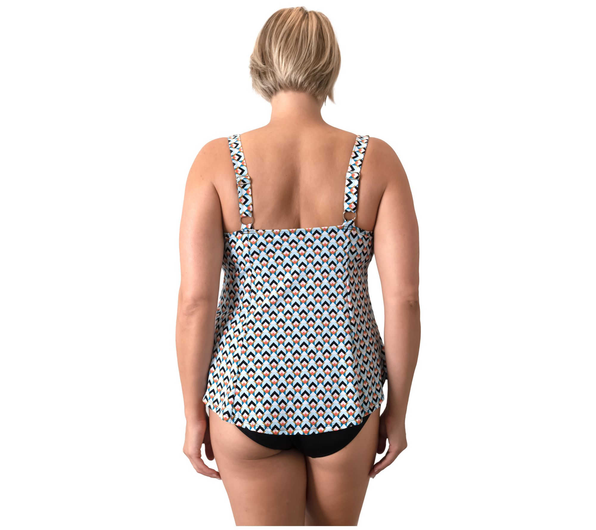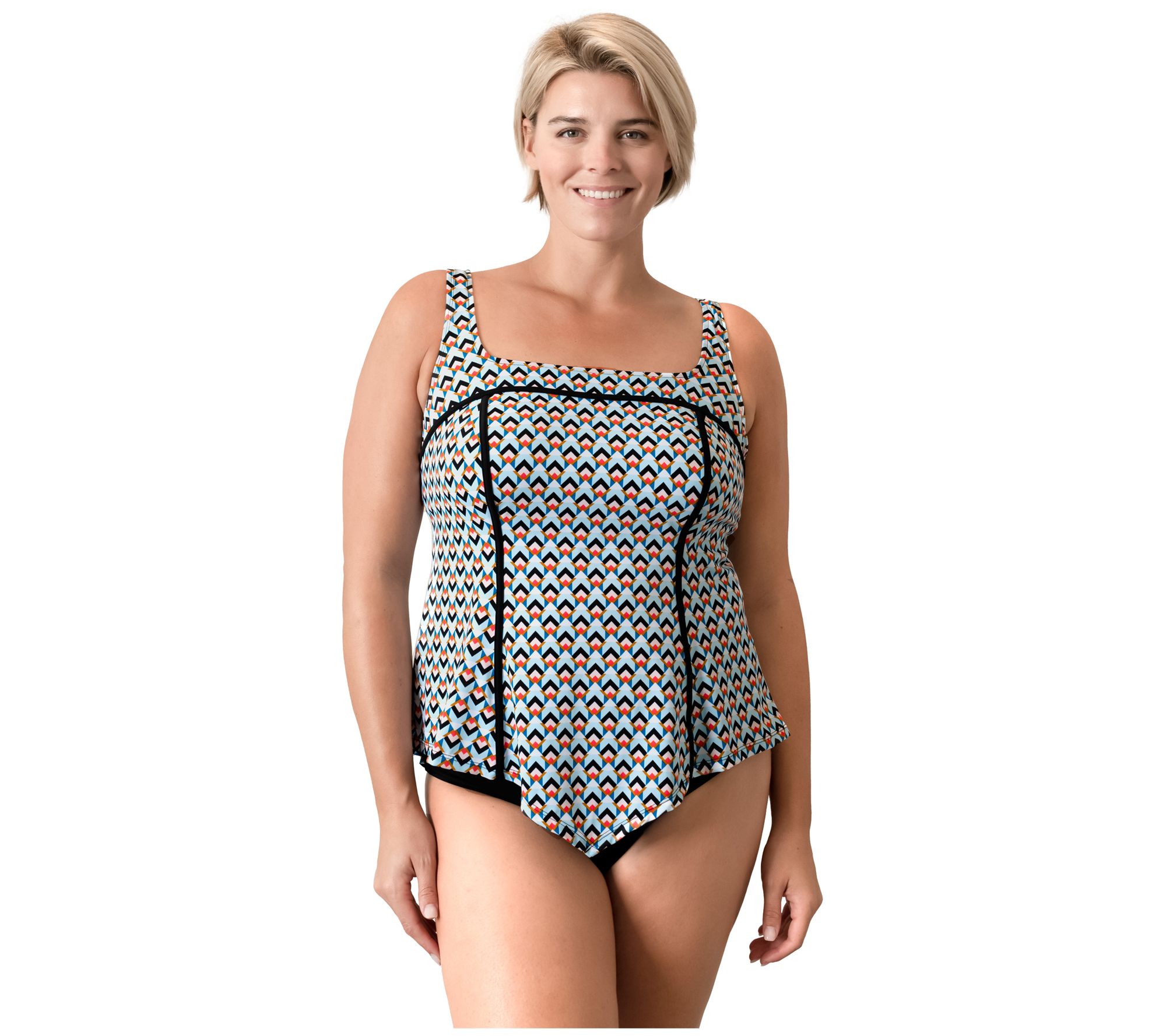 • Features: tankini, square neck, sewn-in supportive cups, V-hem, contrasting princess seam lines, adjustable straps