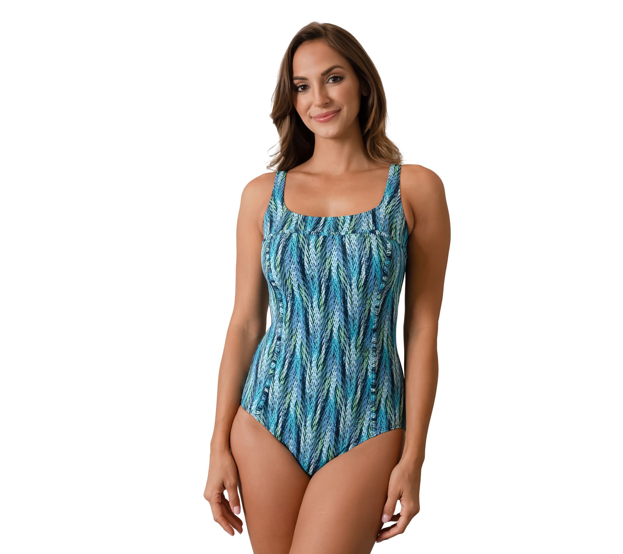 Enjoy comfortable support in this shapely swimsuit featuring sewn-in cups and tummy control. From Fit 4 U.