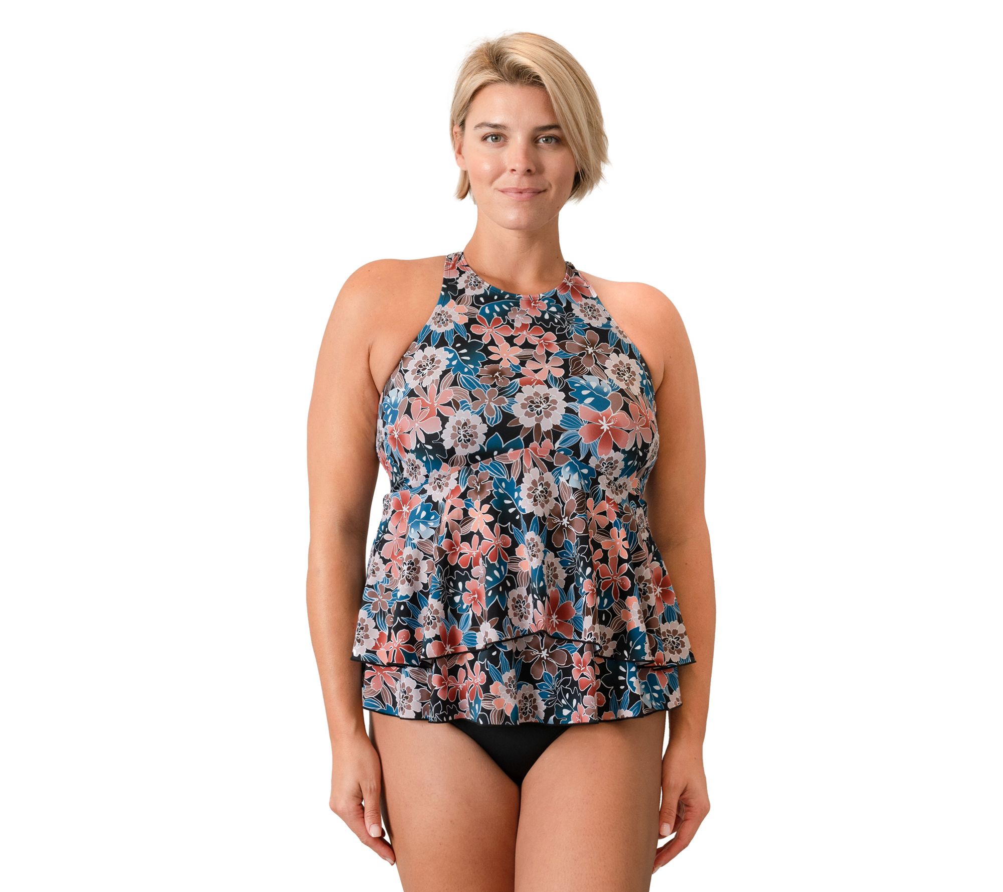 Offering a high neckline and stunning contemporary style that flatters, this two-tiered babydoll swim top keeps you looking and feeling great whether you're hitting the waves or lounging by the pool. From Fit 4 U.
