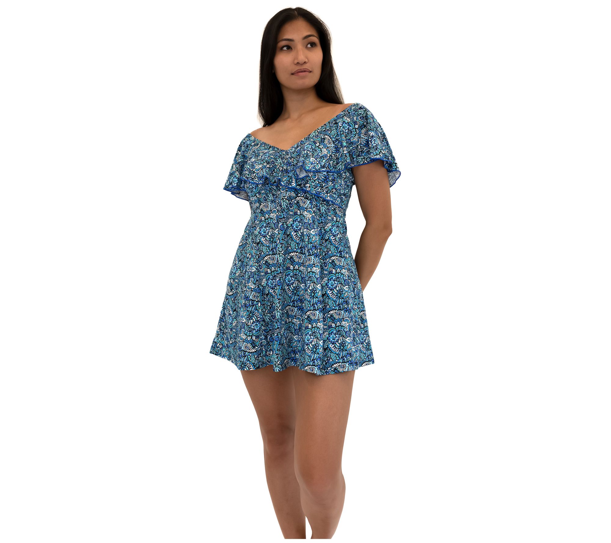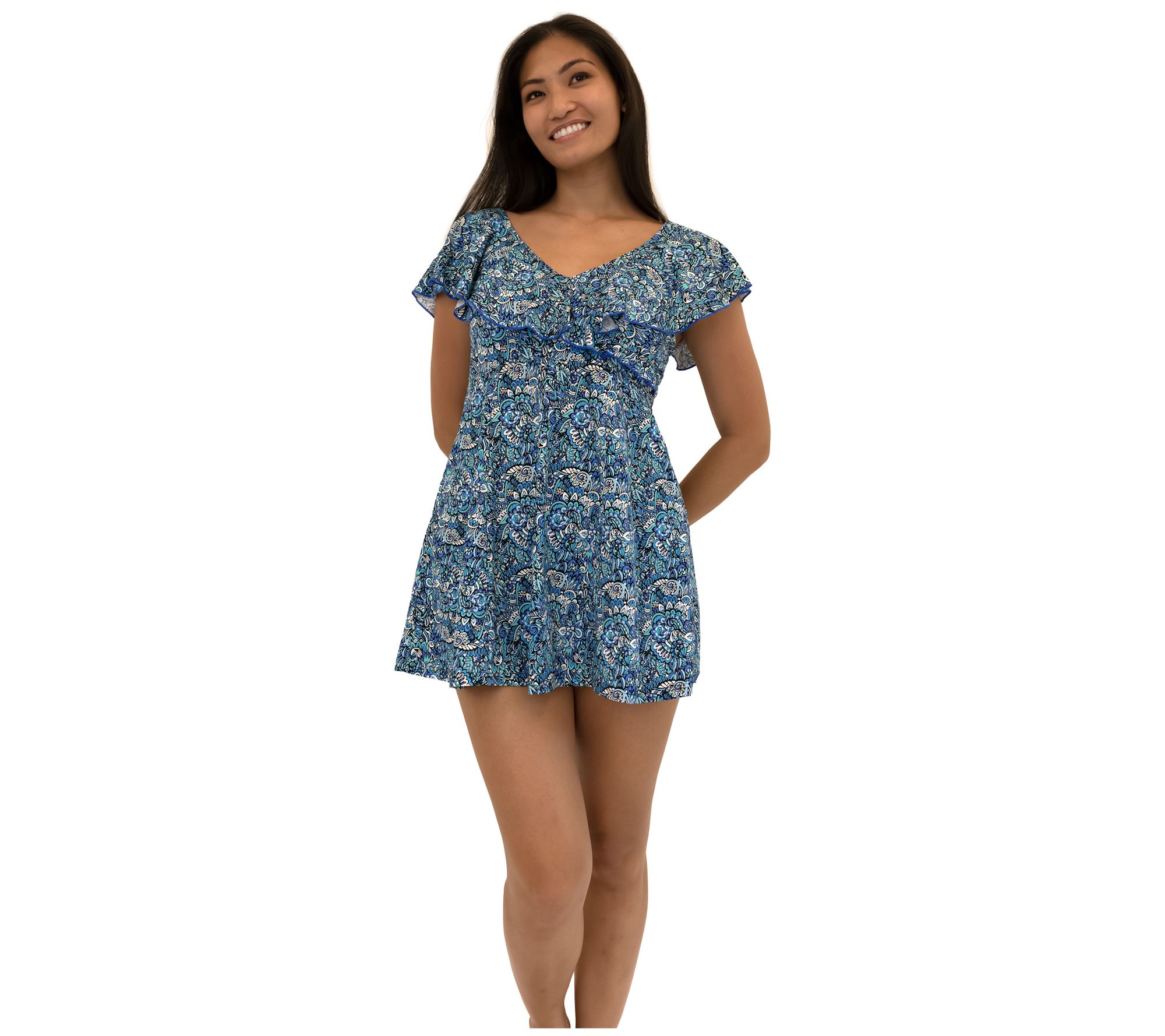 Enjoy the sun, surf, and sand in total confidence with this Aquarius sleeved surplice empire swim dress. From Fit 4 U.