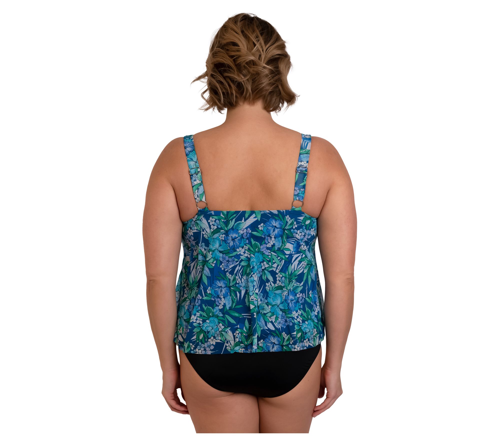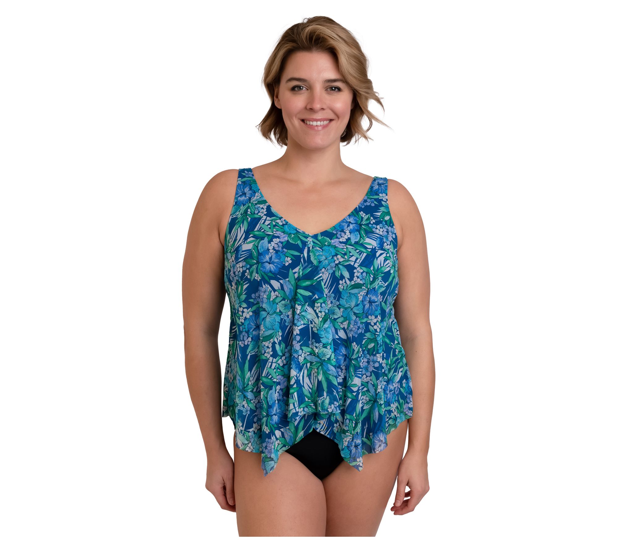 Add a little extra coverage to your ensemble when it's time for all-day fun in the sun with this stretch-blend swim top that boasts adjustable straps and sewn-in soft cups for support and comfort. A V-neck, handkerchief hem, and allover print finish it off with a modish touch. From Fit 4 U.