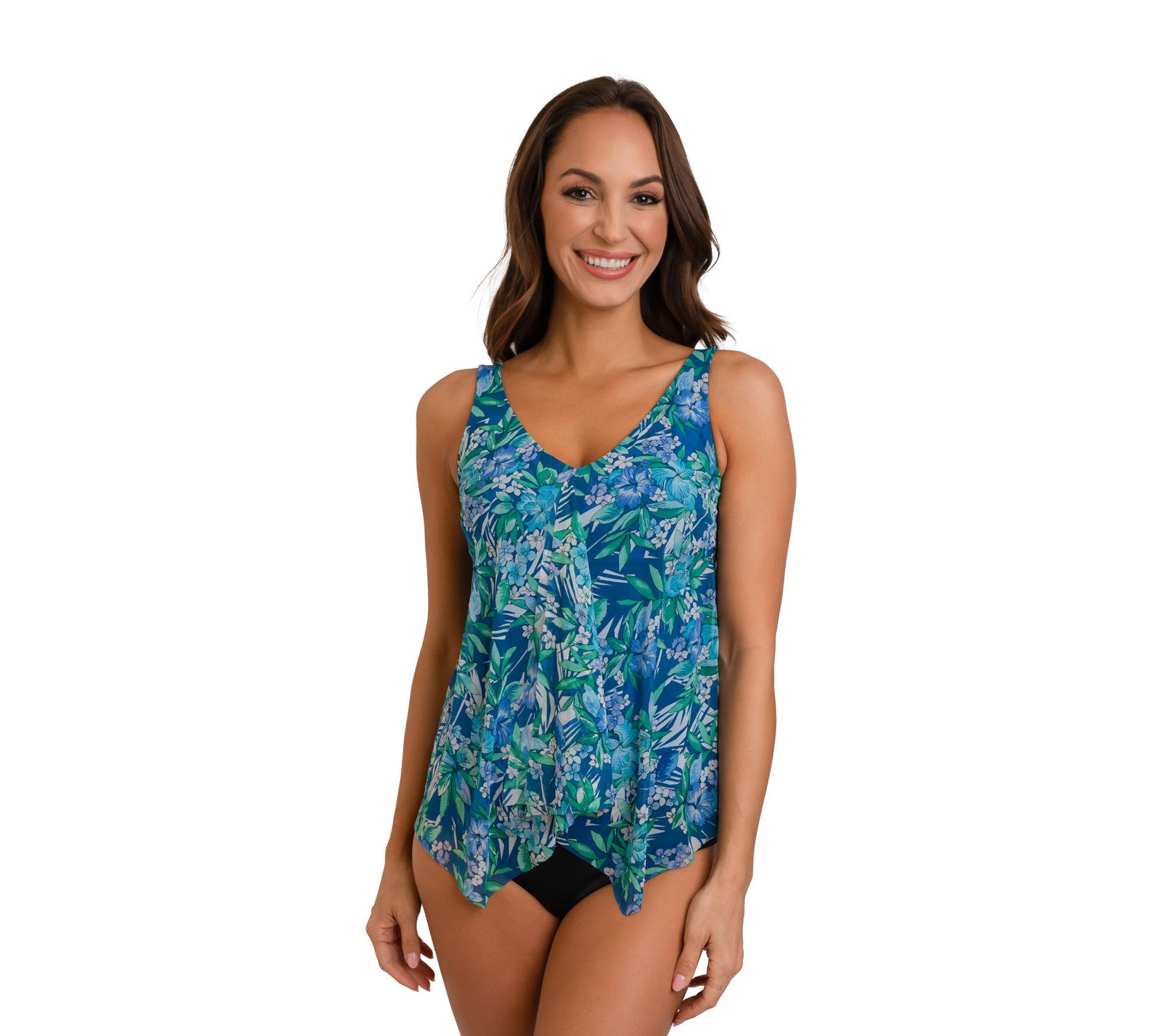 Feminine and flattering with its tropical floral print and handkerchief hemline, this comfortable swim top is perfect for adding a splash of flirty style to your poolside lounging or day at the beach. From Fit 4 U.