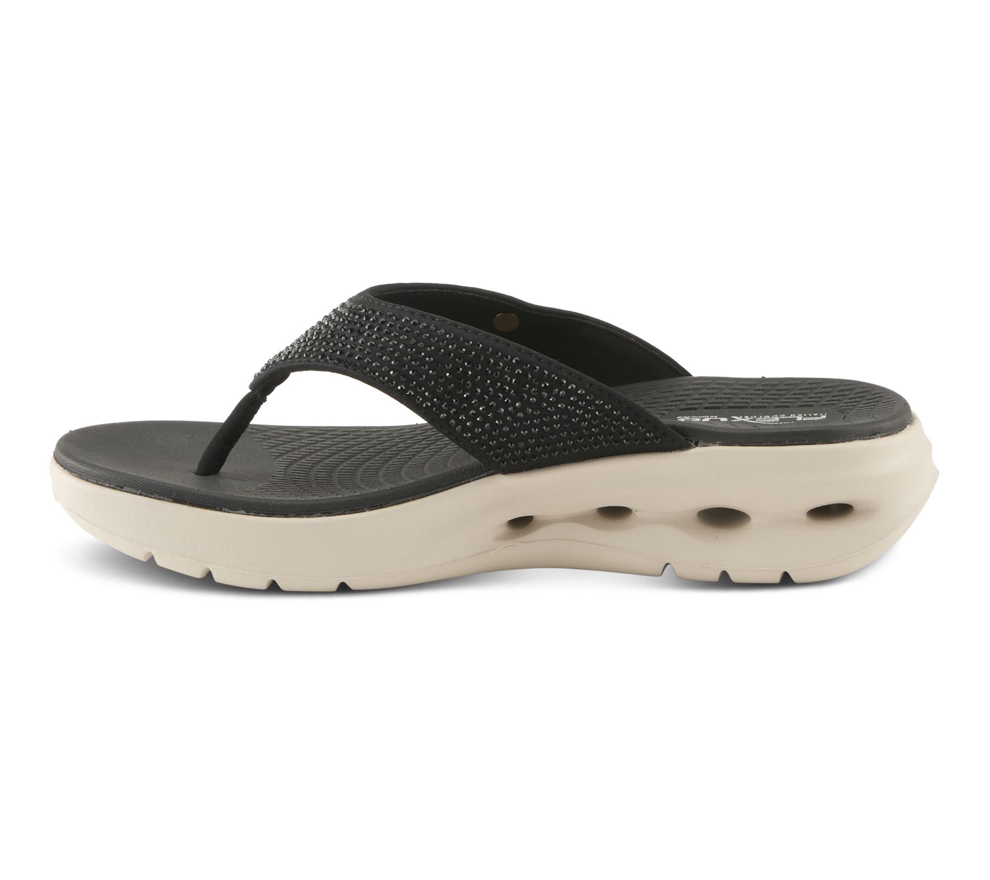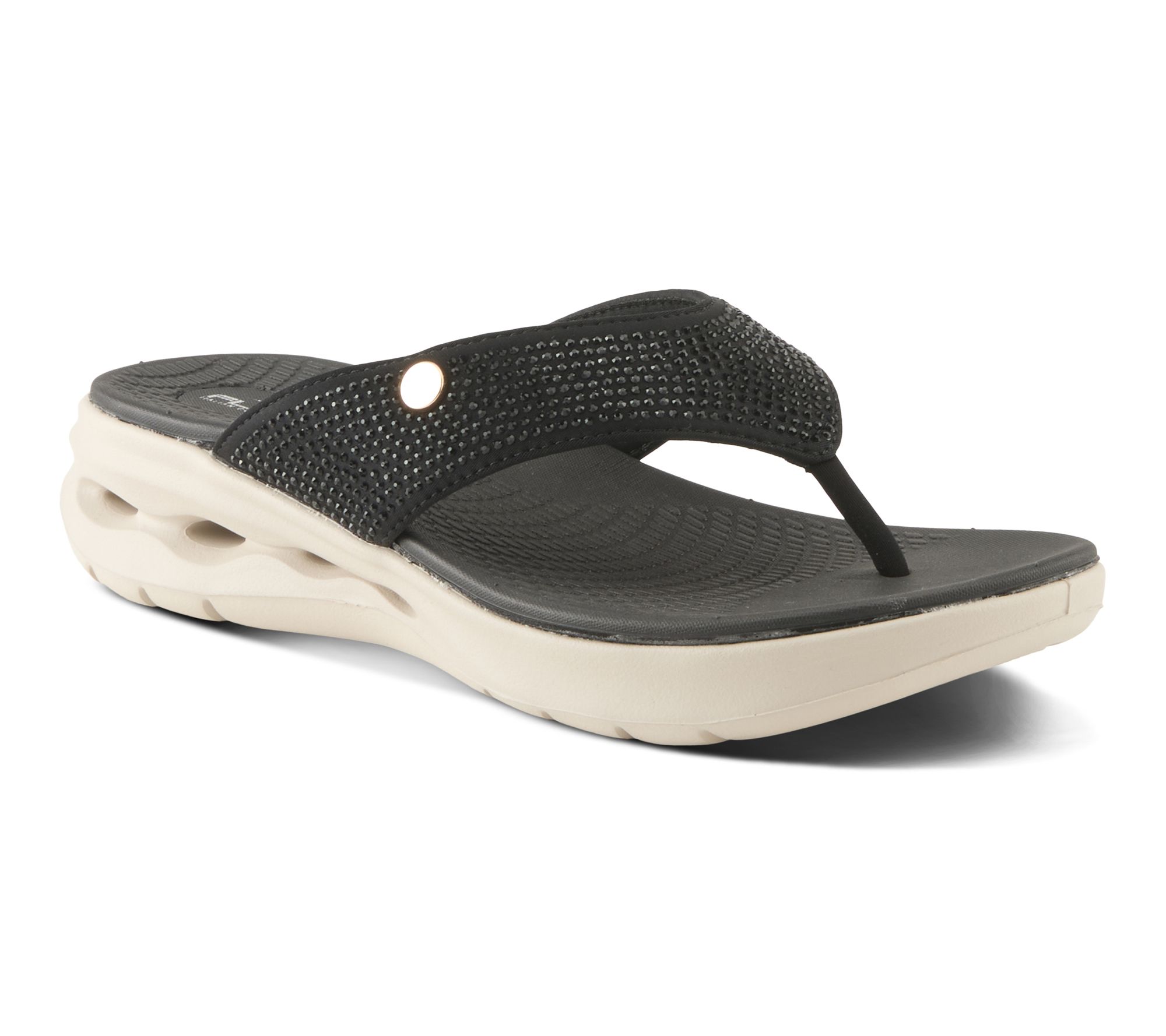 • Thong sandal design, Lycra upper with rhinestone embellishment