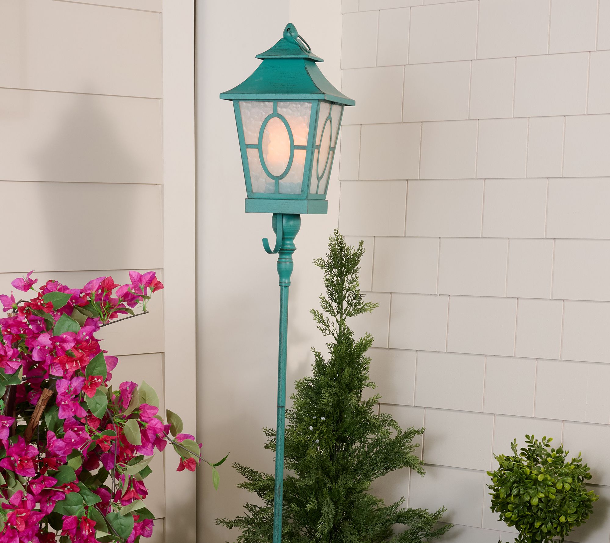 Soft flickers of light can transform any garden, walkway, or patio into an inviting retreat with this hammered glass lantern and coordinating stake. Place it among your favorite blooms or set it on a tabletop (just remove the stake!) and let the gentle glow from the flameless pillar bring ambience to every evening gathering or quiet moment outside. From the Valerie Parr Hill Collection.