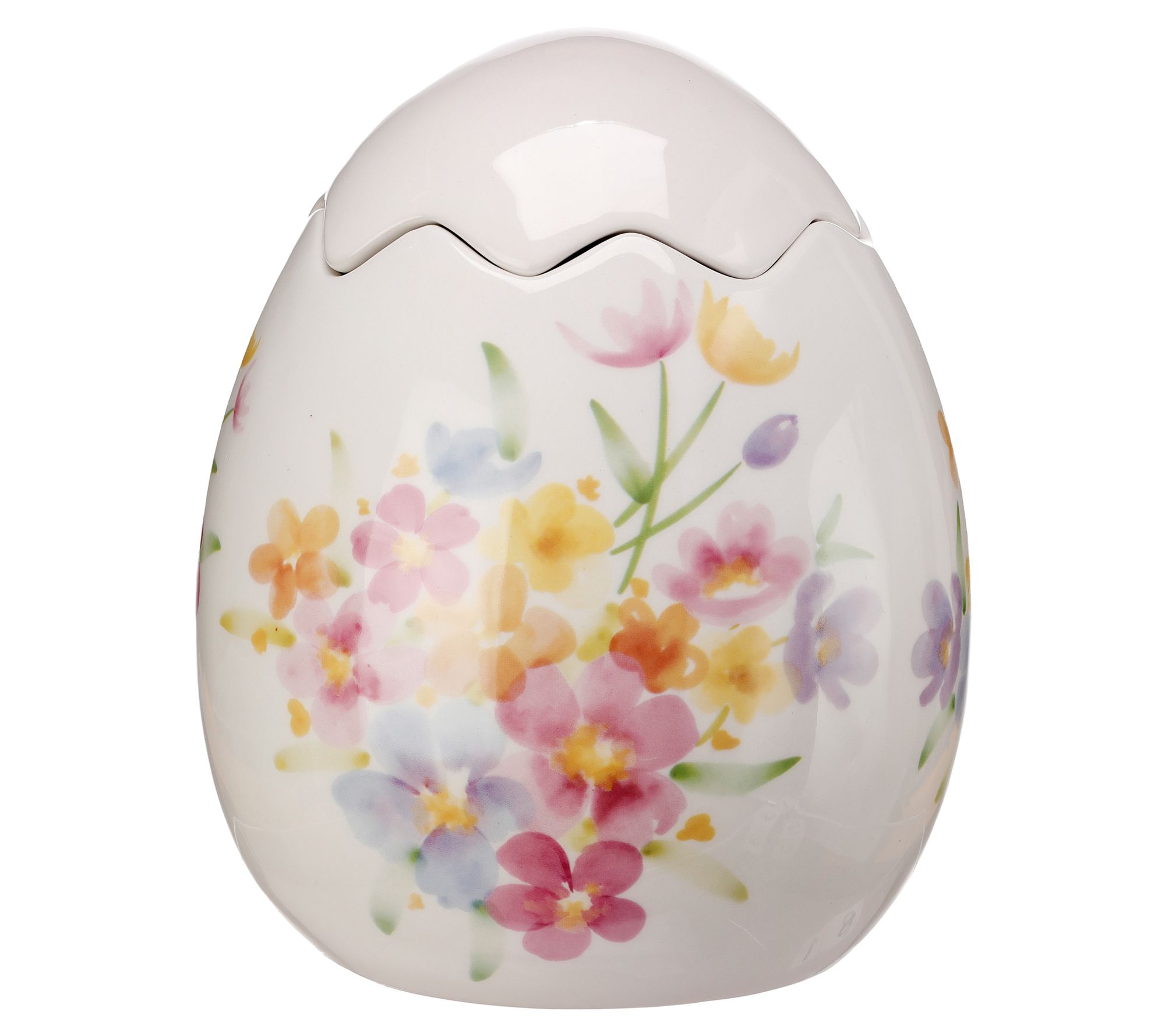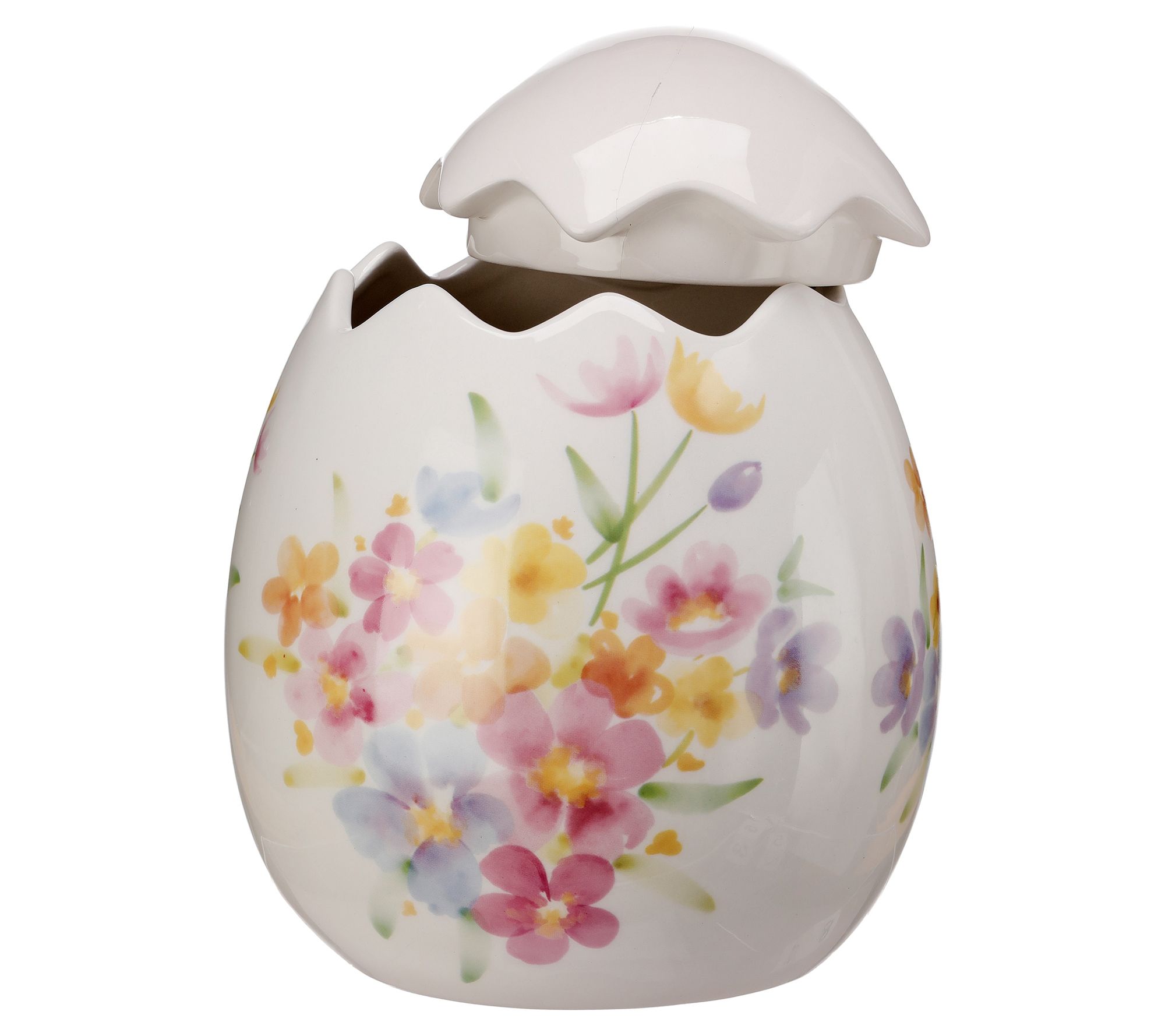Perfect for spring tulips or wildflower bouquets, this fun vase features a field of colorful blooms and a lid that resembles a cracked egg top. From the Valerie Parr Hill Collection.