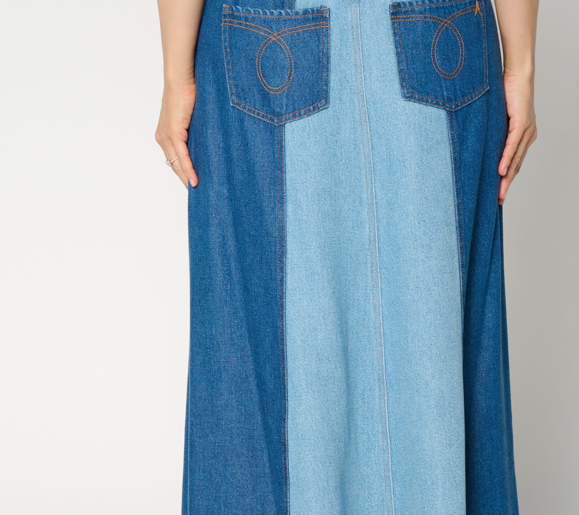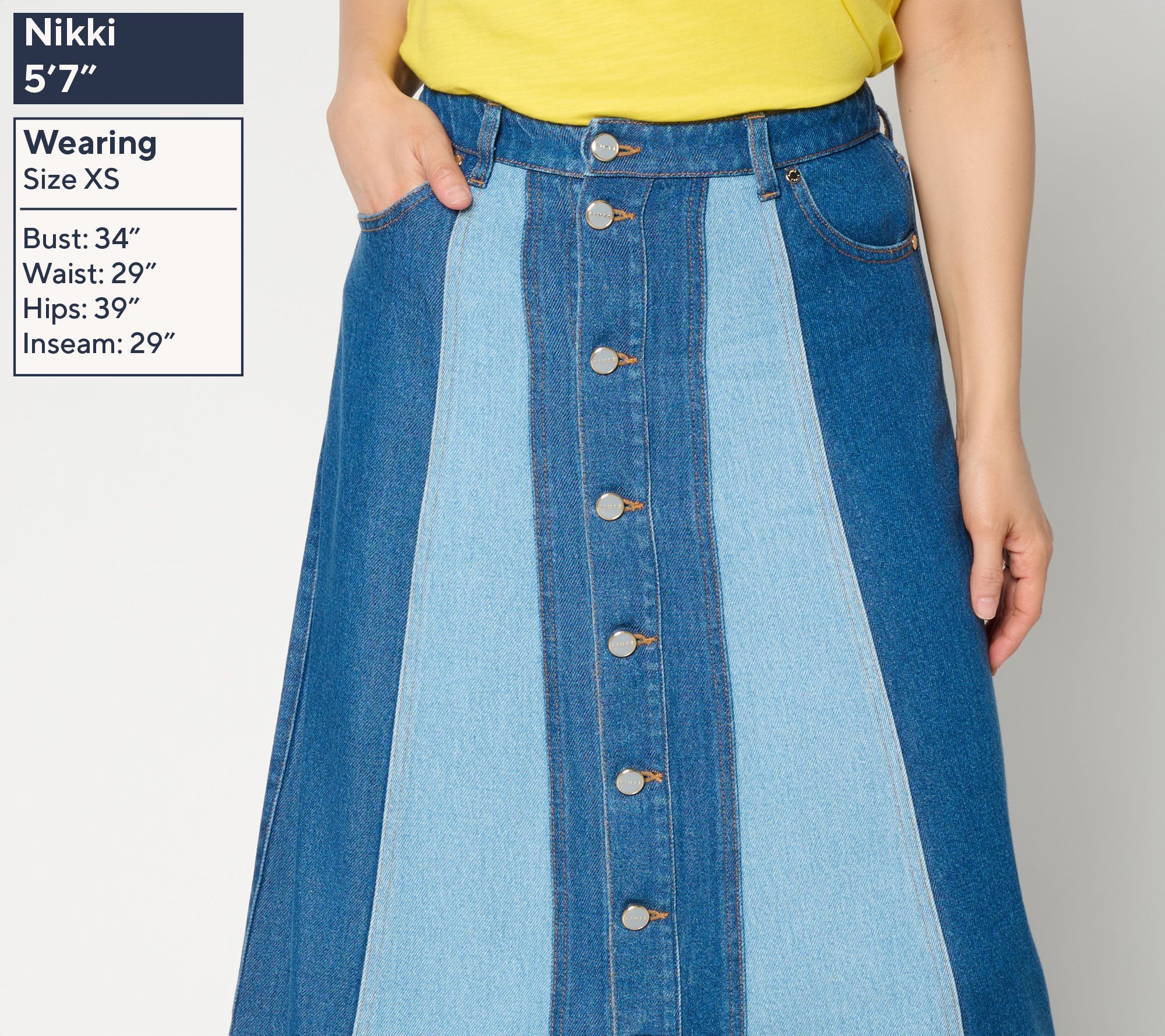 Everyday errands and weekend brunches get an instant upgrade with this A-line denim skirt. The woven fabrication and multi-paneled design create a flattering silhouette, while the multi-button front placket and five-pocket style add classic charm. From Aimee Kestenberg.