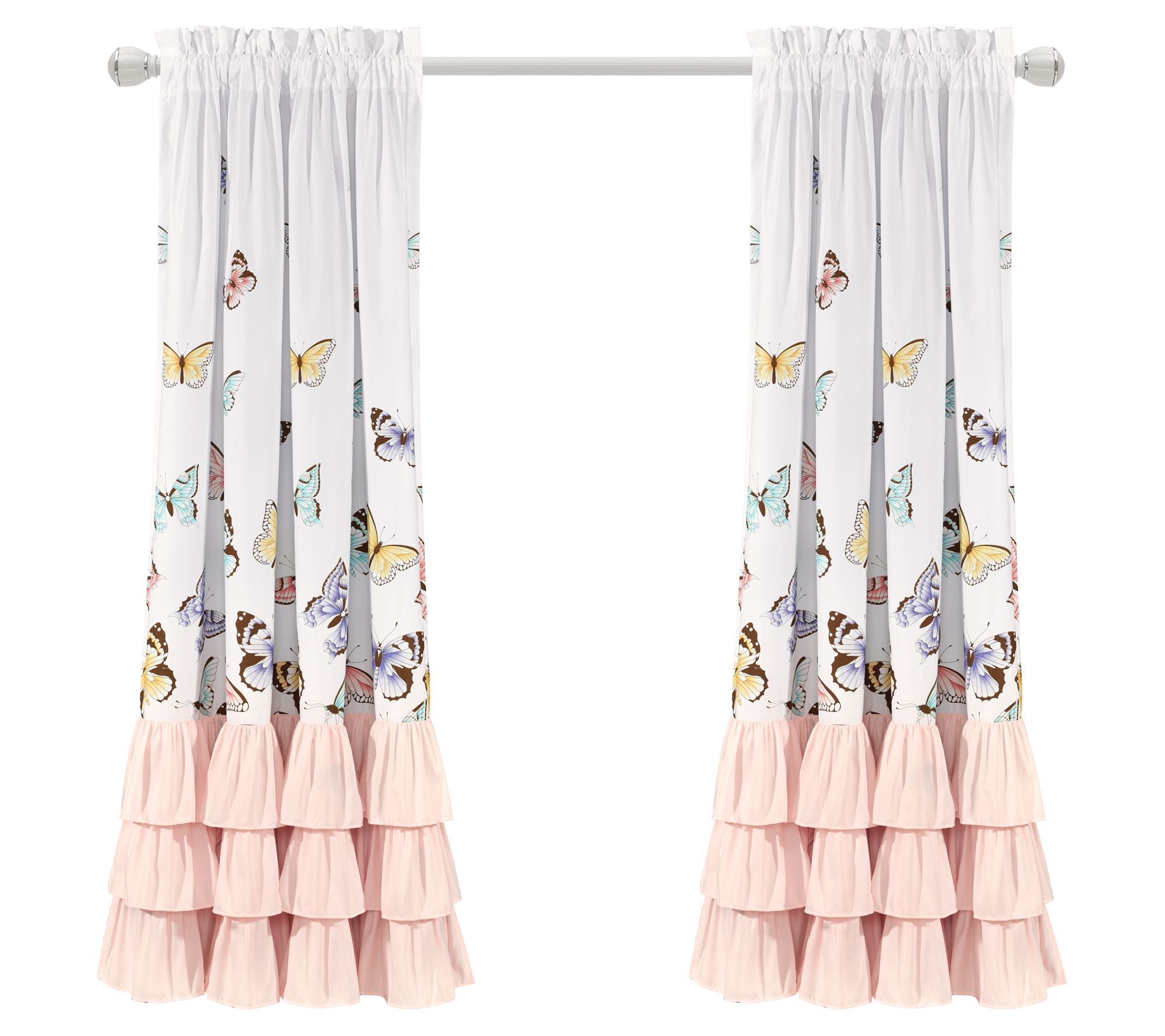 Combining the serene beauty of butterflies and the vintage charm of ruffles, these Flutter Butterfly window panels add the finishing touch to any room. Each panel is thoughtfully designed with a deep rod pocket to make installation simple. From Lush Decor.