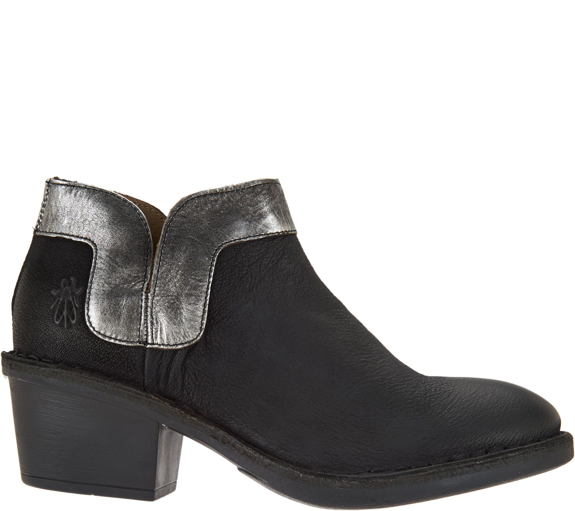 Opt in. Every shoe wardrobe needs a few options--like these cute leather ankle boots by FLY London. A slightly shorter shaft with slit side details, chunky heel, and back zipper lend a distinctive look. The round toe gives the top of your foot room to breathe. From FLY London.