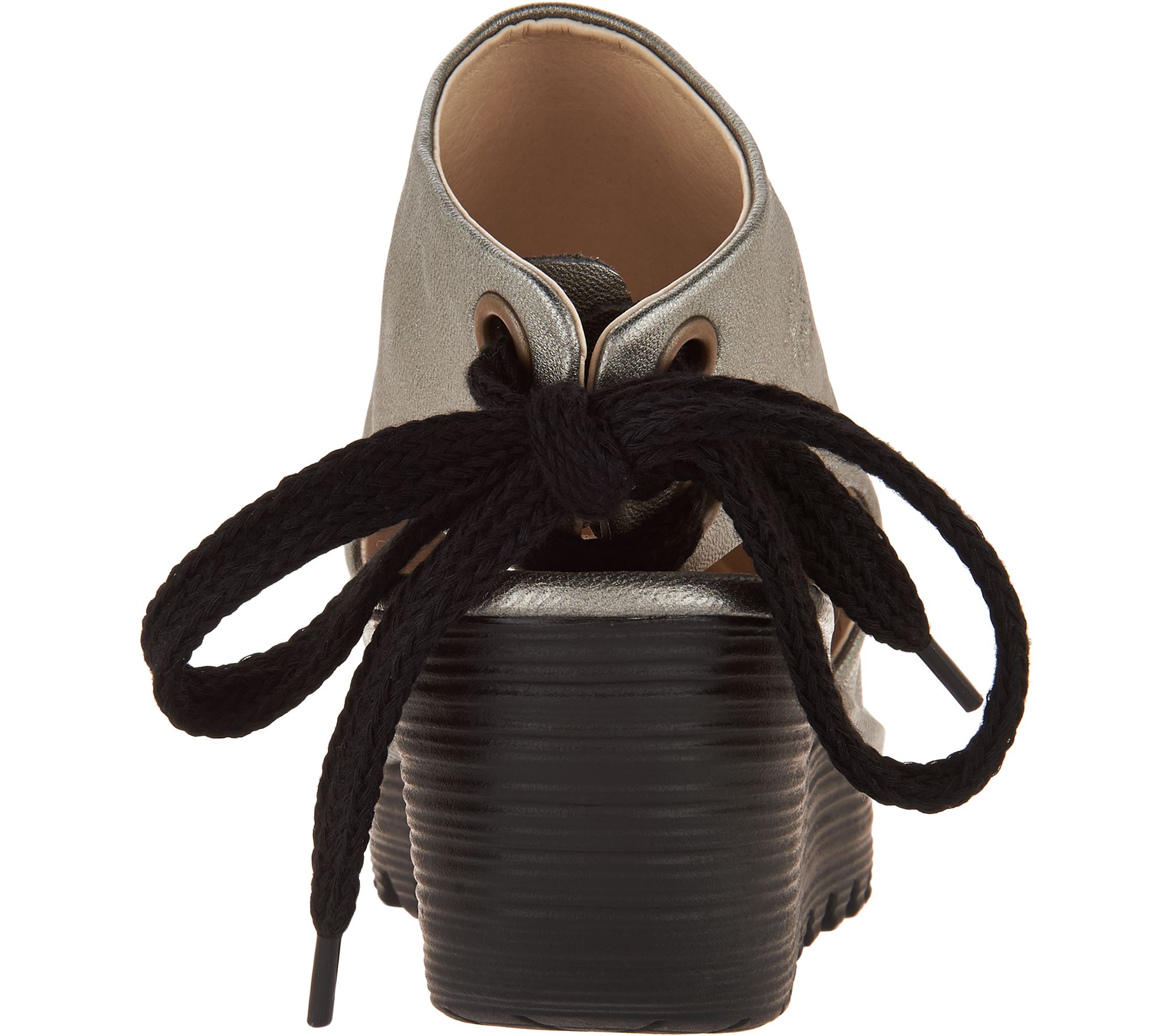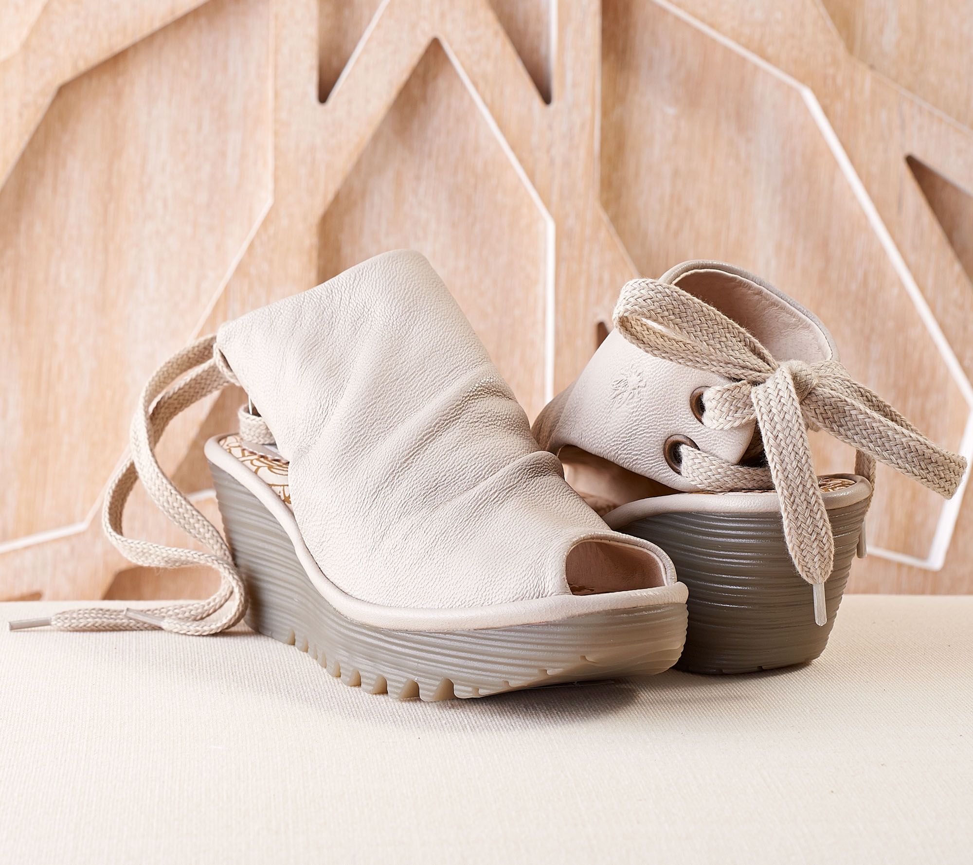 Stylish from front to back--these leather wedges will be noticed coming and going to any event. From FLY London.